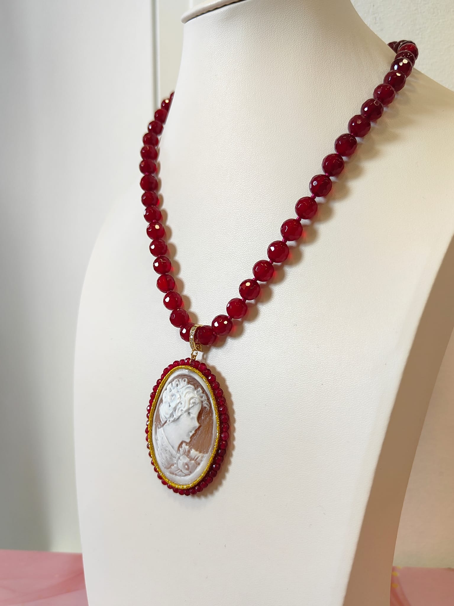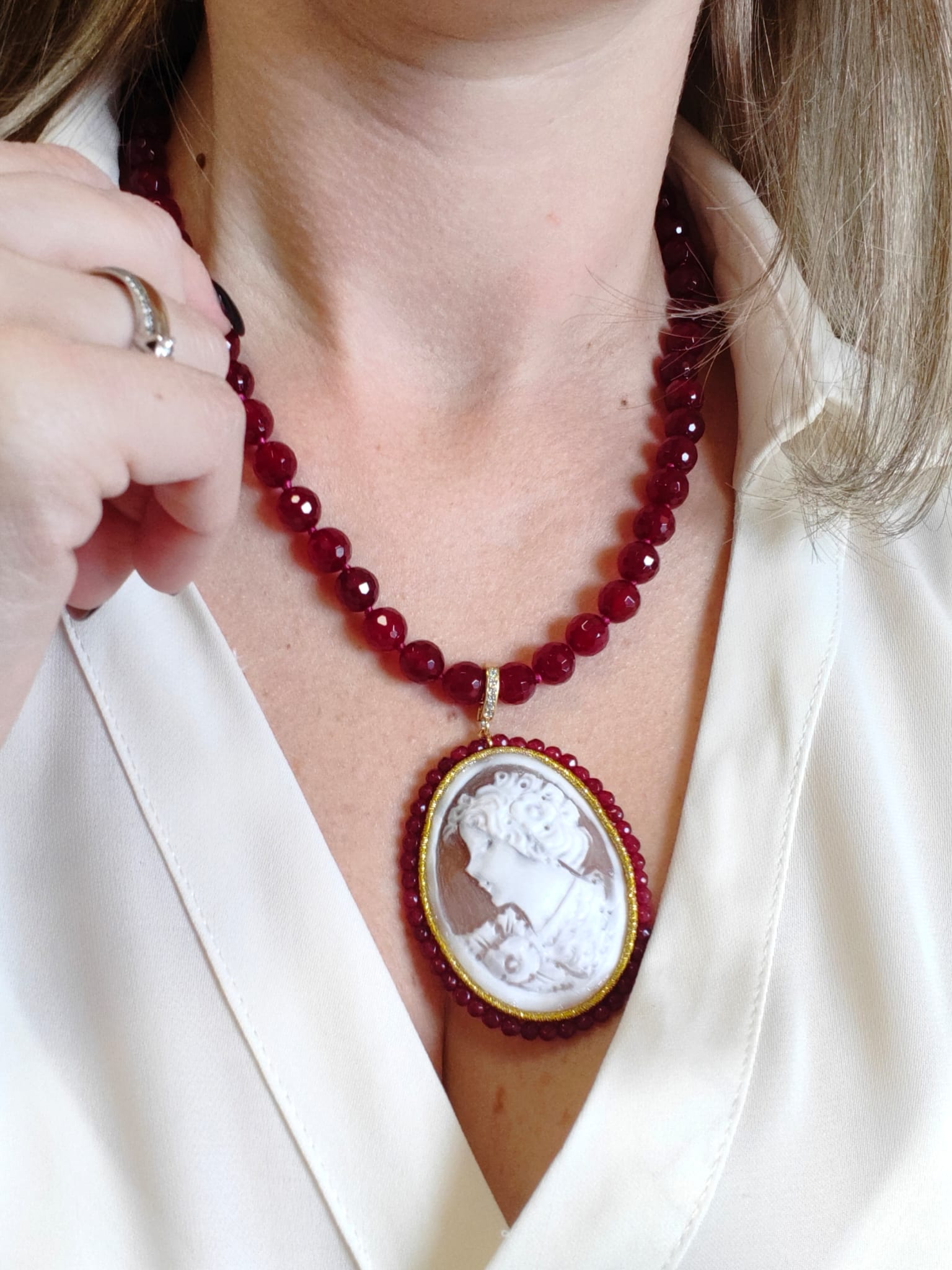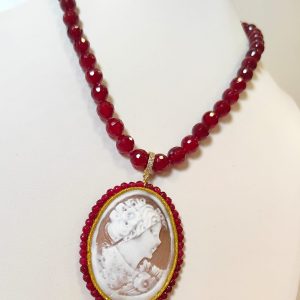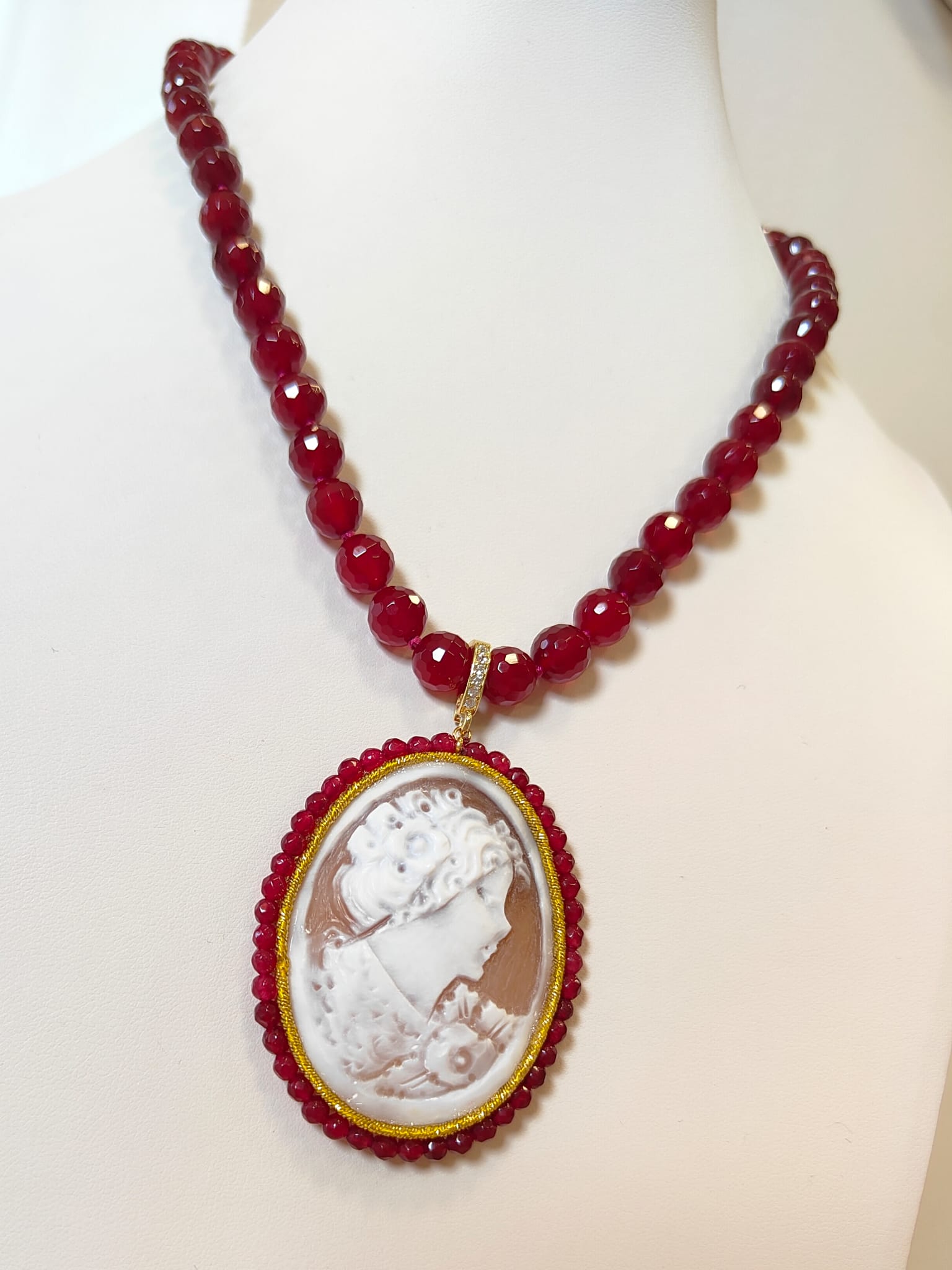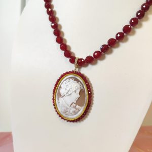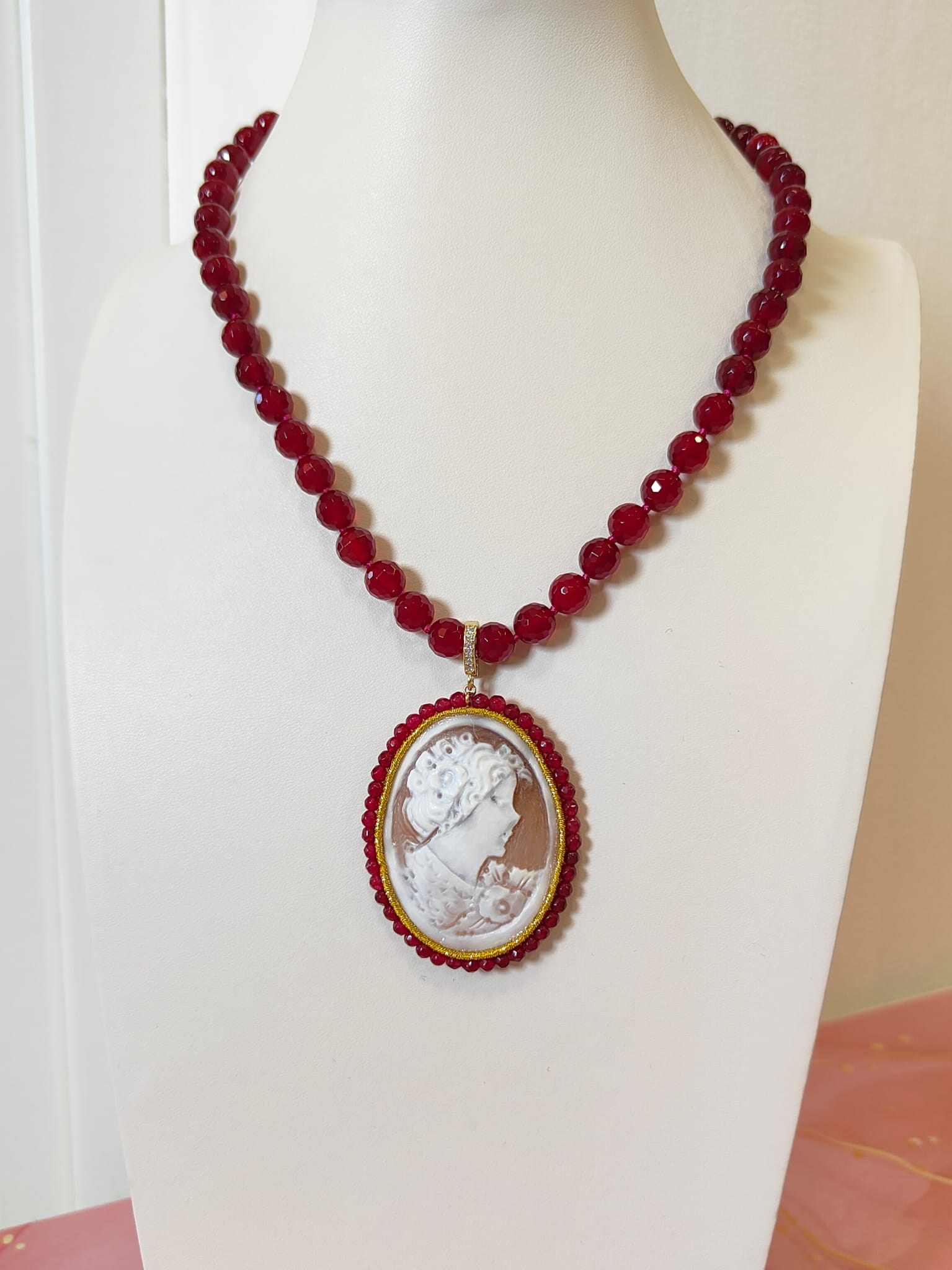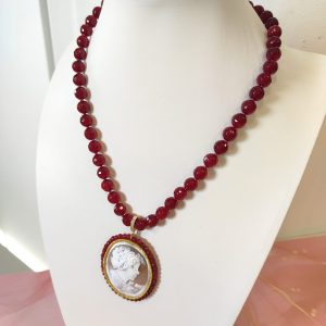 Elegante collana cammeo borgogna in agata annodata a mano, con pendente in cammeo sardonico inciso e chiusura in argento 925 placcato oro.