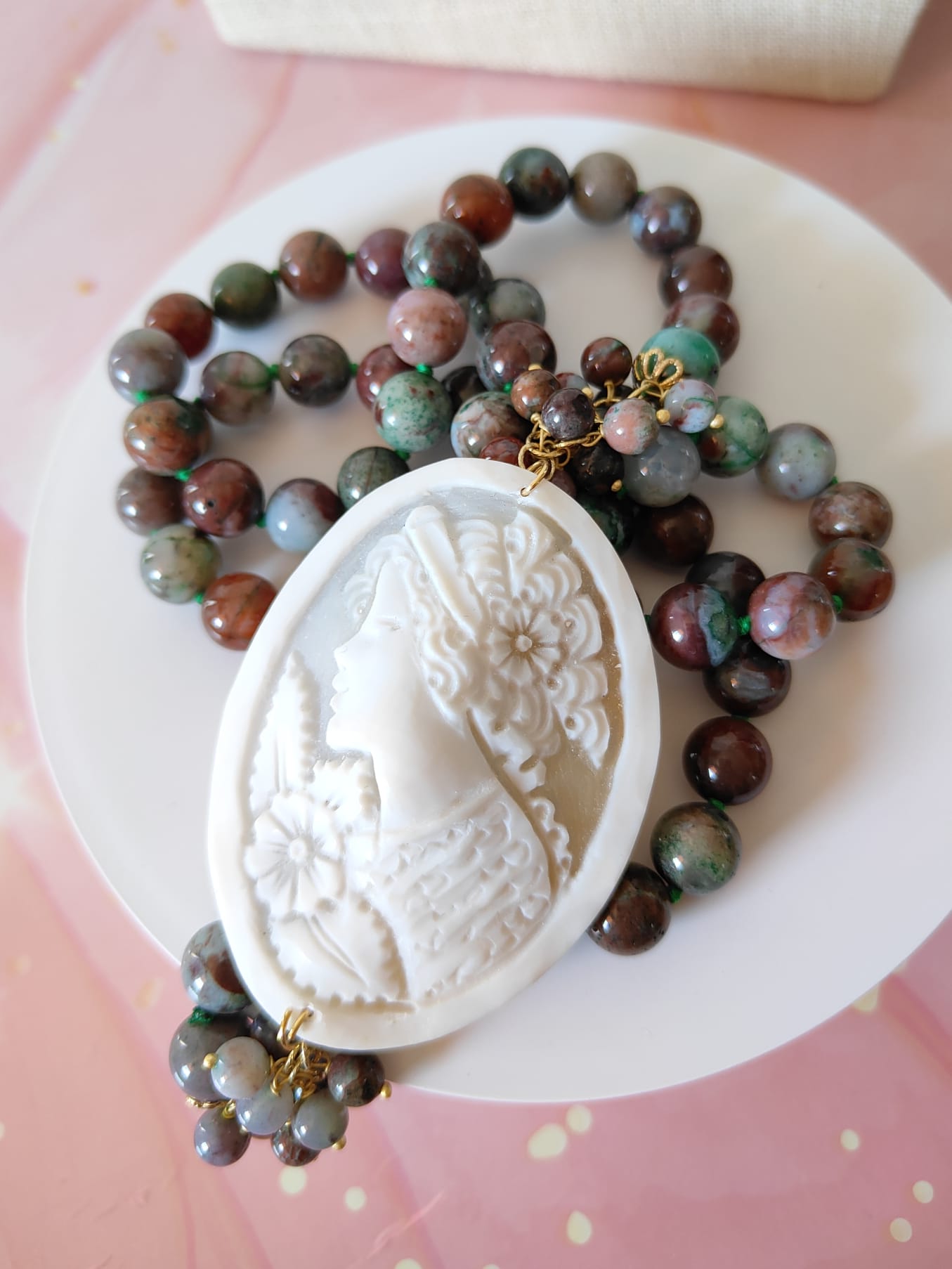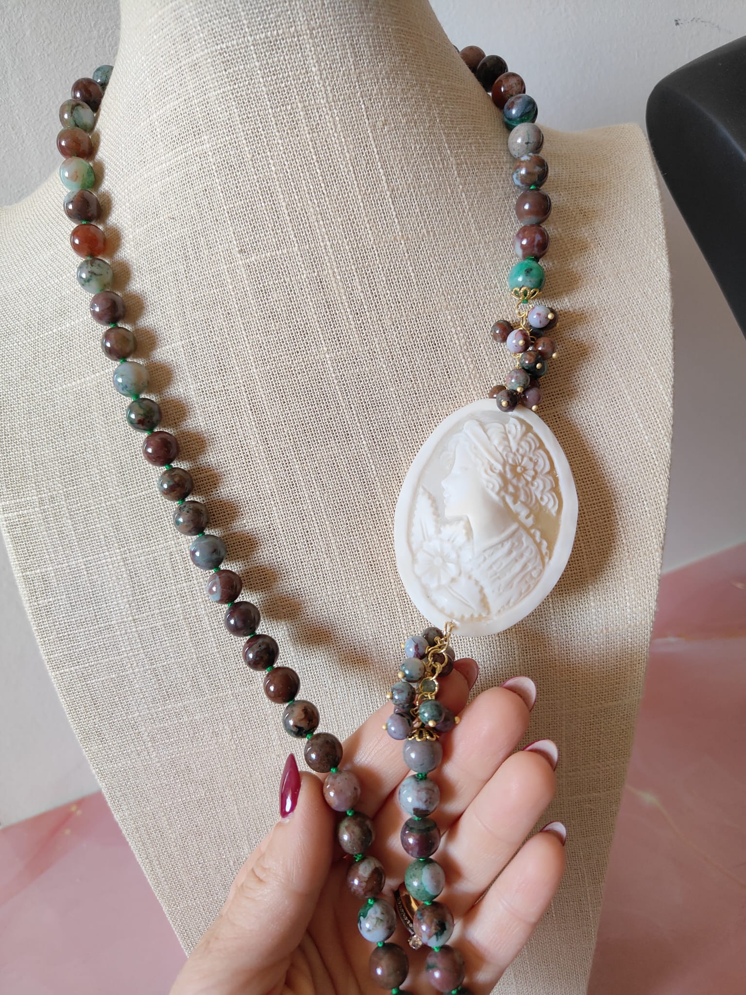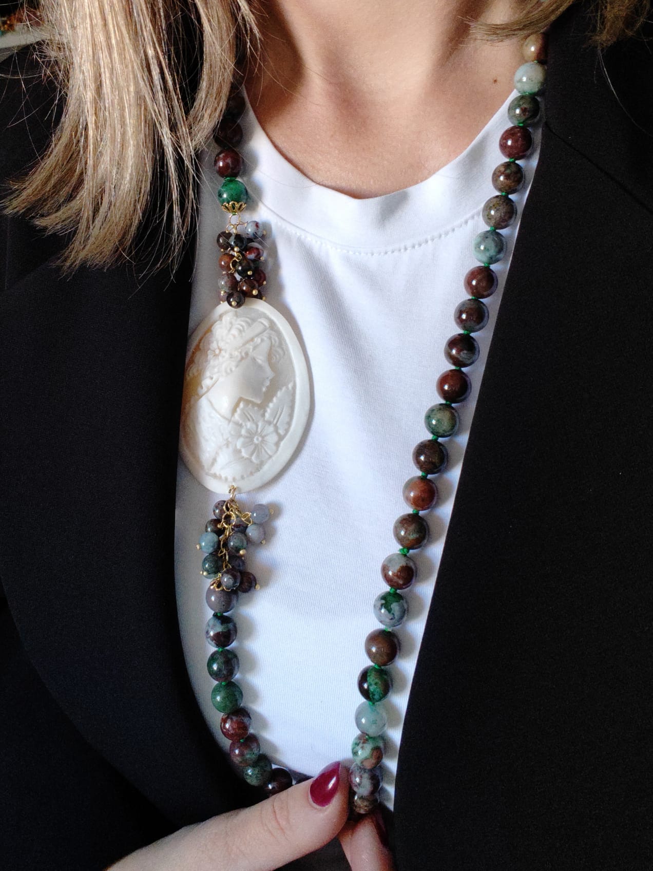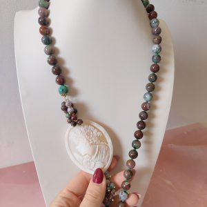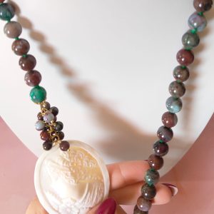 Le sfere di diaspro africano, levigate e annodate singolarmente, rivelano un mosaico di colori naturali: verde intenso, borgogna, grigio e cenni di azzurro. Ogni pietra è unica, proprio come la donna che sceglie di indossarla. Il diaspro, considerato una pietra di equilibrio e protezione, conferisce energia e stabilità, mentre la sua combinazione con il cammeo crea un contrasto armonioso e sofisticato.