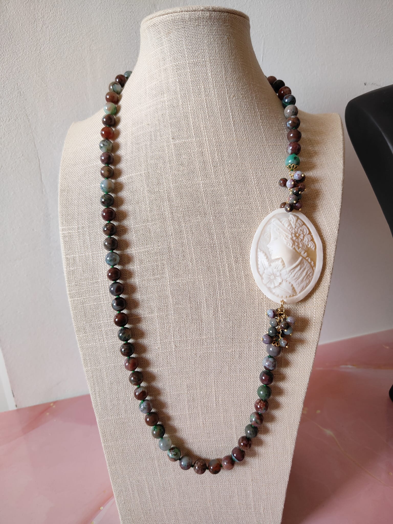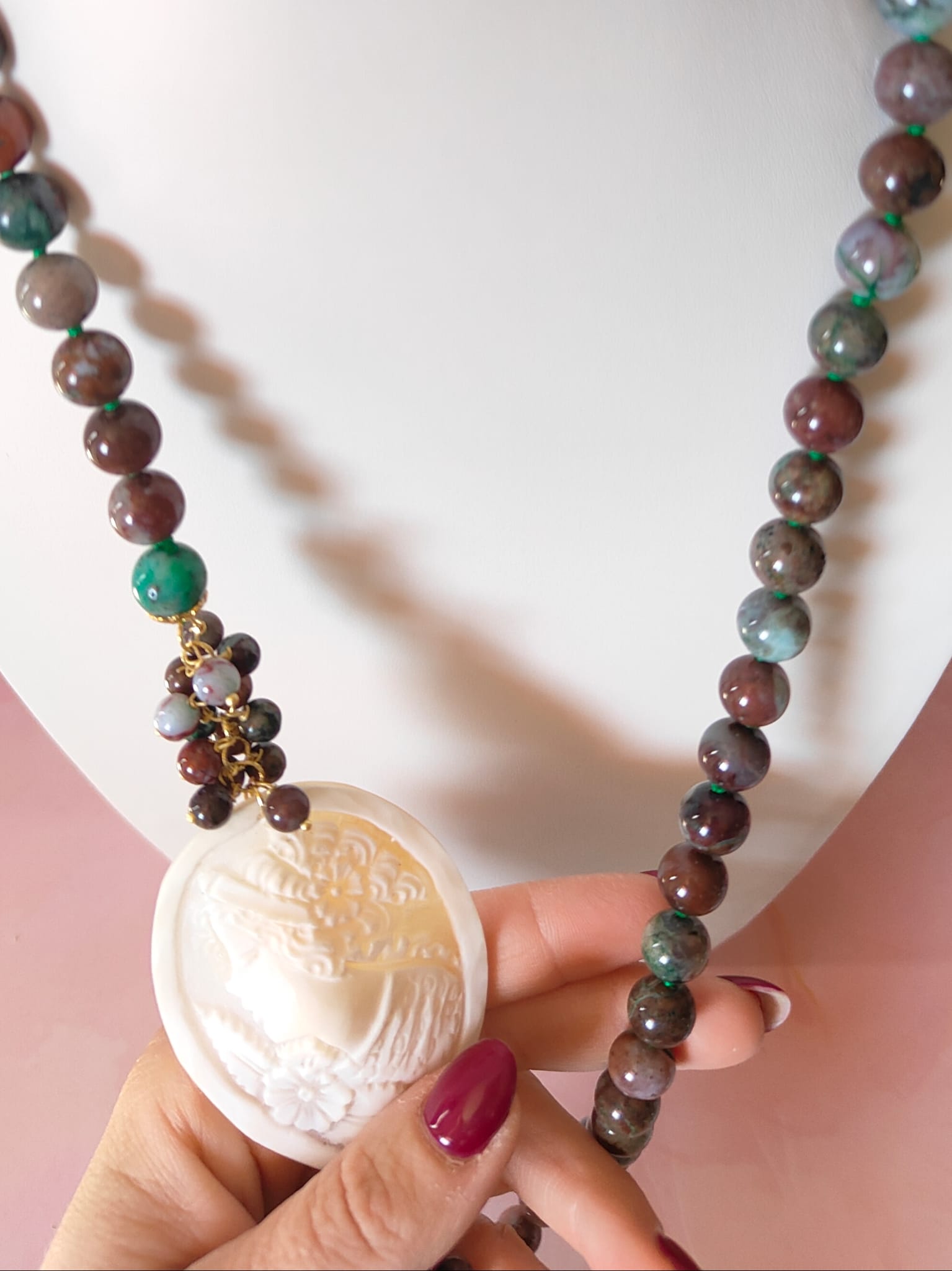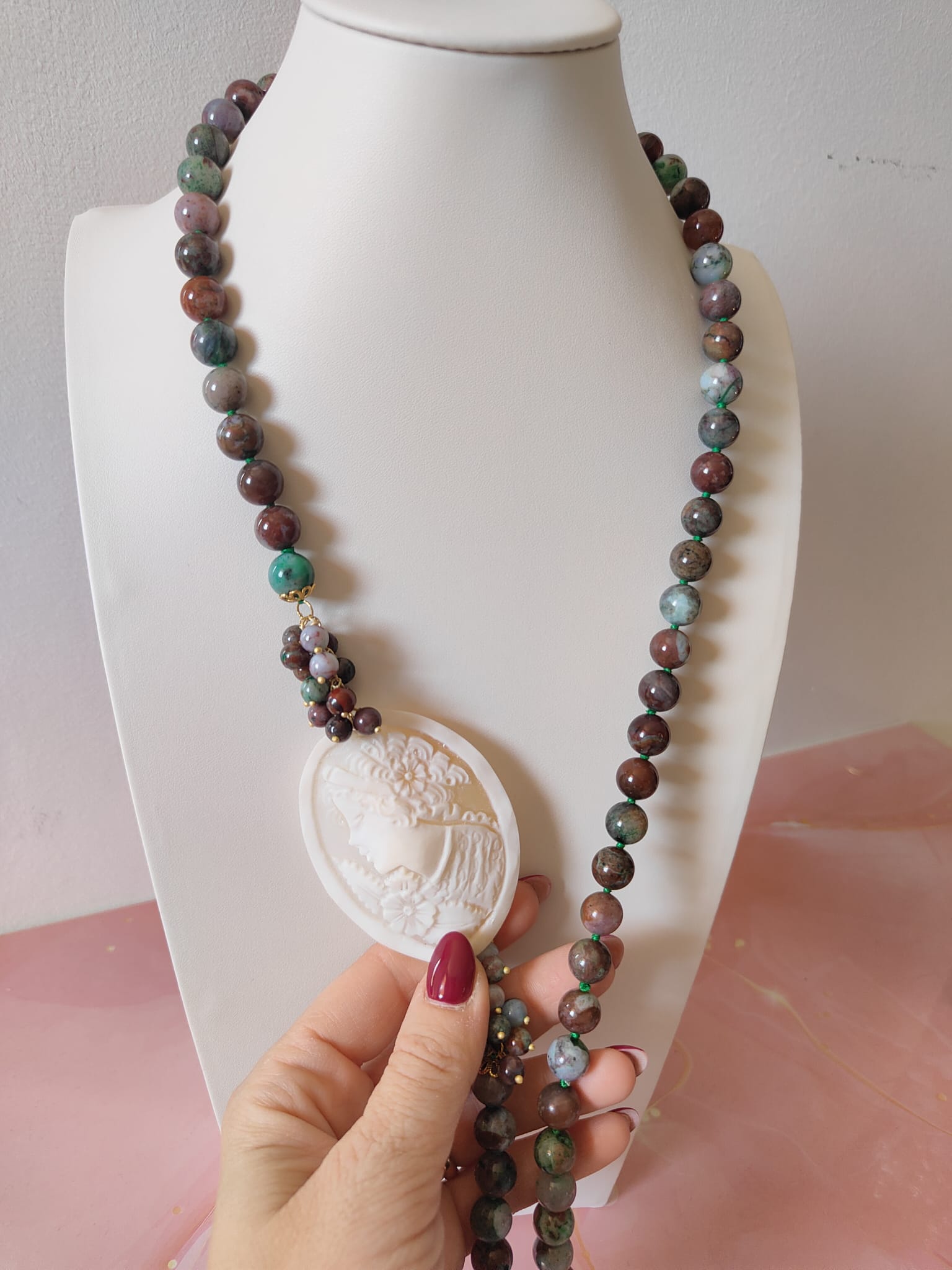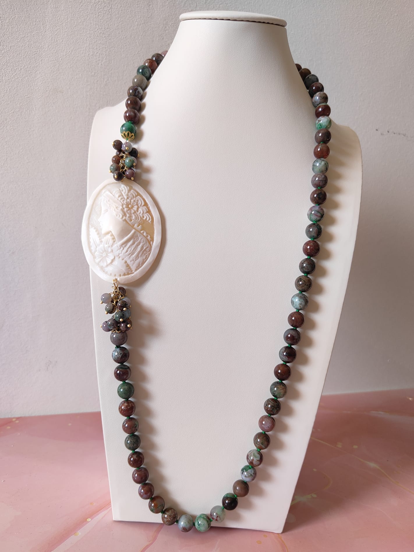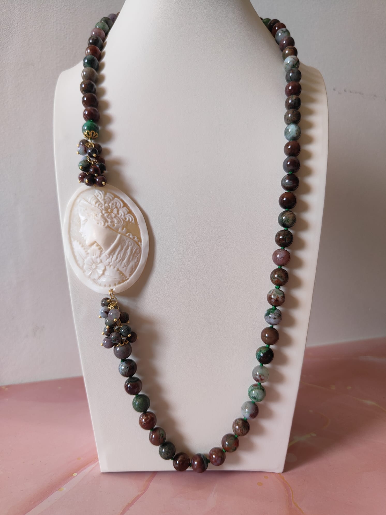 Tecnica: incisione artigianale del cammeo, annodatura manuale tra ogni pietra.
