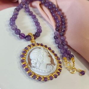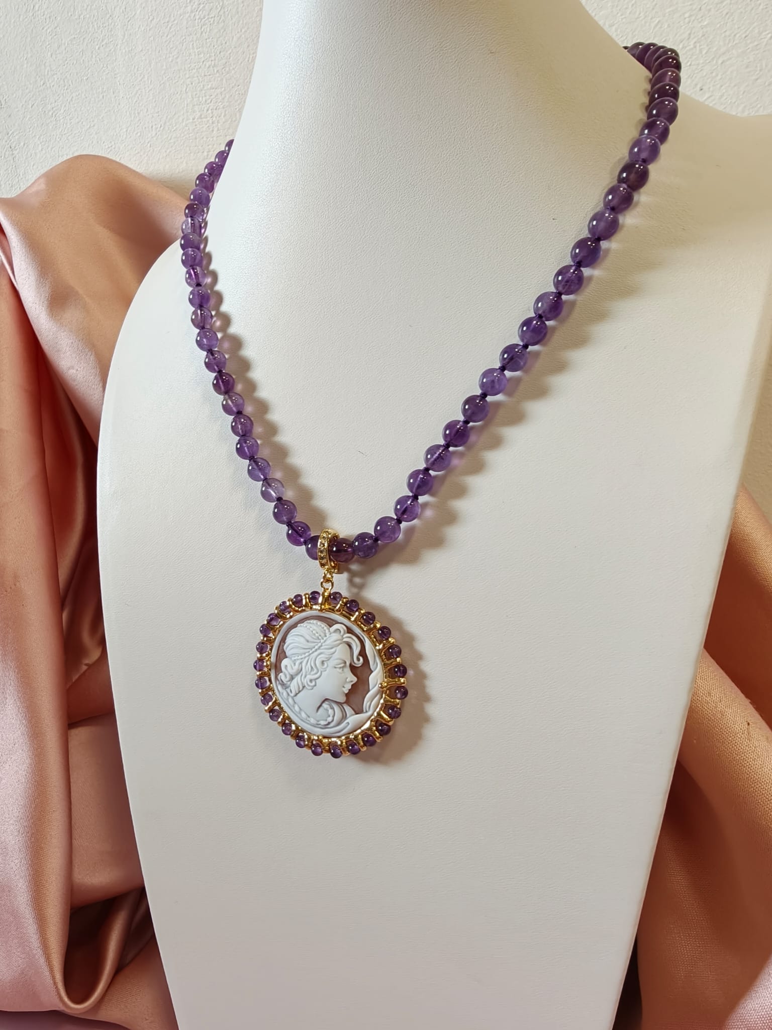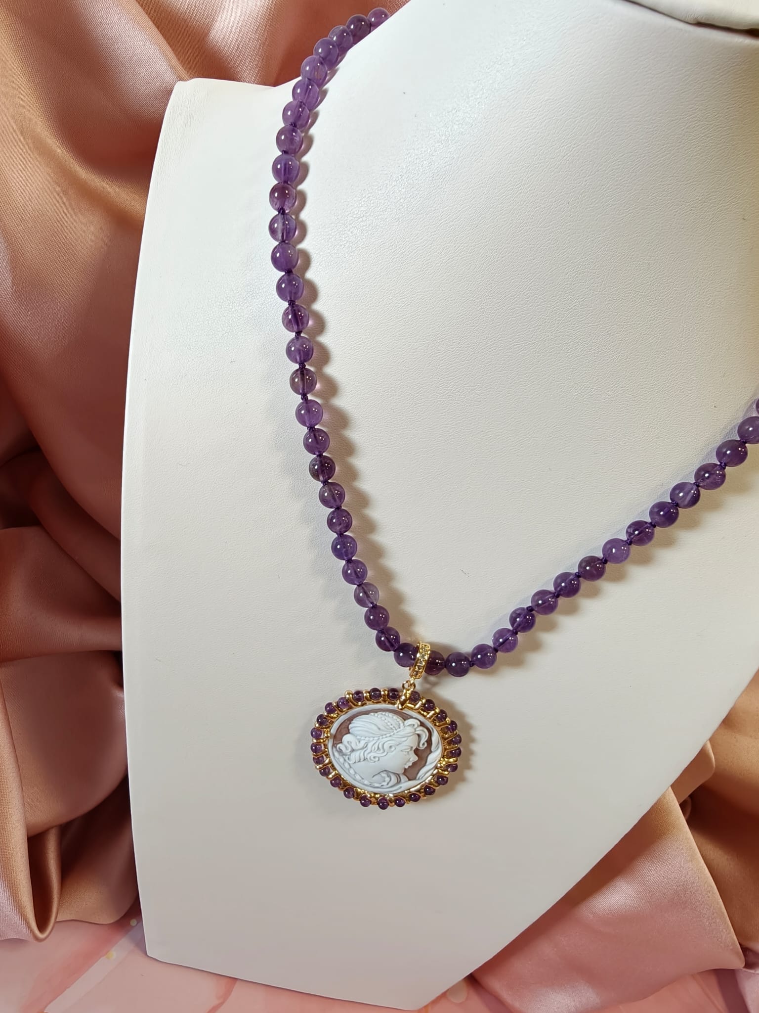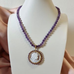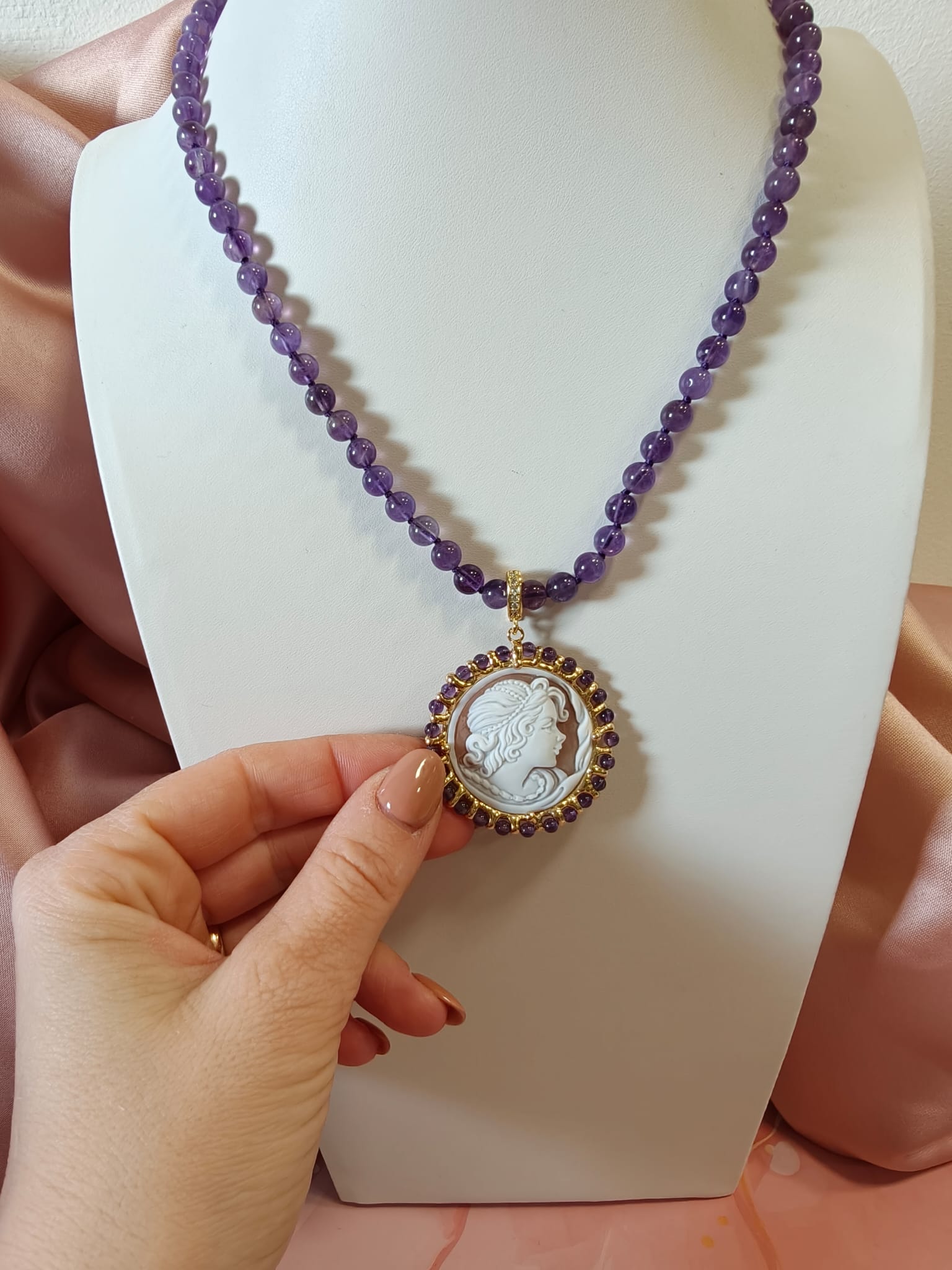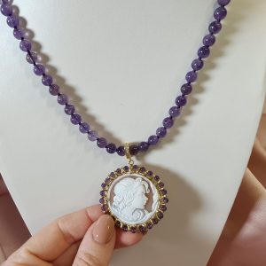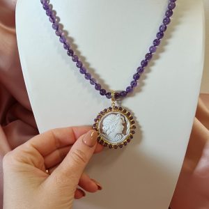 Il cuore della collana è il magnifico ciondolo con cammeo inciso a mano, un’opera d’arte in miniatura che richiama l’eleganza dei gioielli d’altri tempi. Il cammeo è incorniciato da un delicato giro di ametiste e montato su una struttura in argento 925 placcato oro, che ne esalta ulteriormente la raffinatezza.