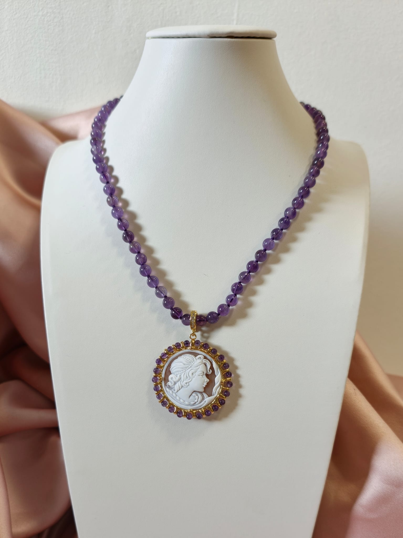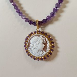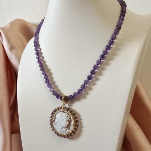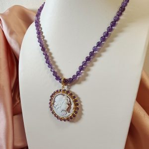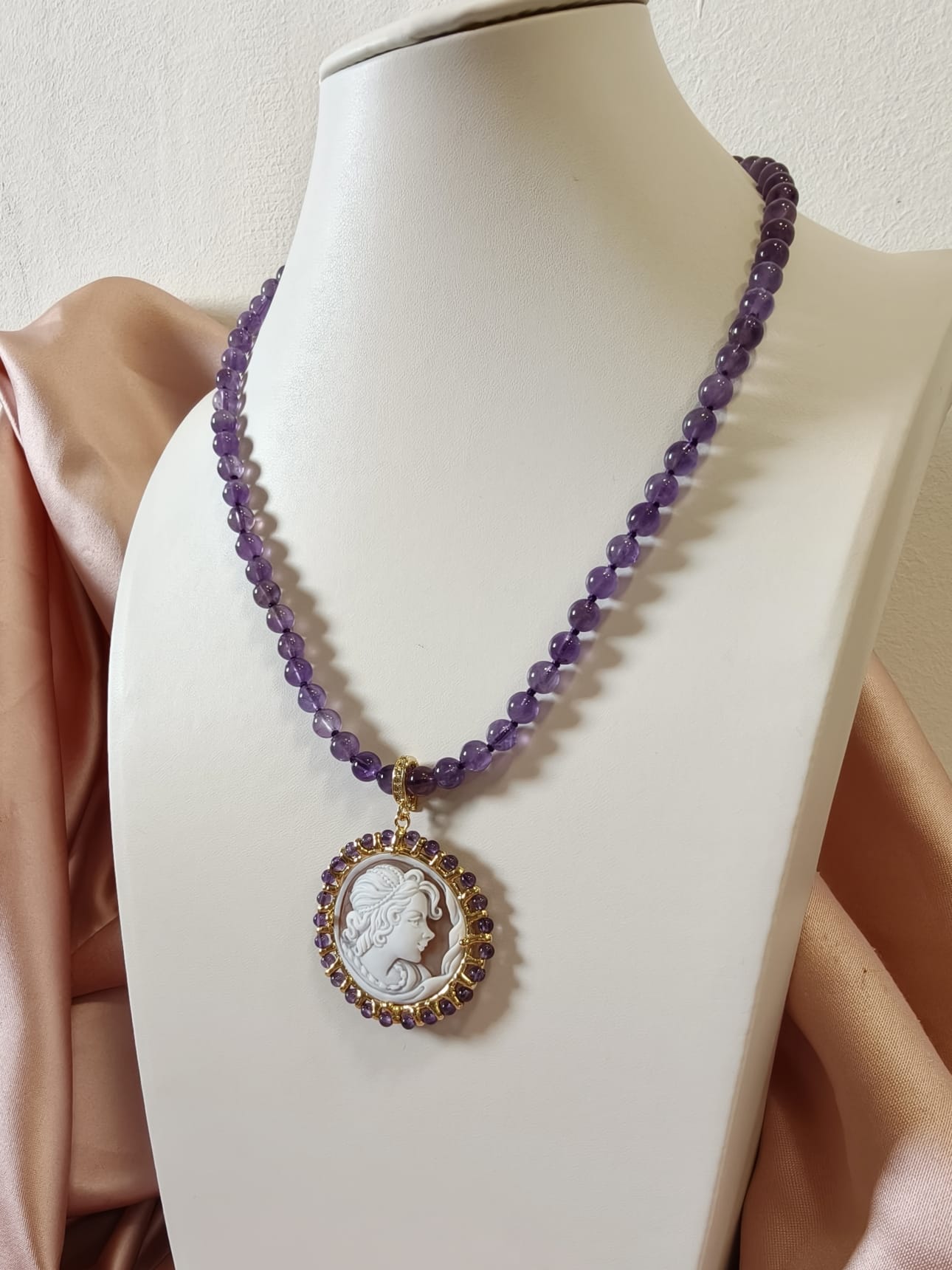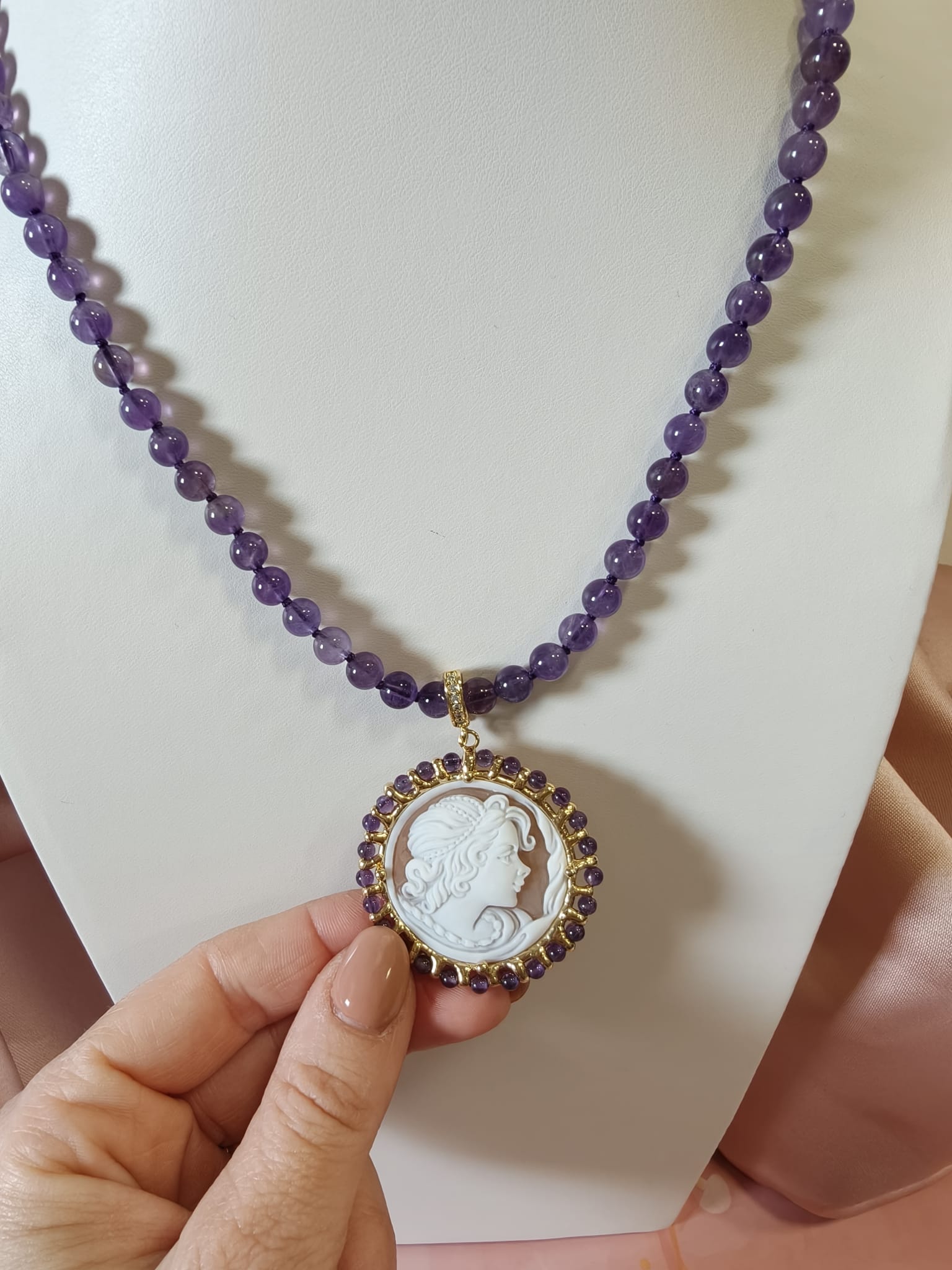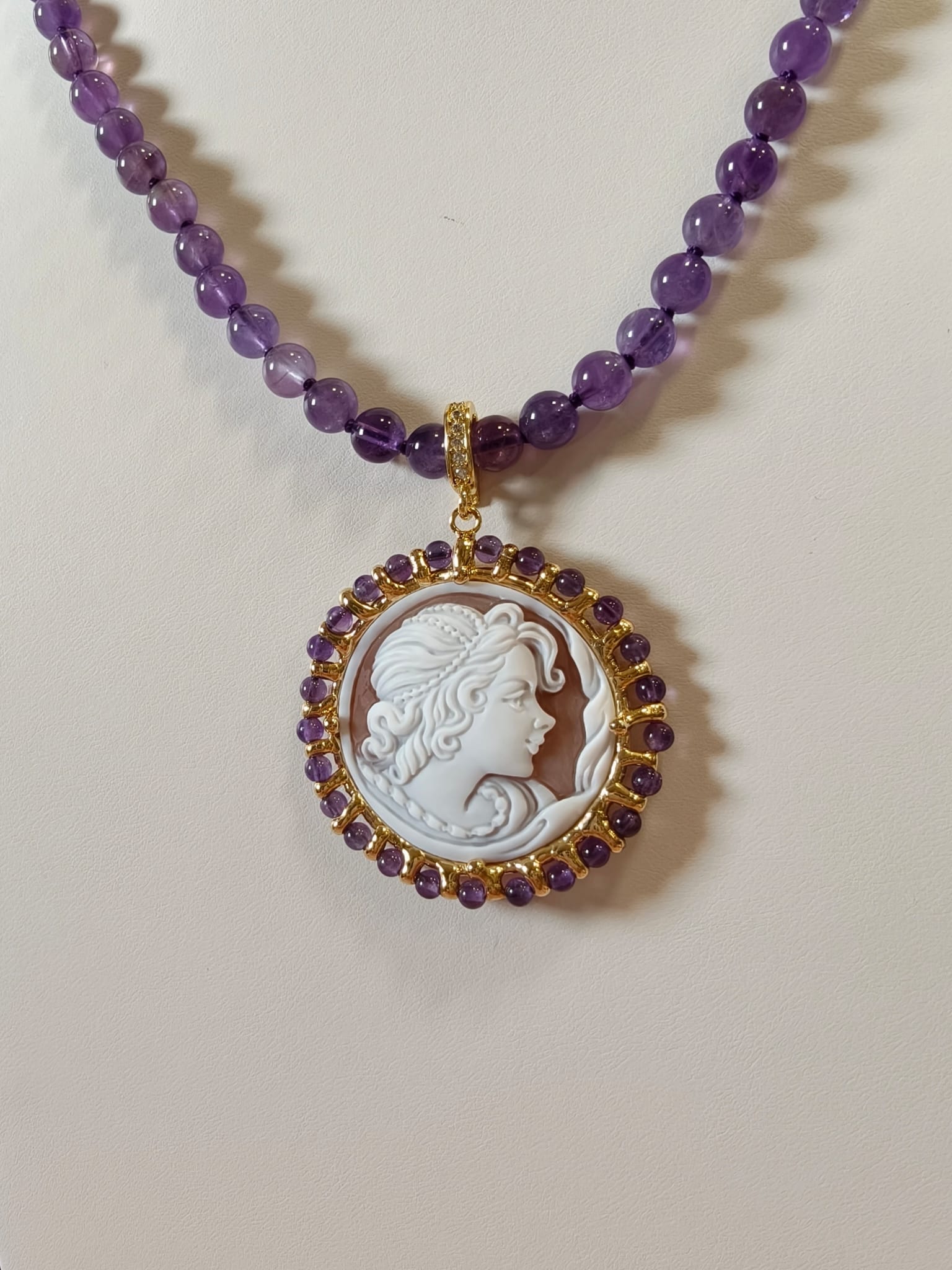 Il cuore della collana è il magnifico ciondolo con cammeo inciso a mano, un’opera d’arte in miniatura che richiama l’eleganza dei gioielli d’altri tempi. Il cammeo è incorniciato da un delicato giro di ametiste e montato su una struttura in argento 925 placcato oro, che ne esalta ulteriormente la raffinatezza.
