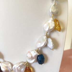 Accanto alle perle sono inserite pietre naturali di ambra baltica e apatite. L’ambra, con le sue tonalità calde e dorate, aggiunge profondità e richiama una bellezza antica. L’apatite, invece, introduce un contrasto cromatico deciso grazie ai toni blu-verdi. Questa alternanza crea un gioiello bilanciato e ricco di personalità.