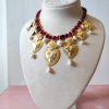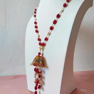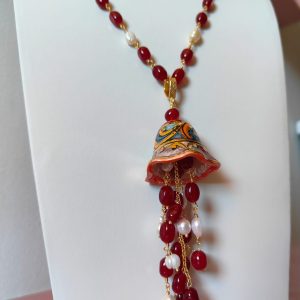 Il ciondolo, lungo circa 10 cm, è arricchito da un morbido e scenografico intreccio di elementi pendenti: agata rossa dalla tonalità intensa e profonda, e perle naturali d’acqua dolce, luminose e irregolari, che aggiungono movimento e una raffinata eleganza organica. Ogni pietra è montata su minuteria dorata che impreziosisce la composizione e ne esalta la palette cromatica.