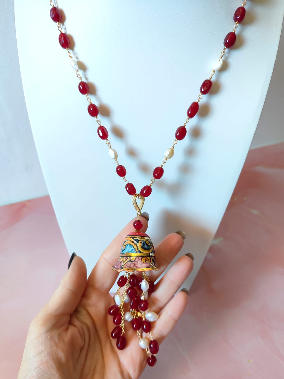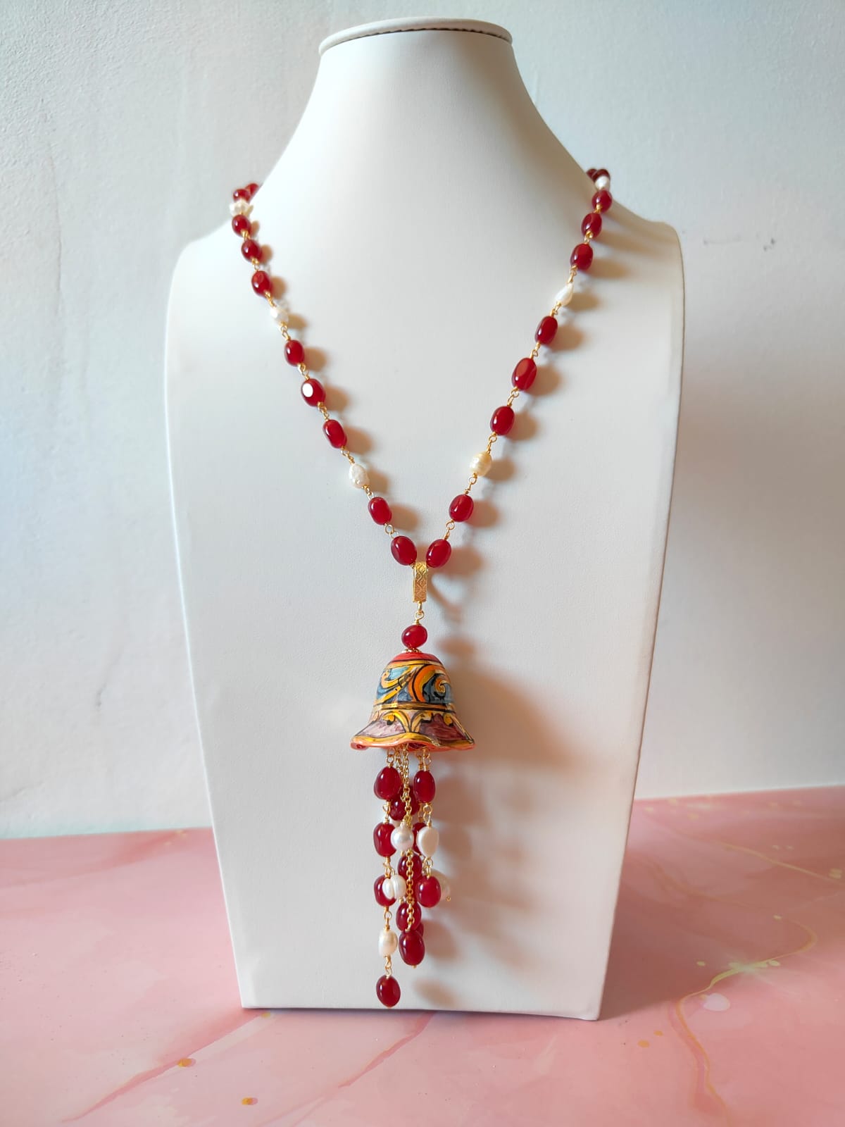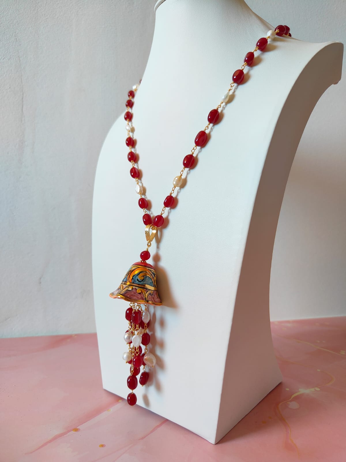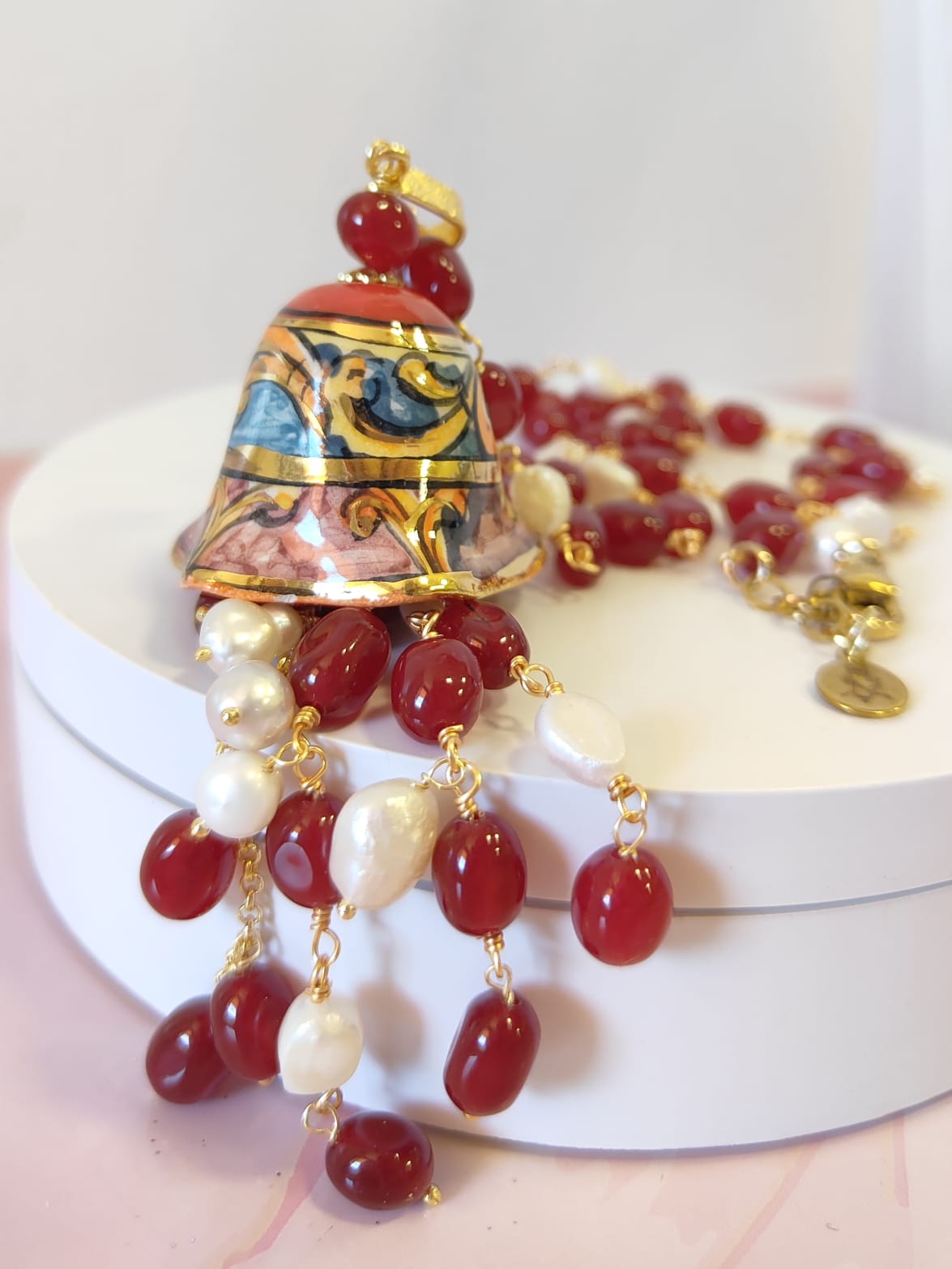 Questa creazione è un pezzo unico: nessun altro esemplare identico esiste, perché ogni campanella è dipinta completamente a mano e ogni perla naturale porta con sé la propria unicità. Indossarla significa scegliere un gioiello con anima, carattere e un richiamo forte alle tradizioni artigianali della Sicilia.