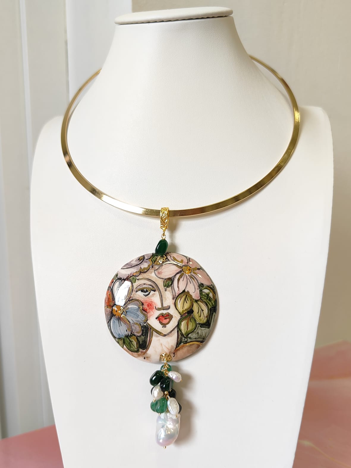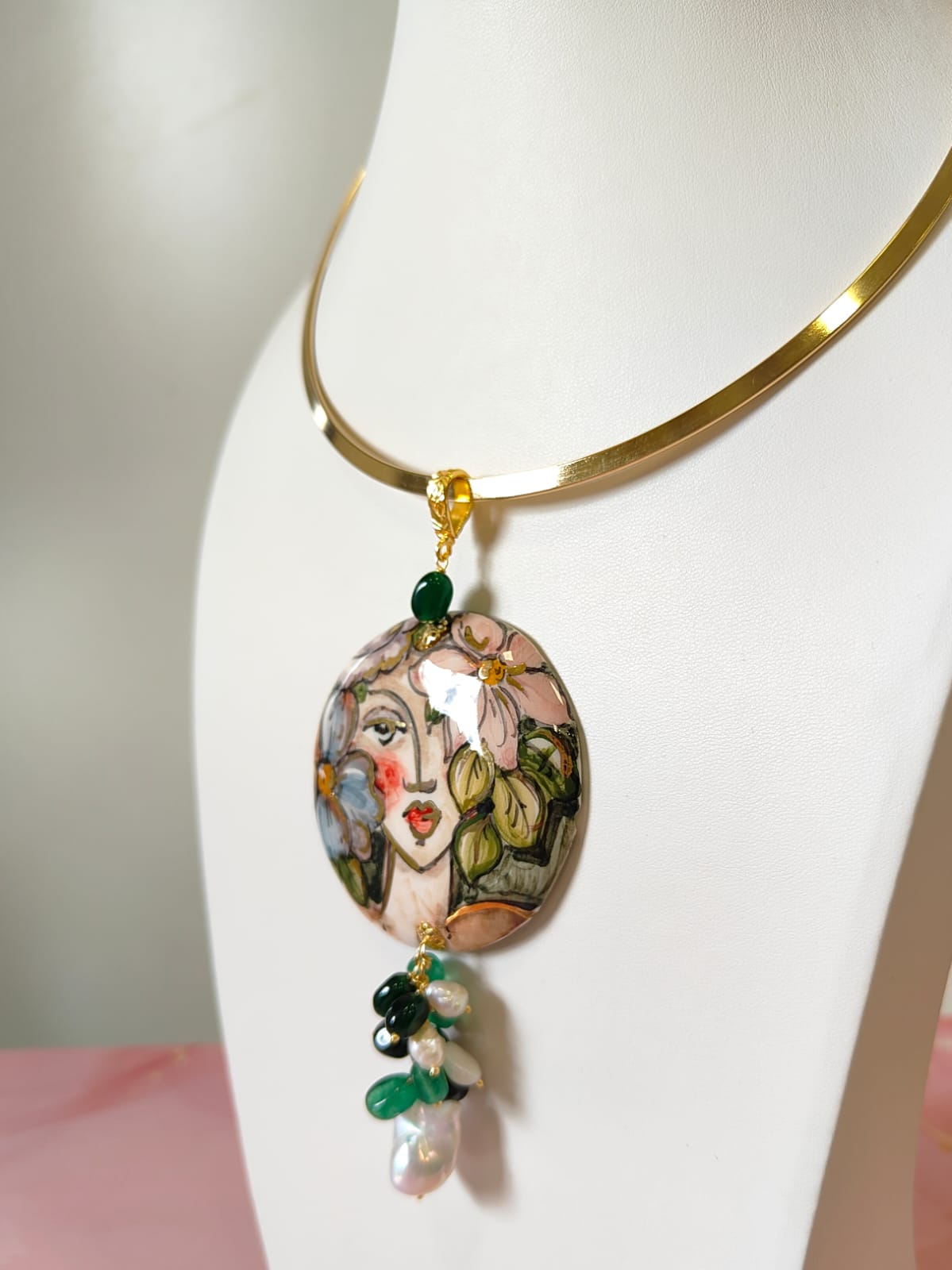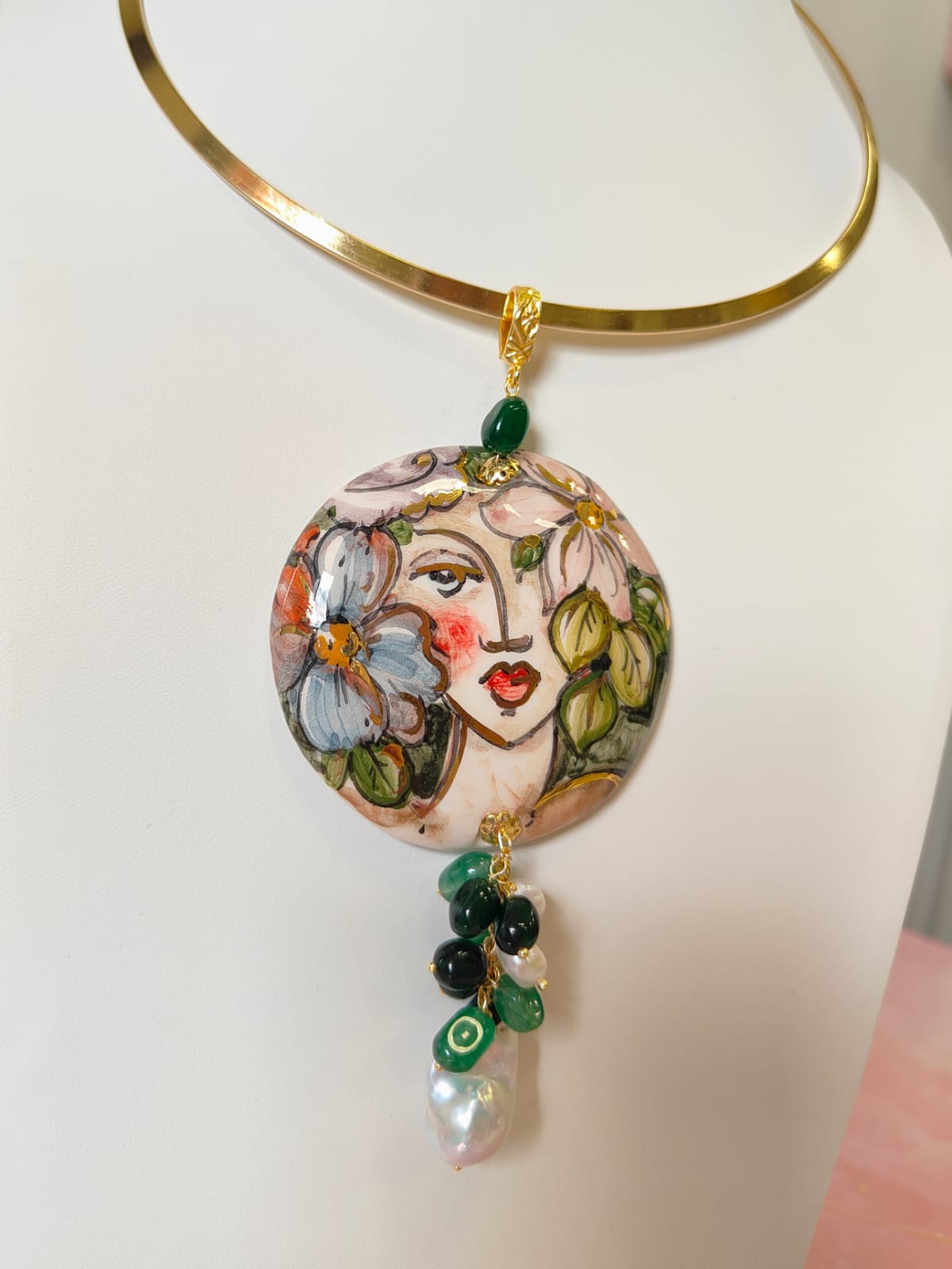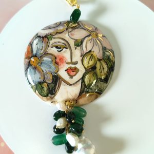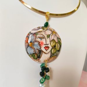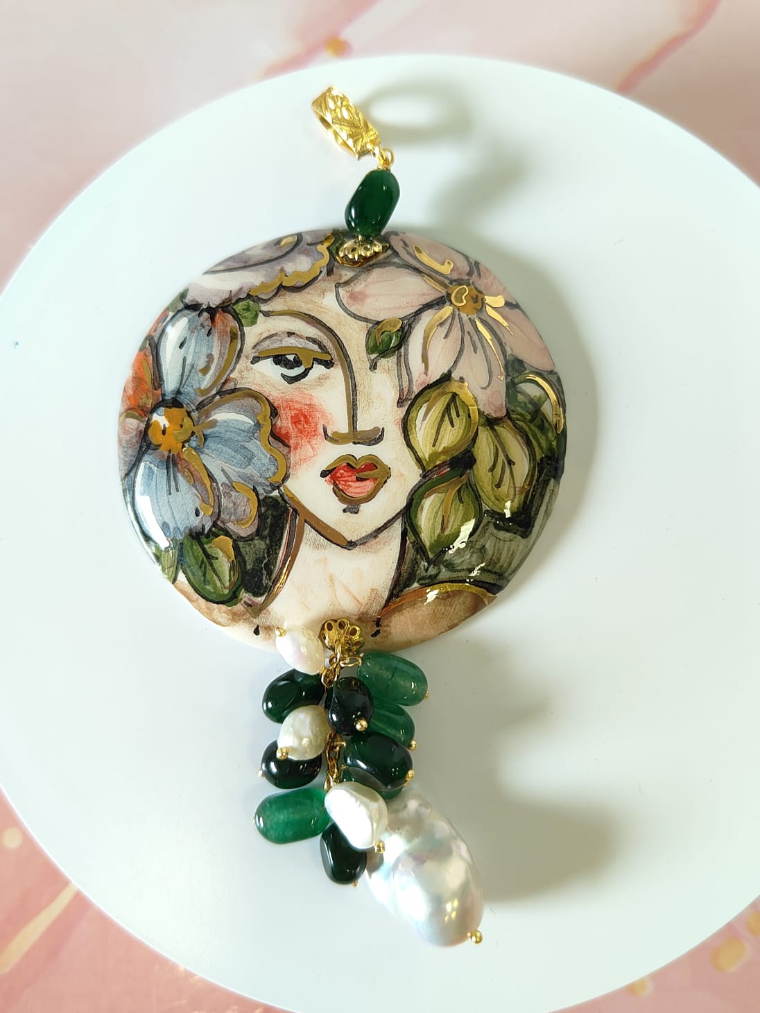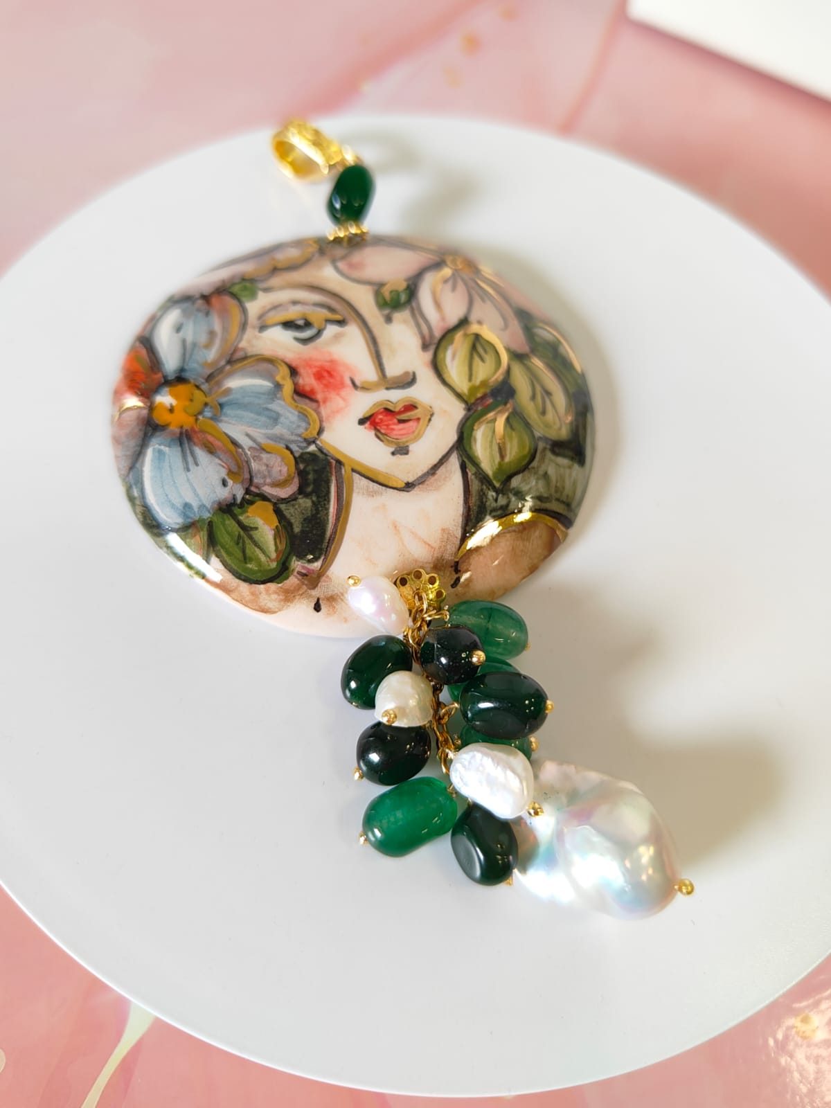Materiali: ceramica dipinta a mano, agata verde naturale, perle d’acqua dolce, perla barocca