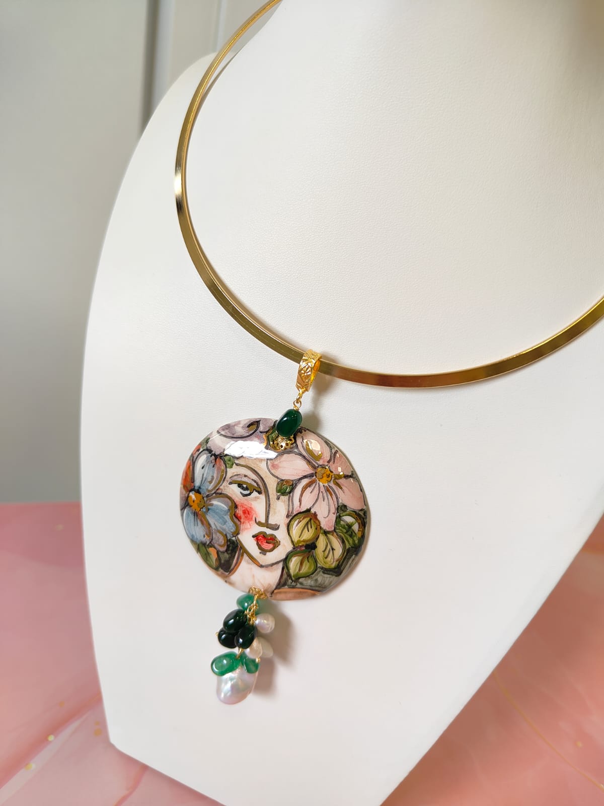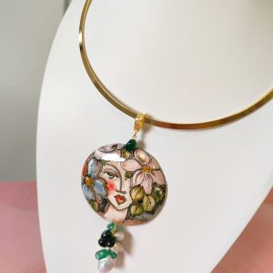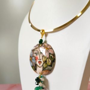 La Collana Ceramica Dipinta è un gioiello artistico pensato per chi ama gli accessori espressivi e ricchi di personalità. Il ciondolo, completamente realizzato a mano, raffigura un volto femminile circondato da fiori e foglie. Le pennellate delicate, unite ai colori morbidi, creano un effetto poetico e immediatamente riconoscibile. Inoltre, la lucidatura finale dona luminosità e protegge il dipinto.
