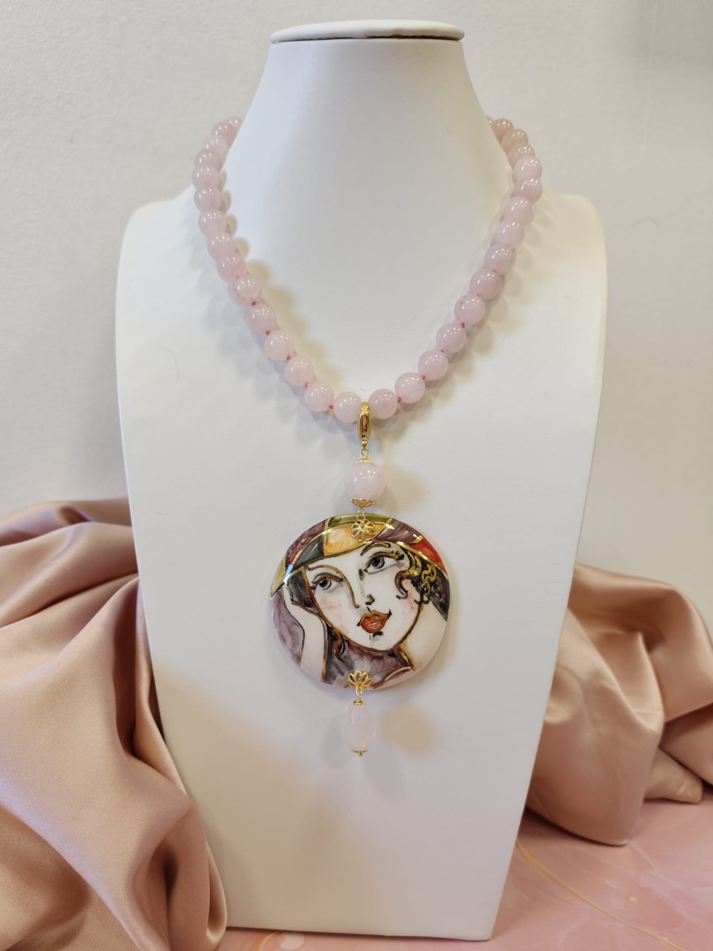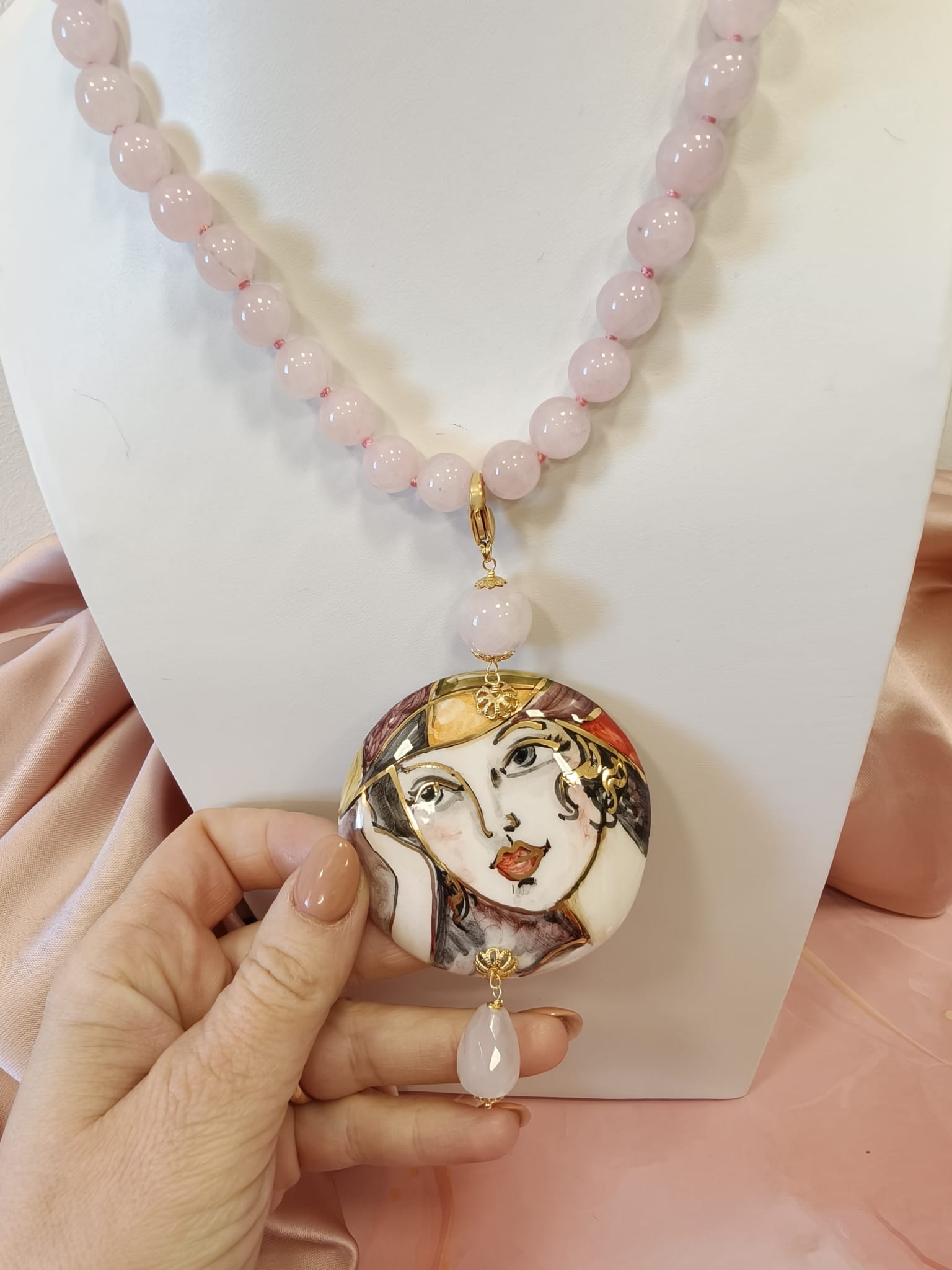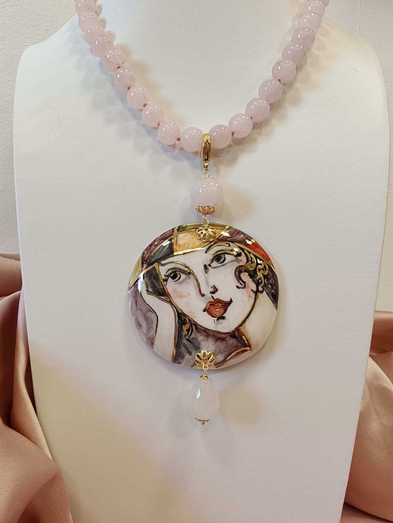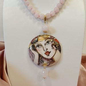 Il punto focale della collana è il ciondolo staccabile, collegato tramite moschettone in acciaio, che consente di personalizzare l’utilizzo del gioiello. Il connettore centrale è una ceramica dipinta a mano, raffigurante un volto femminile intenso ed evocativo. Ogni pennellata, infatti, contribuisce a dare profondità allo sguardo e carattere all’espressione, trasformando il ciondolo in una piccola opera d’arte da indossare.