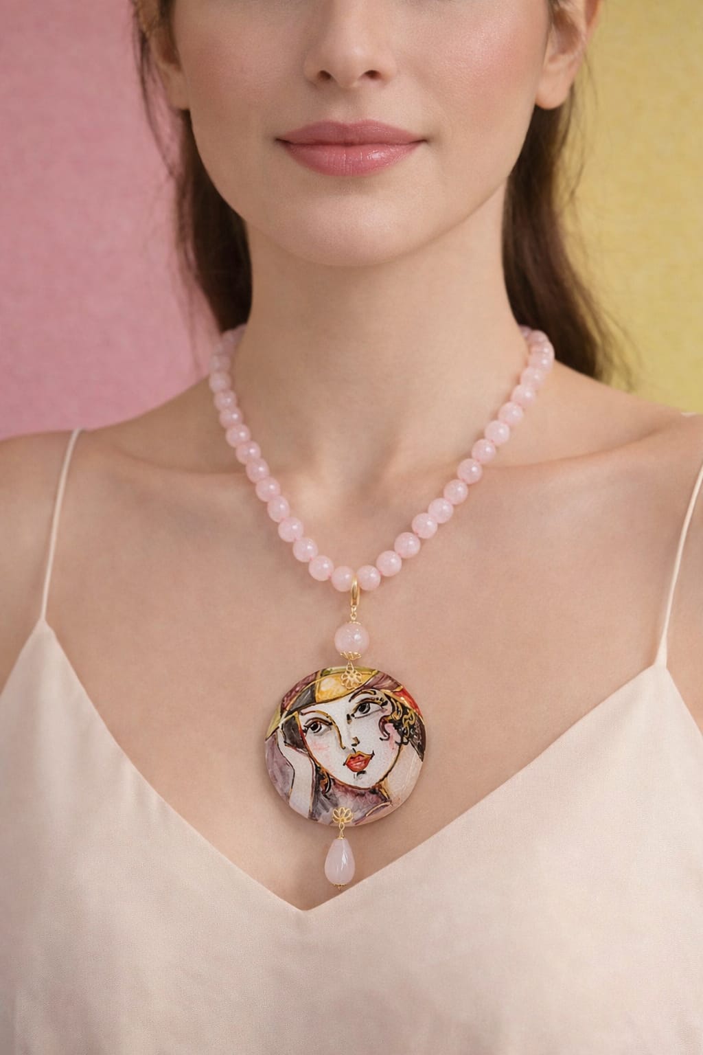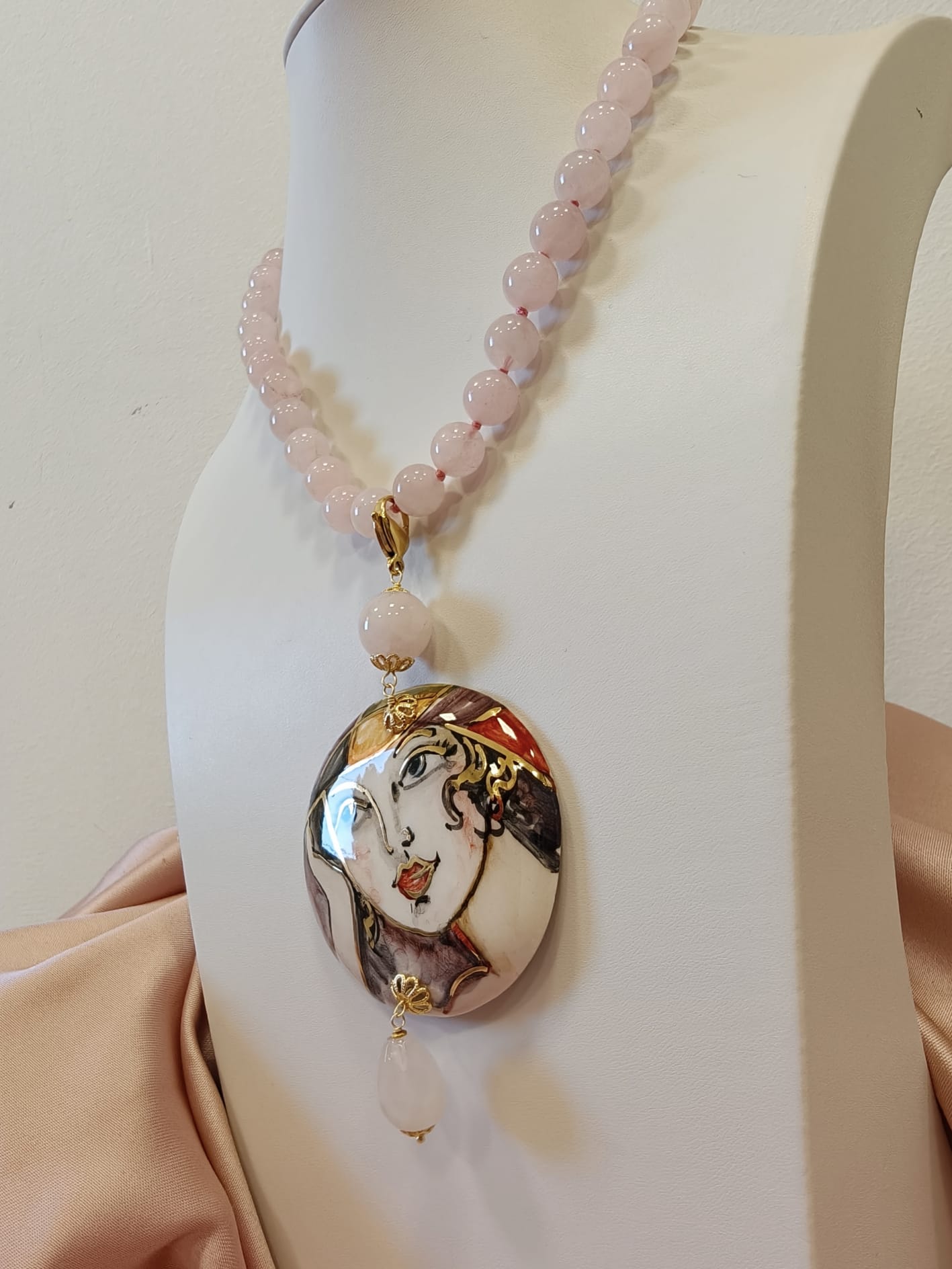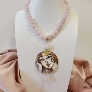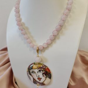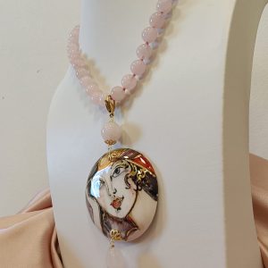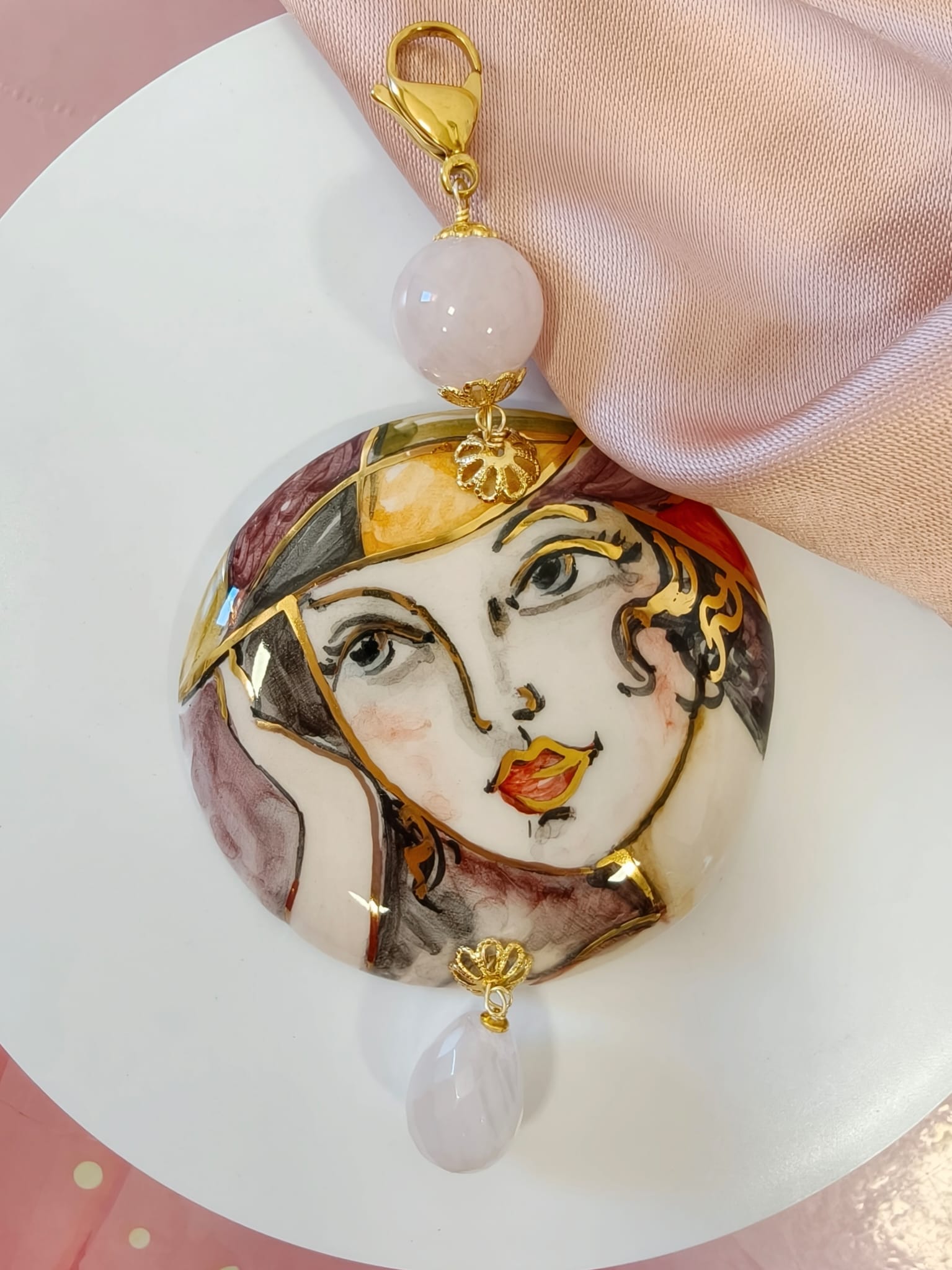 Il punto focale della collana è il ciondolo staccabile, collegato tramite moschettone in acciaio, che consente di personalizzare l’utilizzo del gioiello. Il connettore centrale è una ceramica dipinta a mano, raffigurante un volto femminile intenso ed evocativo. Ogni pennellata, infatti, contribuisce a dare profondità allo sguardo e carattere all’espressione, trasformando il ciondolo in una piccola opera d’arte da indossare.