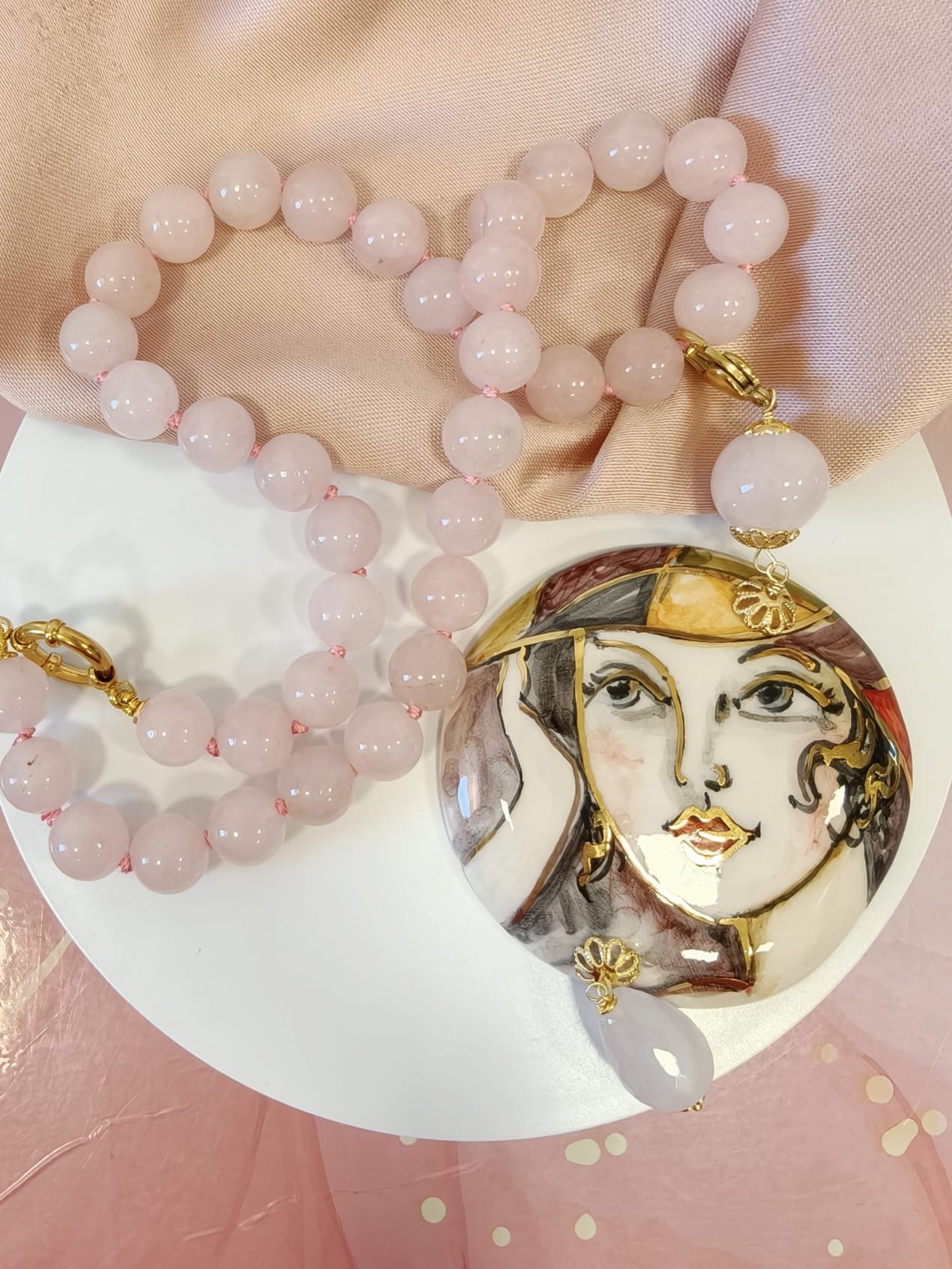Subito sotto il connettore, una sfera di quarzo rosa da 14 mm introduce continuità cromatica, mentre la goccia finale coordinata aggiunge movimento e leggerezza. In questo modo, la composizione risulta armoniosa e ben proporzionata, senza appesantire la linea complessiva del gioiello. La collana ceramica e quarzo rosa diventa così un accessorio capace di valorizzare anche l’outfit più semplice.