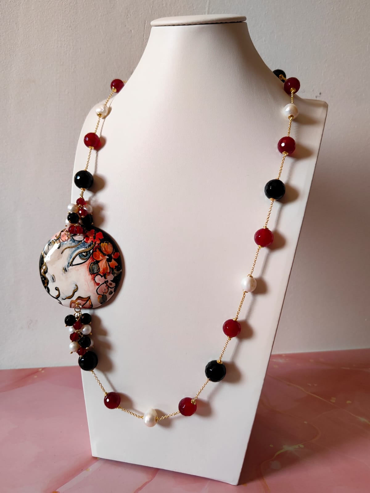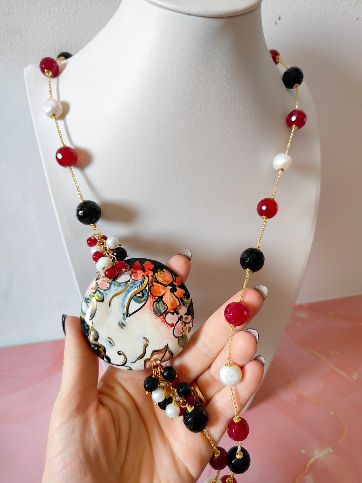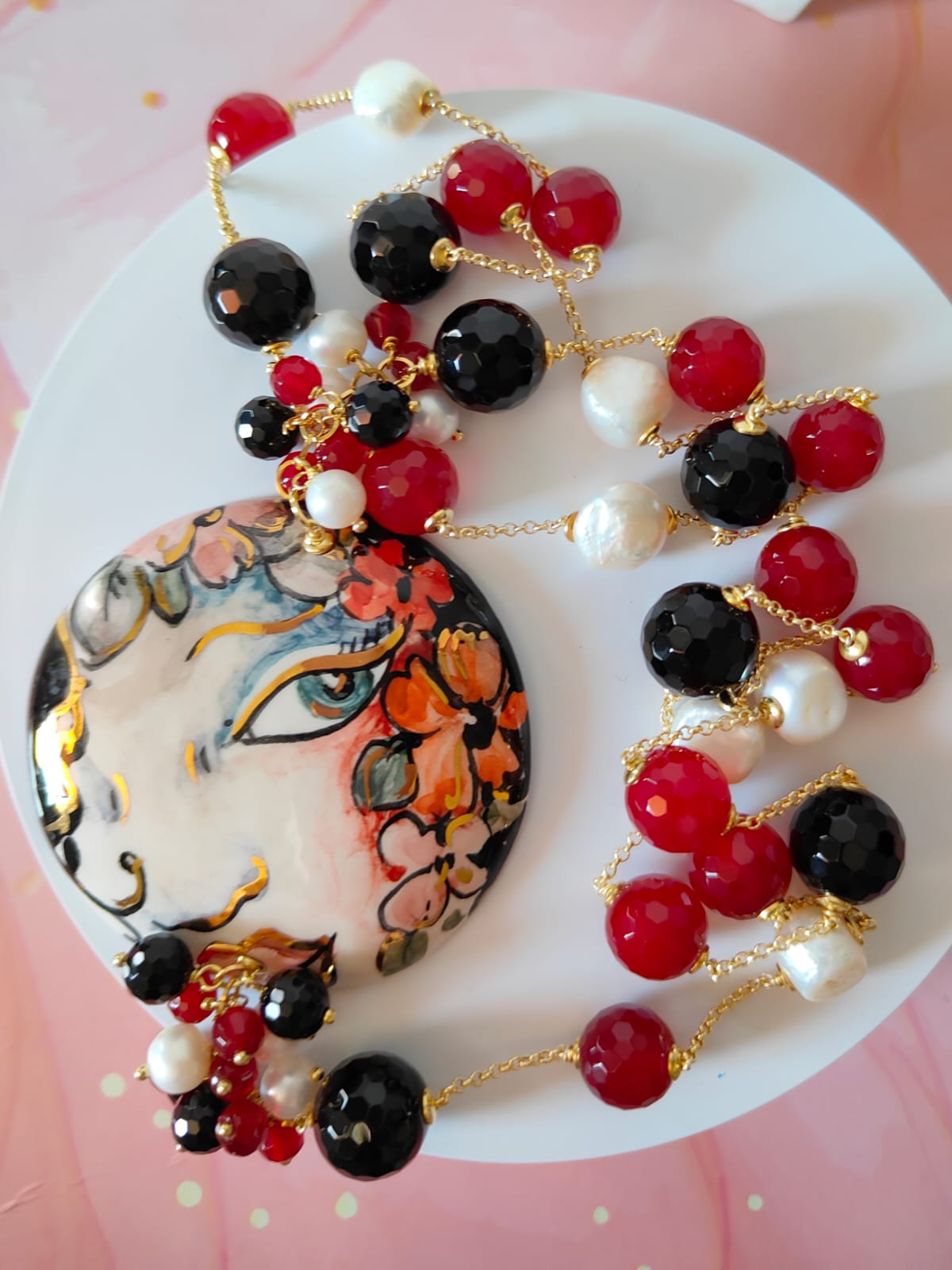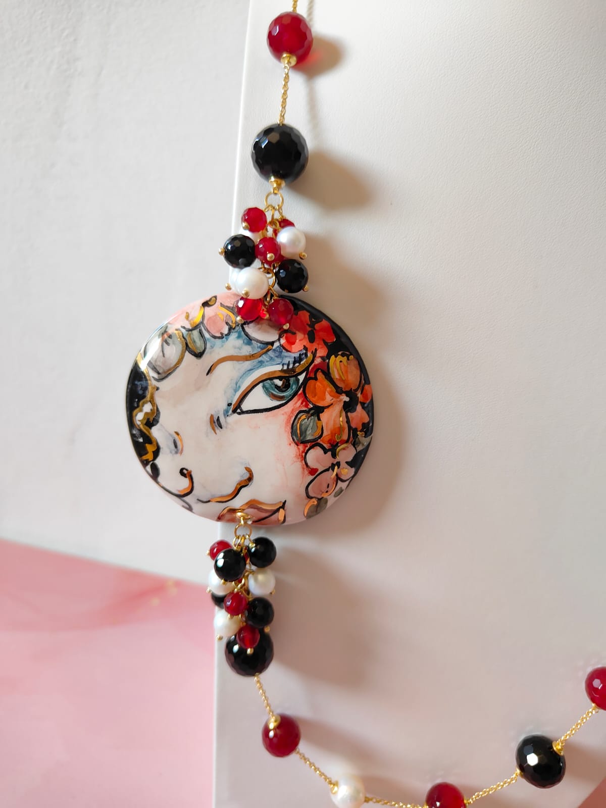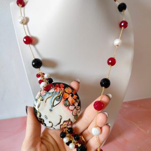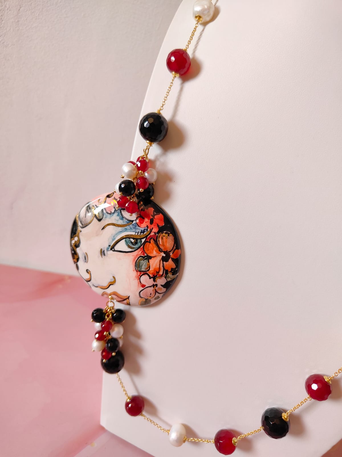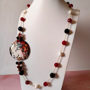 Materiali: onice nero sfaccettato, agata borgogna sfaccettata, perle naturali, ceramica di Caltagirone dipinta a mano, catena in ottone dorato.
