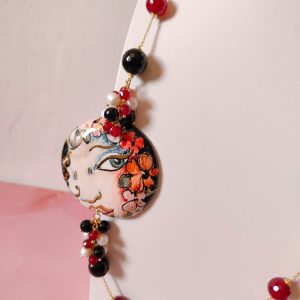 La Collana Ceramica Onice E Agata è un gioiello che racchiude una storia, un colore e un carattere profondamente mediterranei. Questa creazione nasce dall’incontro tra la luminosità dell’agata borgogna, la profondità dell’onice nero e la dolcezza delle perle naturali, che danzano lungo una catena dorata sottile e brillante. Il connettore in ceramica di Caltagirone, completamente dipinto a mano, ritrae un volto di donna dai tratti delicati, con un’espressione intensa e poetica che sembra raccontare segreti antichi e bellezze senza tempo.