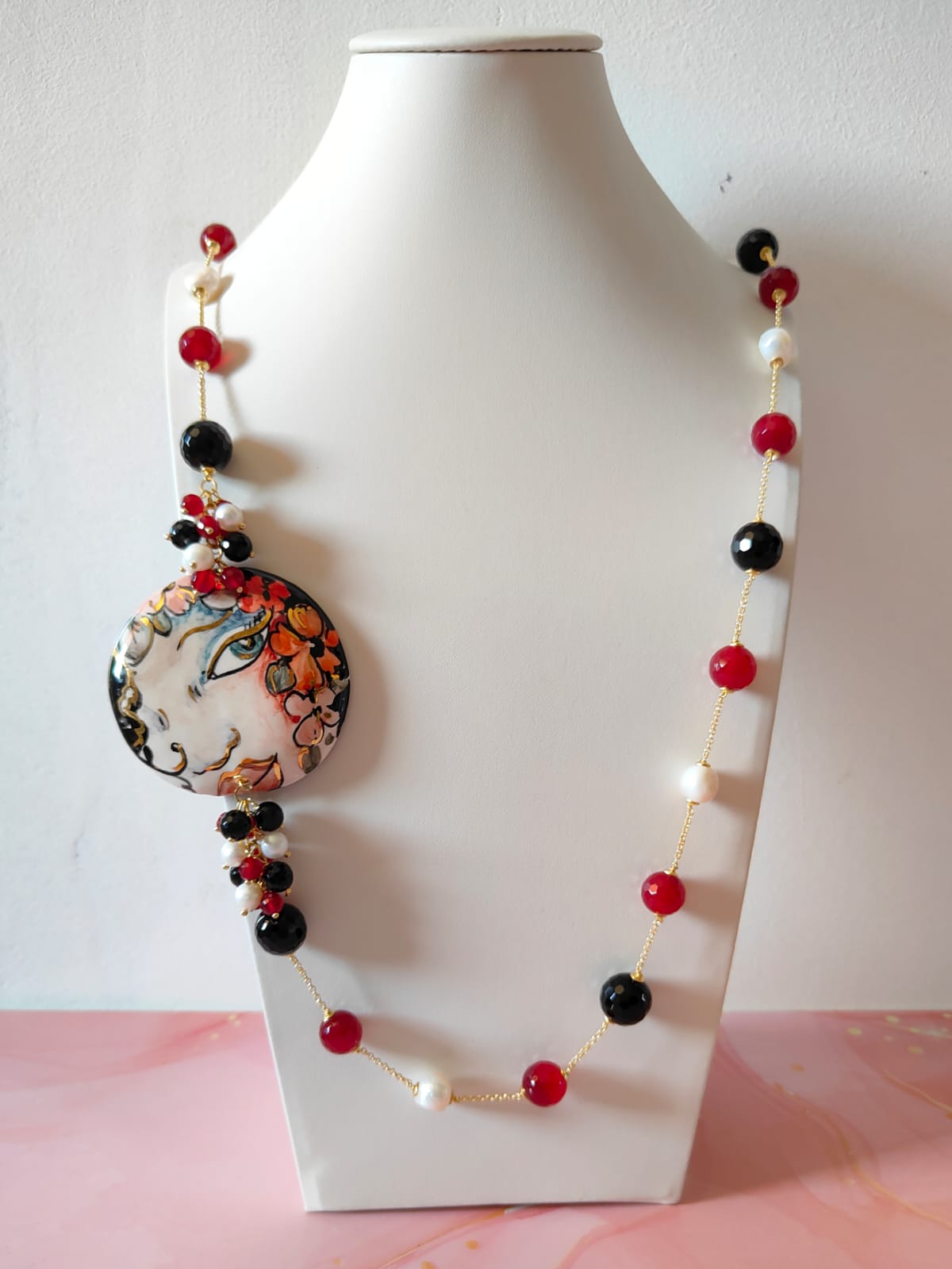 Questa collana è pensata per chi ama i gioielli che comunicano personalità, stile e un tocco d’arte pura. È ideale per occasioni speciali, ma anche per trasformare un look semplice in qualcosa di unico e ricco di significato. Ogni volta che la si indossa, il volto dipinto sembra prendere vita, catturando la luce e lo sguardo di chi osserva.
