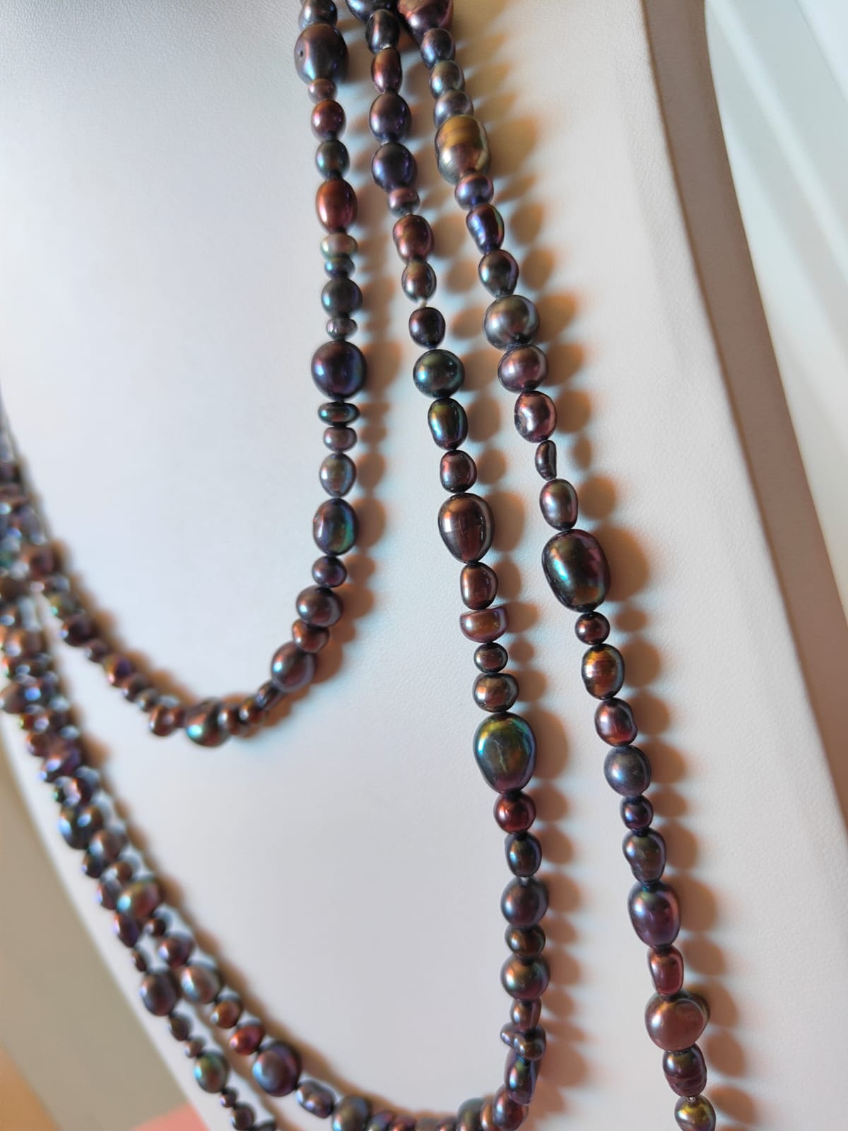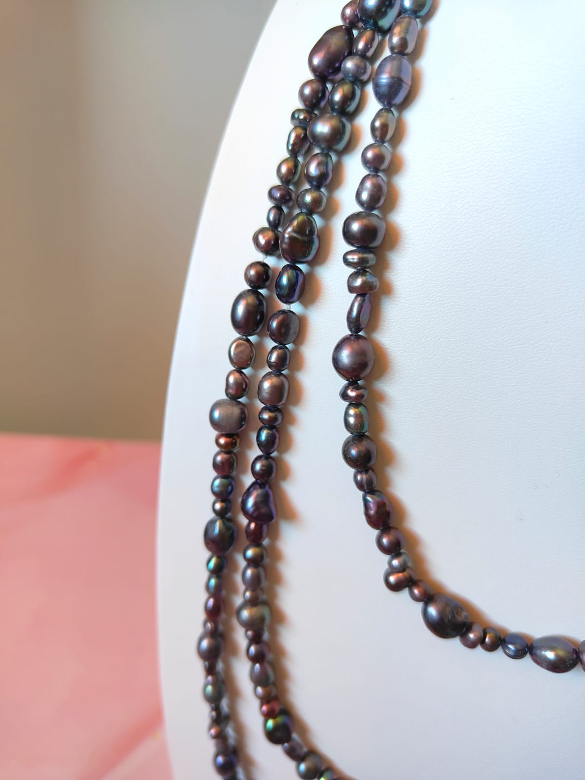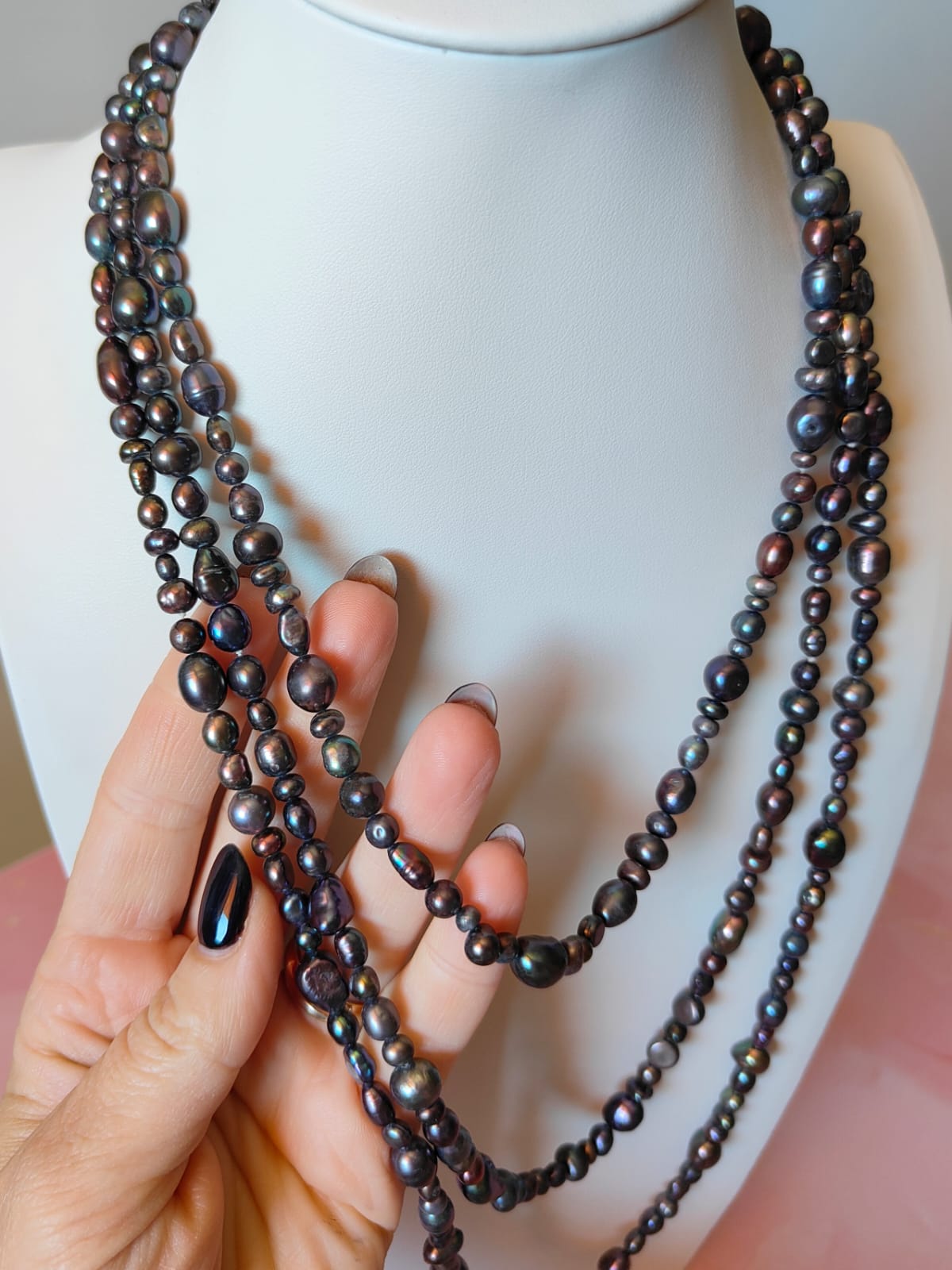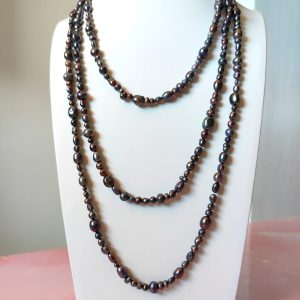 Questa collana può essere indossata lunga in un unico giro dal fascino mondano, avvolta due o tre volte per creare volume, oppure abbinata ad altre collane per un look più audace. La palette scura e cangiante la rende perfetta sia con outfit eleganti da sera, sia con look minimal e total black, donando sempre luce e personalità.