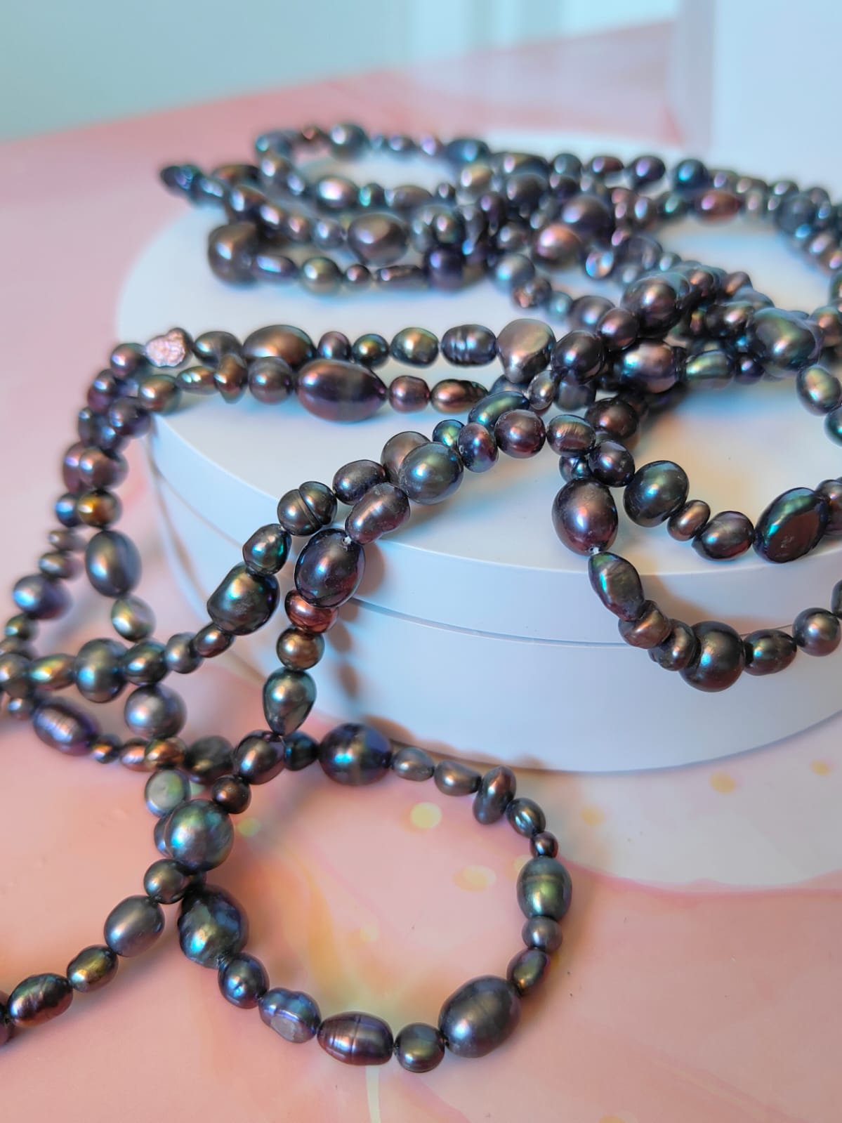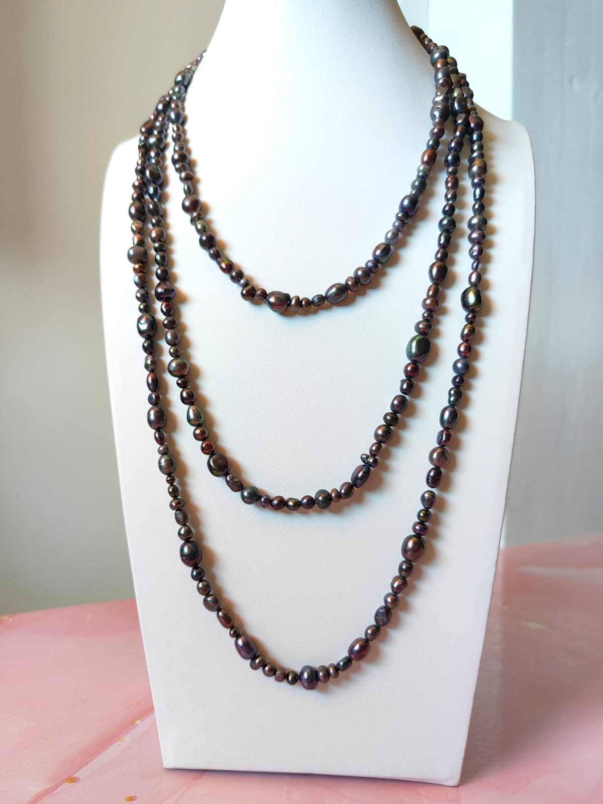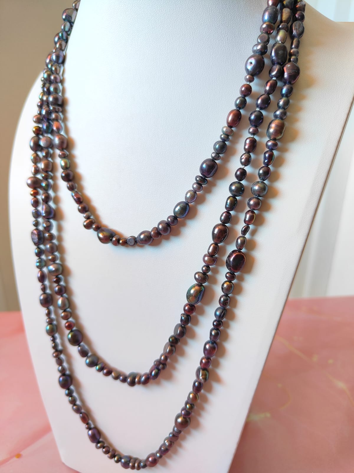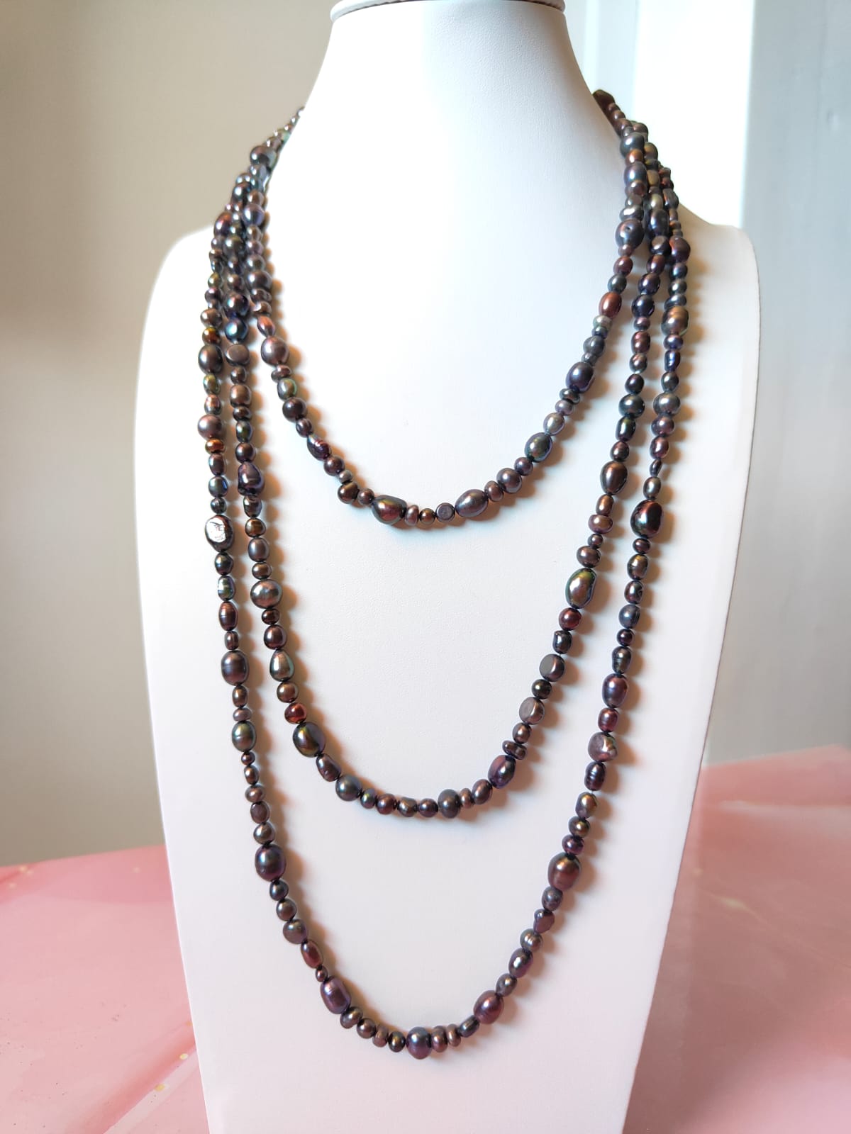 Questa collana può essere indossata lunga in un unico giro dal fascino mondano, avvolta due o tre volte per creare volume, oppure abbinata ad altre collane per un look più audace. La palette scura e cangiante la rende perfetta sia con outfit eleganti da sera, sia con look minimal e total black, donando sempre luce e personalità.