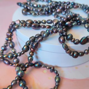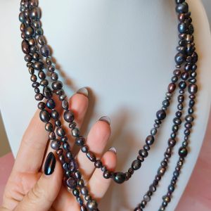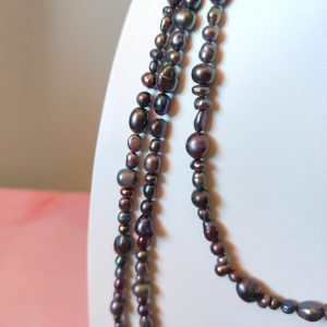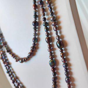 Collana Charleston Perle Nere è un omaggio all’eleganza intramontabile degli anni ’20, reinterpretata con un tocco contemporaneo e magnetico. Lunga ben 180 cm, scivola sul corpo con una fluidità sensuale, mentre le sue perle naturali di fiume riflettono sfumature profonde e iridescenti: viola, bronzo, verde petrolio, grafite e indaco. Ogni perlina presenta una forma organica e irregolare, dettaglio che ne esalta l’autenticità e l’origine naturale.