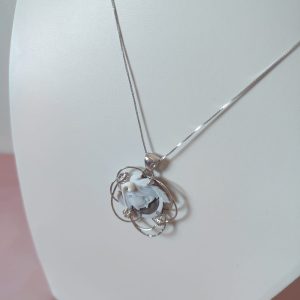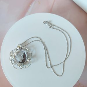 Il cammeo è incastonato in una montatura in argento 925, dal design fluido e raffinato, che abbraccia la conchiglia con curve eleganti e piccoli decori lucenti. La superficie levigata e i riflessi metallici donano al gioiello un aspetto armonioso e sofisticato, mentre la catenina sottile in argento completa l’insieme con equilibrio e luminosità.