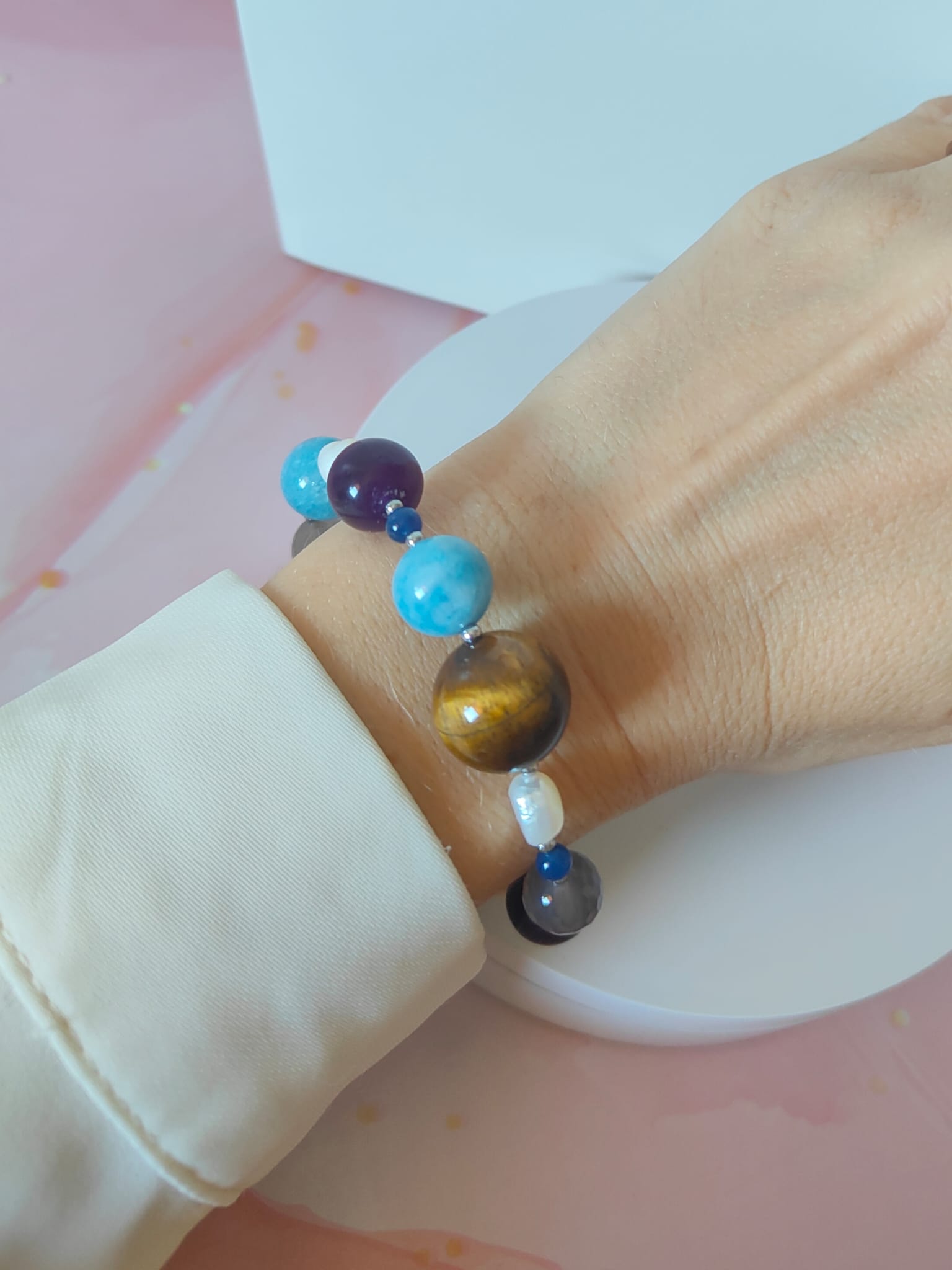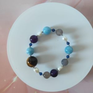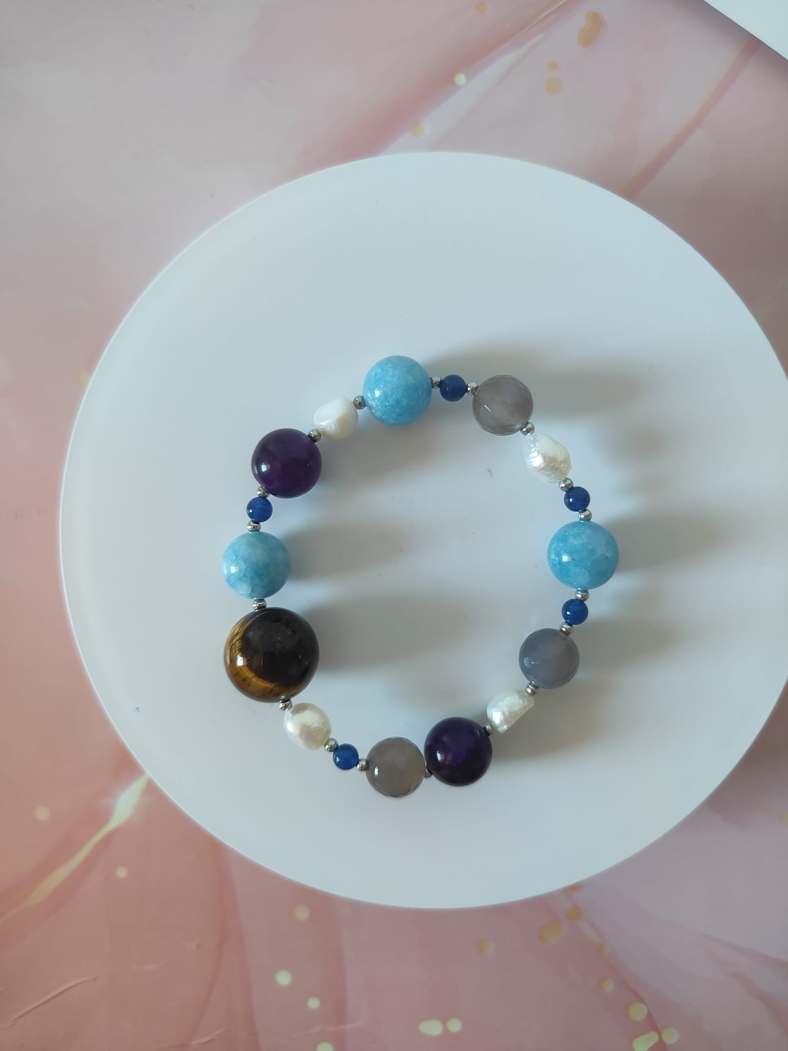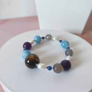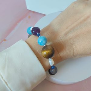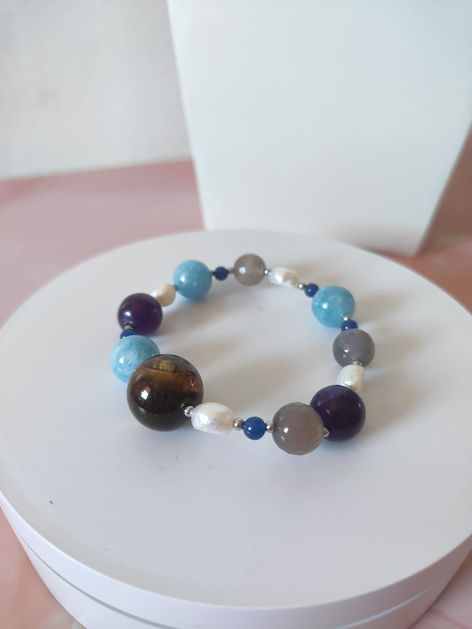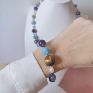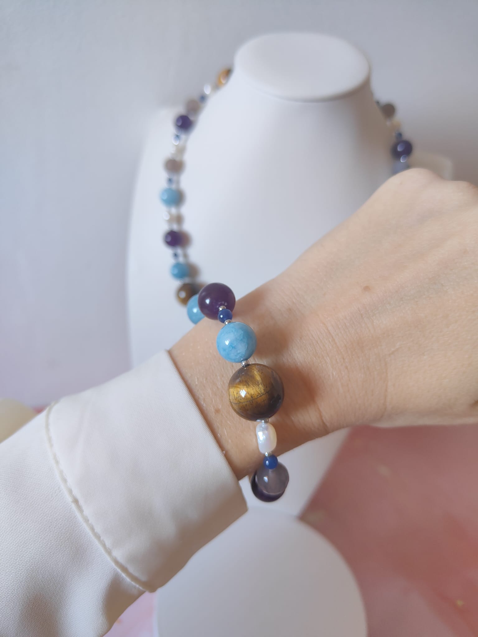 Questa creazione artigianale è pensata per chi ama i dettagli unici e desidera indossare un gioiello capace di trasmettere energia positiva. L’ametista favorisce la calma e l’intuizione, l’occhio di tigre stimola coraggio e fiducia, mentre la giada e le perle evocano purezza e armonia. Inoltre, grazie alla combinazione dei colori, il gioiello si adatta perfettamente a ogni stagione.
