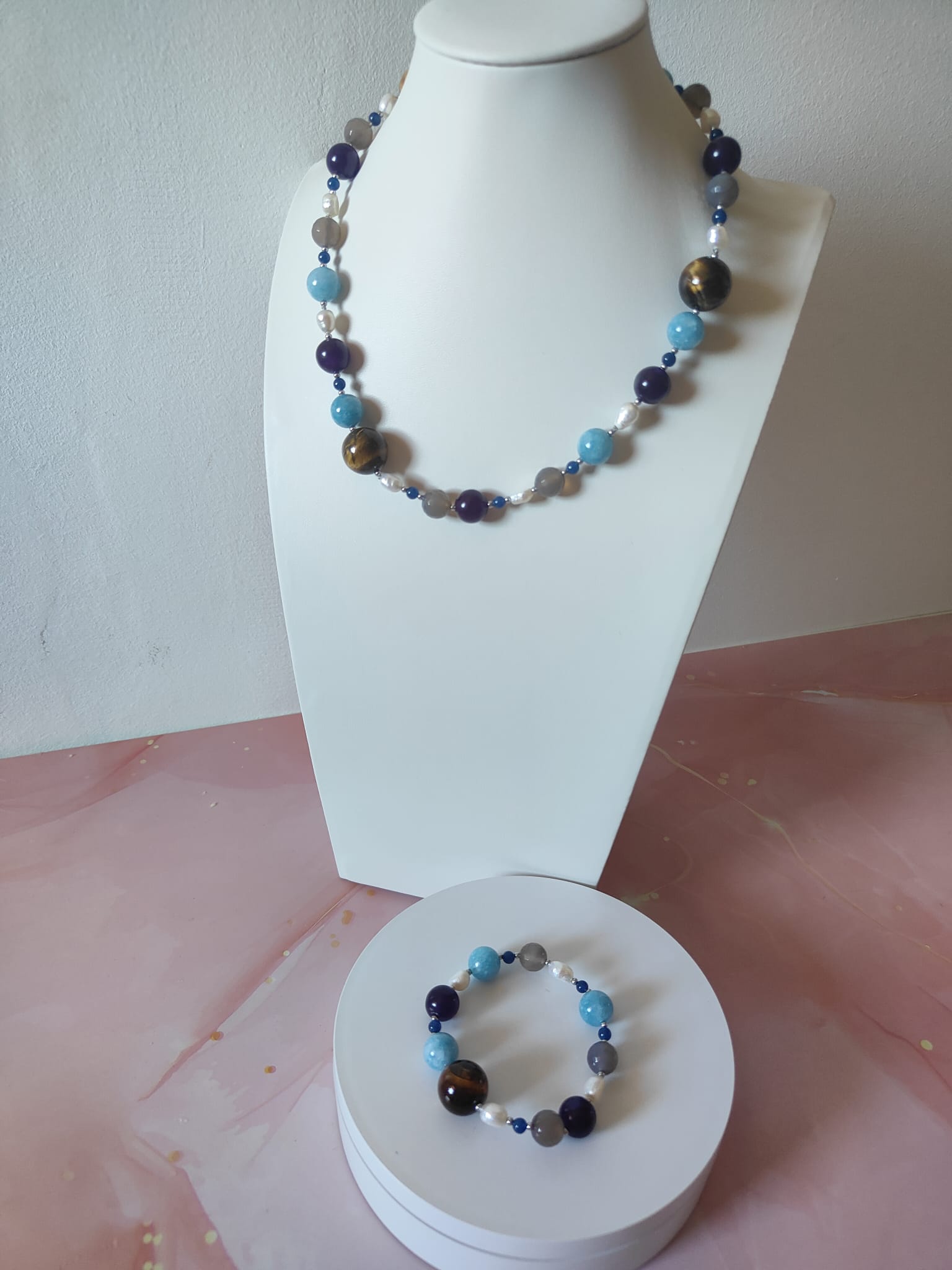 La collana è completata da una chiusura in acciaio dorato, solida e pratica, che garantisce comfort e durata nel tempo. Il bracciale elastico coordinato, con le stesse pietre naturali, offre la possibilità di creare un set perfetto, equilibrato e versatile. È possibile acquistare entrambi i gioielli insieme, a prezzo promozionale, oppure separatamente per personalizzare il proprio stile.