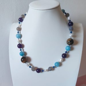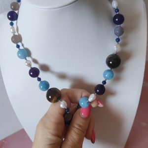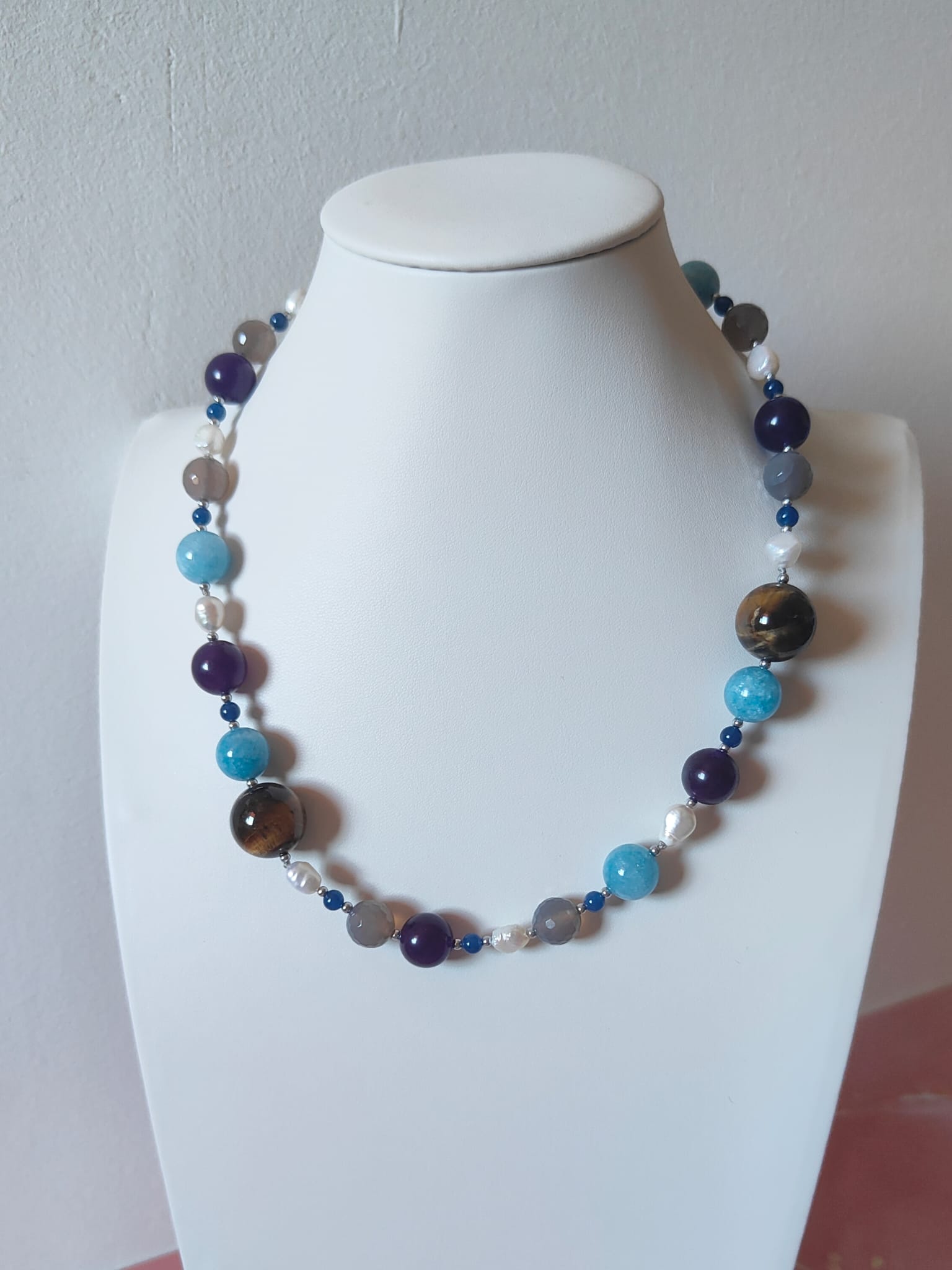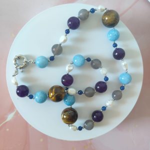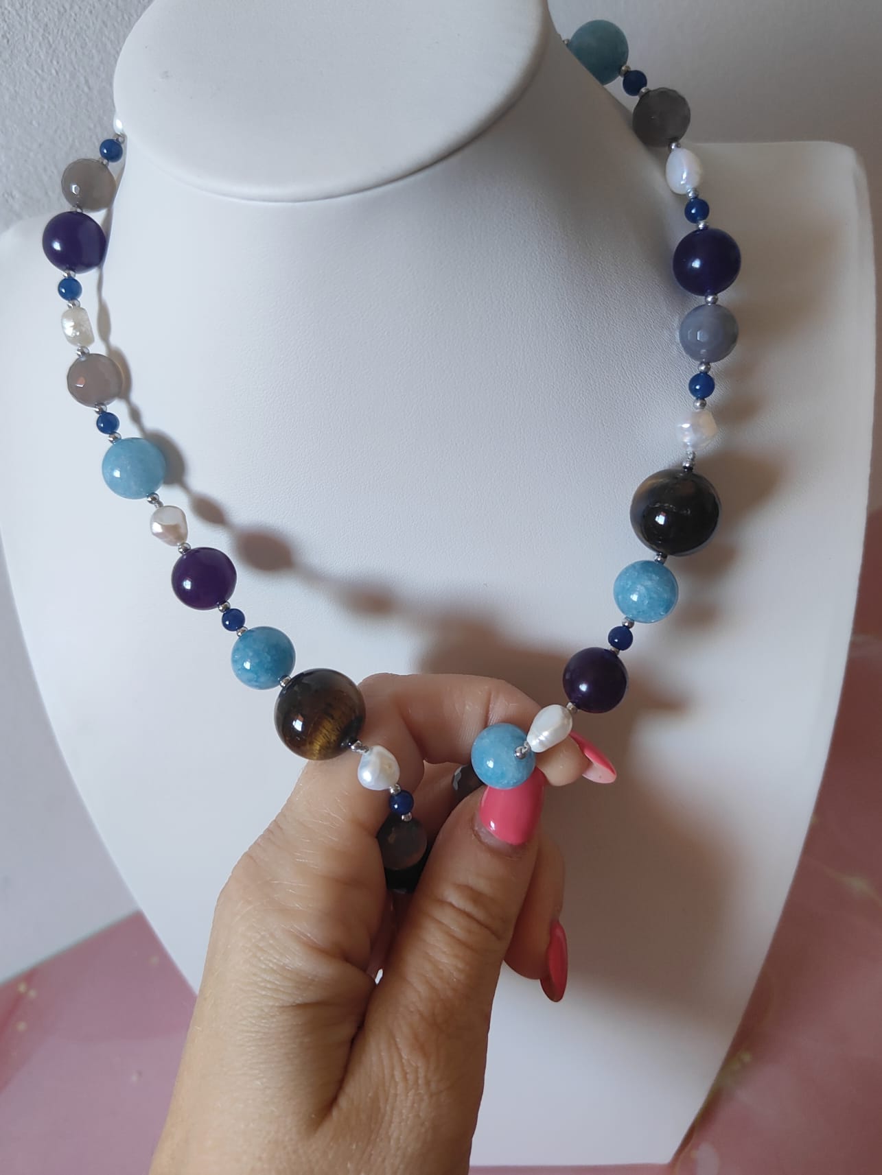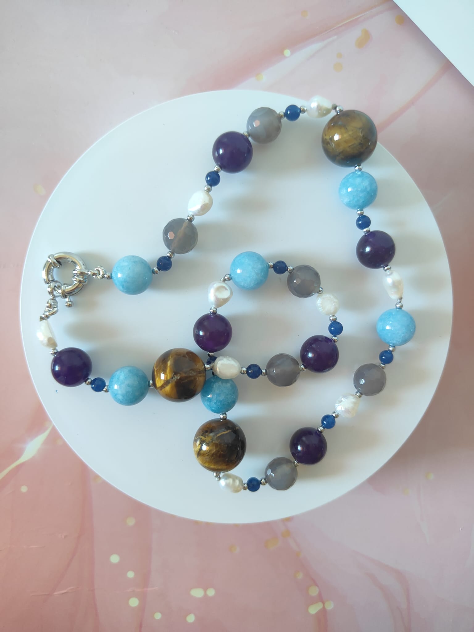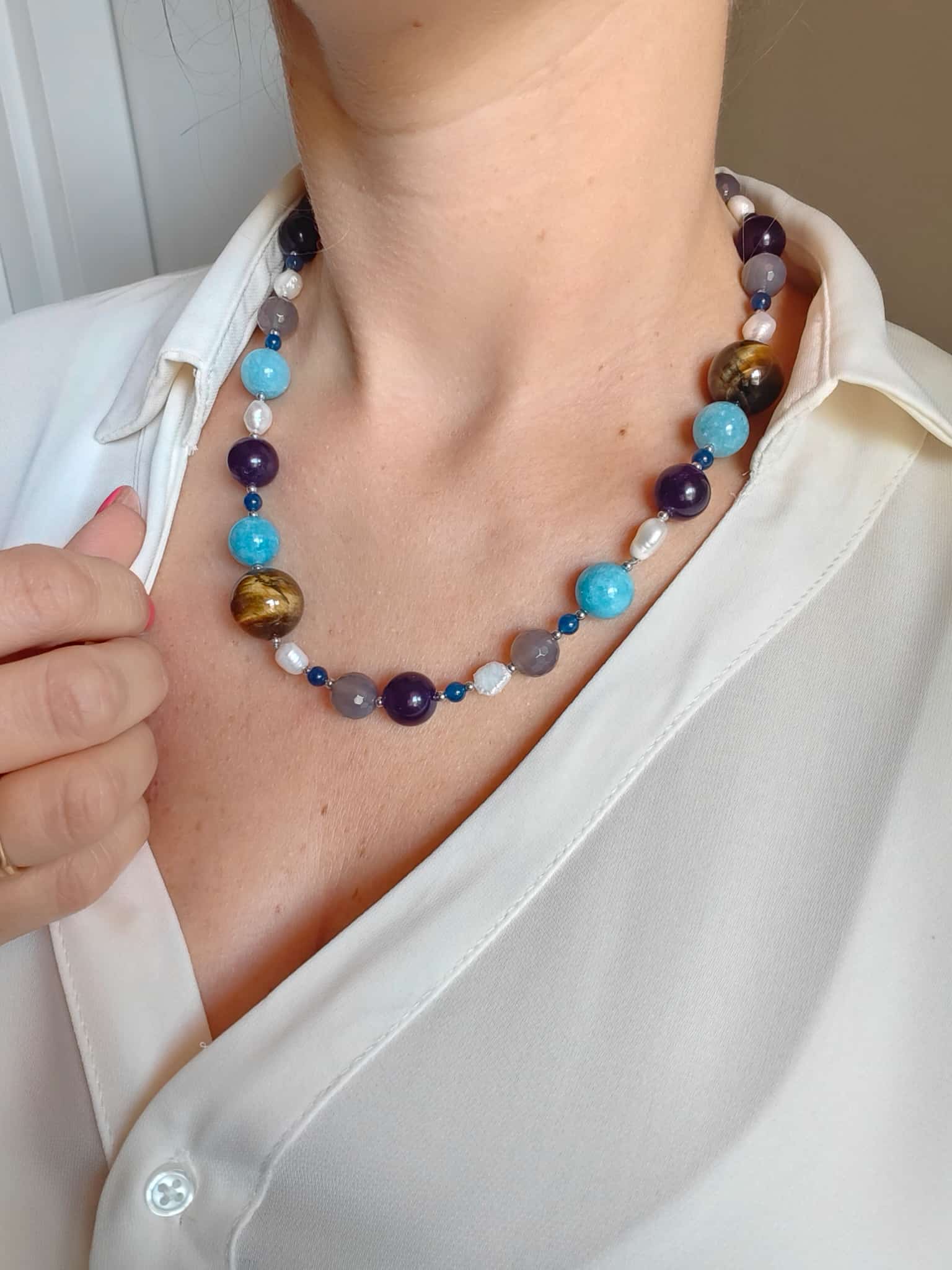La collana con pietre naturali è una celebrazione di colore, luce ed eleganza. Ogni pietra, scelta con cura, racconta la bellezza autentica della natura e si unisce in una composizione armoniosa e raffinata. Le tonalità intense dell’ametista si fondono con la lucentezza delle perle, mentre i riflessi dorati dell’occhio di tigre creano un equilibrio perfetto tra calore e profondità.