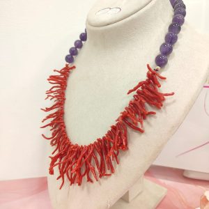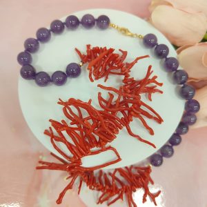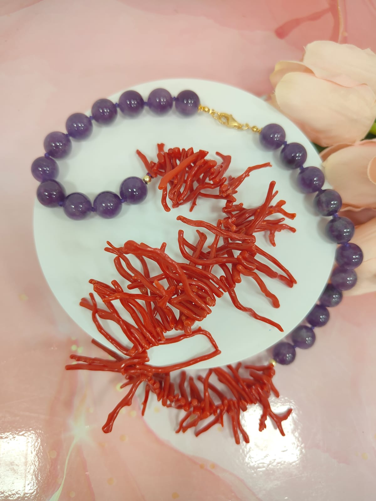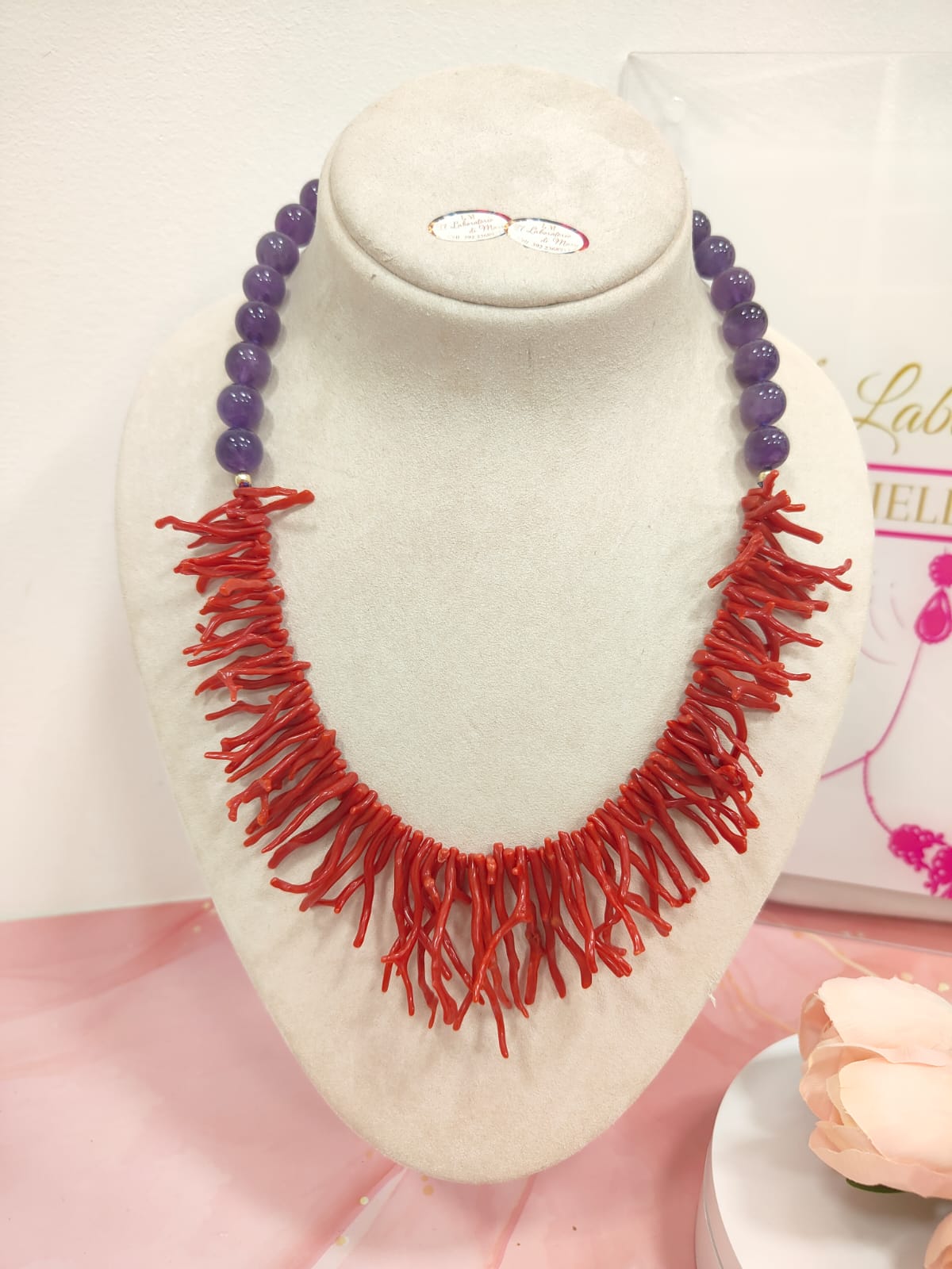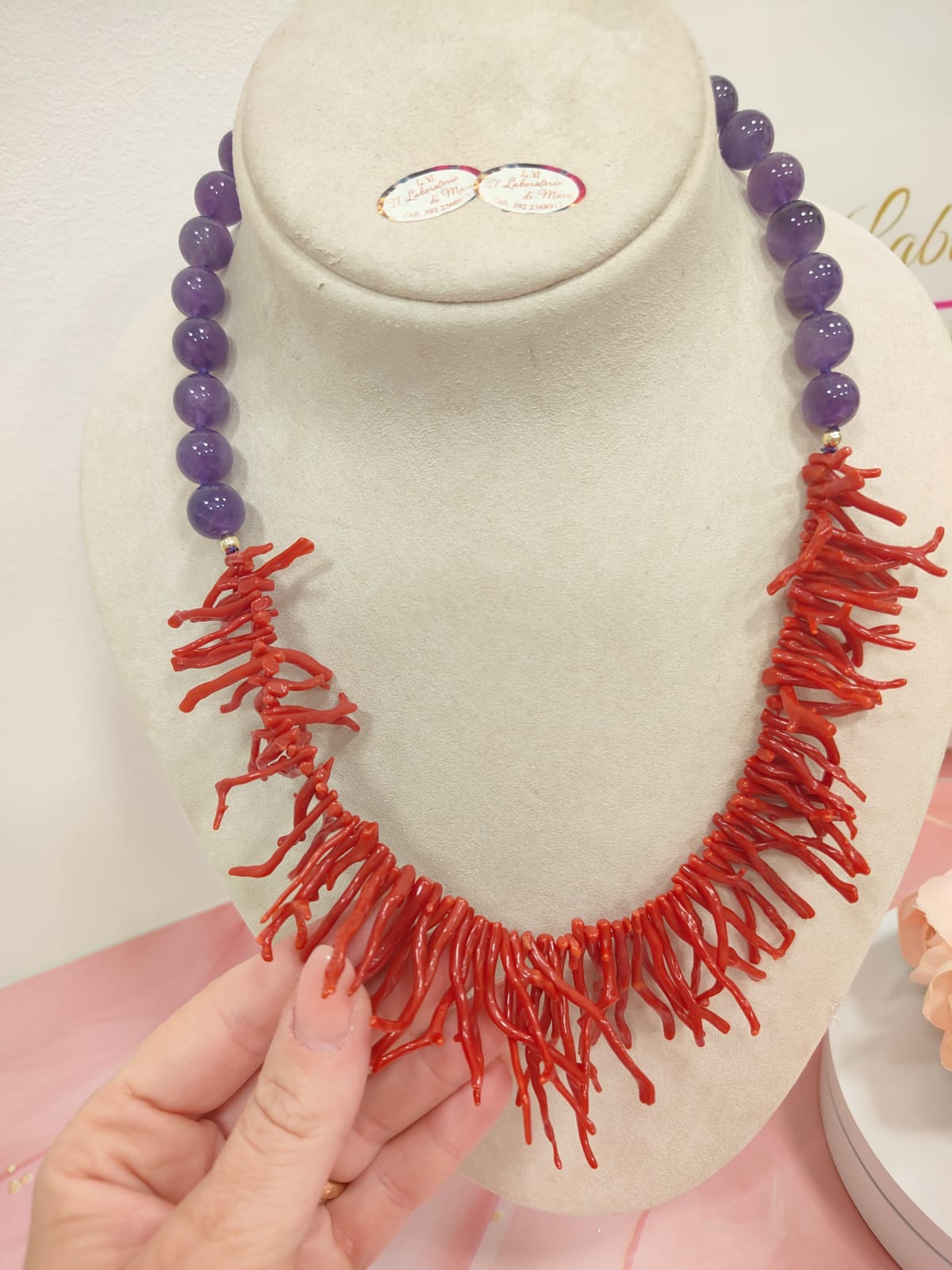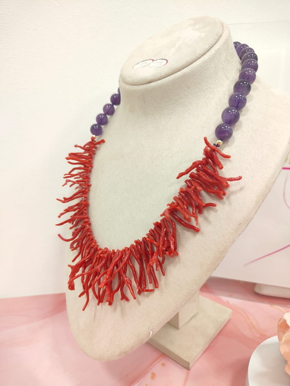 Il contrasto tra il viola intenso dell’ametista e il rosso vivo del corallo evoca scenari solari e preziosi, rendendo questa collana un accessorio ideale per chi ama distinguersi con classe. Ogni elemento è scelto e montato a mano, in un connubio tra energia e raffinatezza.