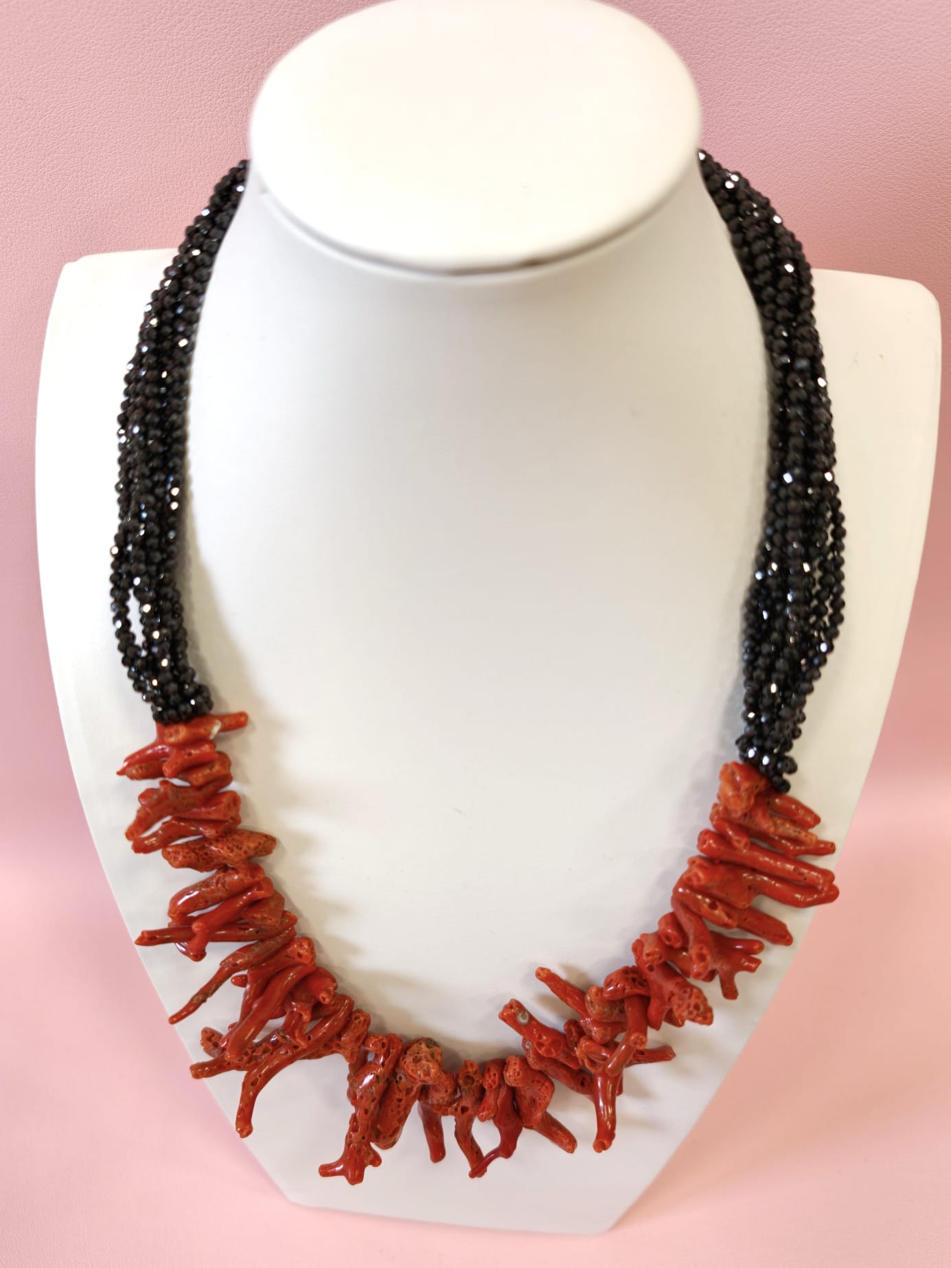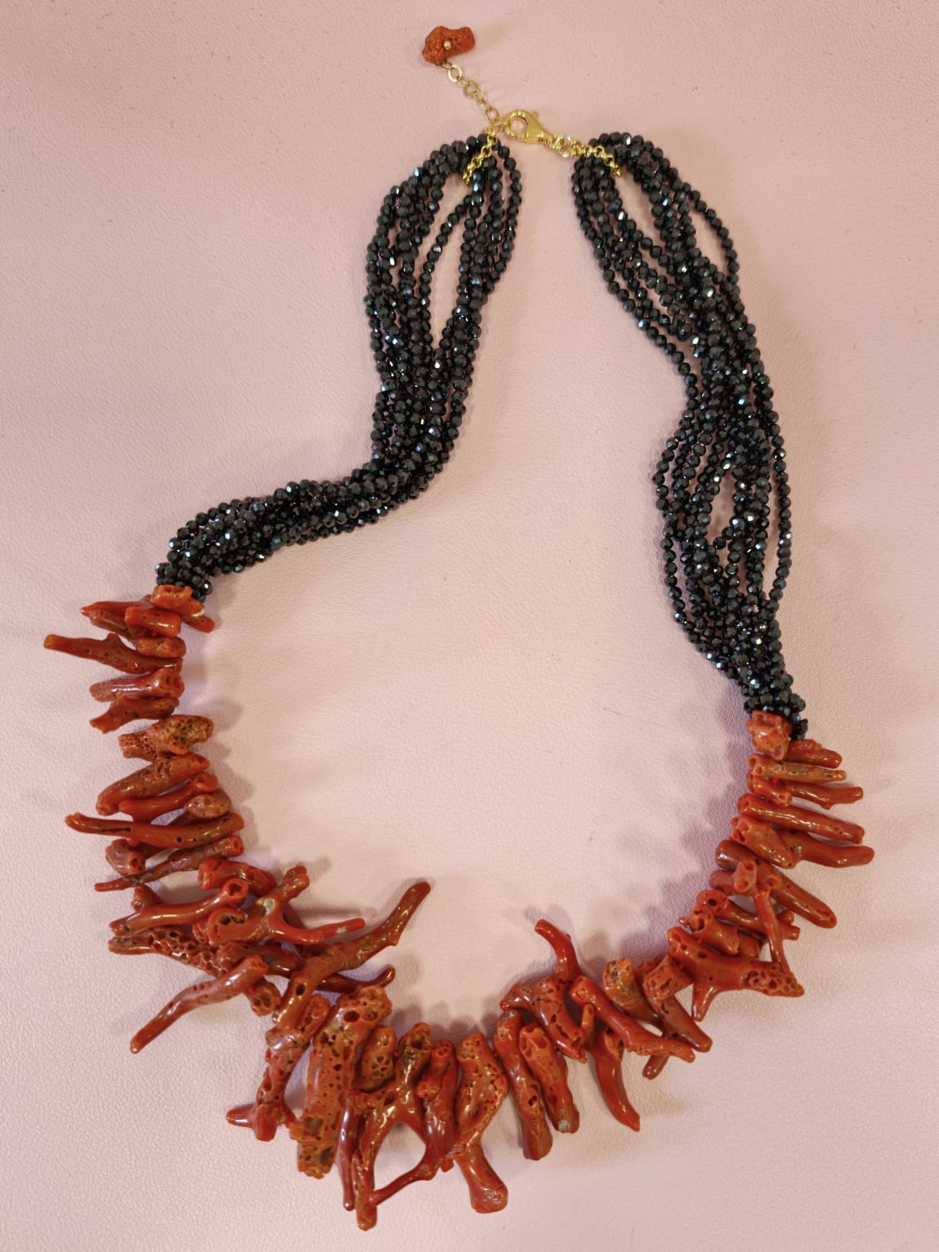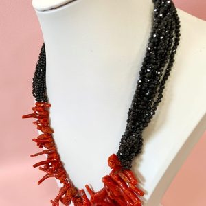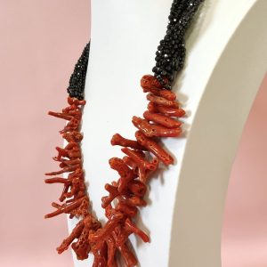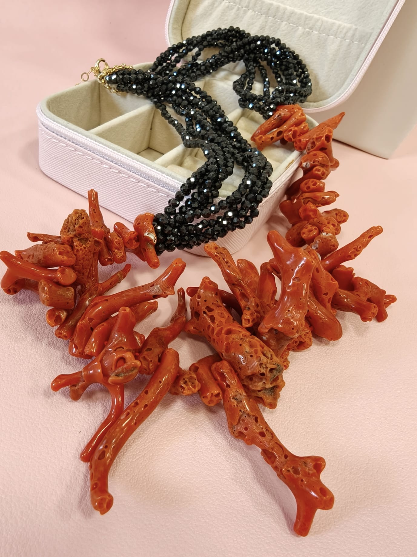 Elegante Collana Corallo Mediterraneo Grezzo realizzata con fili di zirconi neri scintillanti e grandi rametti di corallo naturale del Mediterraneo. Un gioiello artigianale intenso e scenografico, pensato per chi ama indossare creazioni uniche e ricche di carattere.