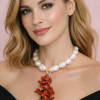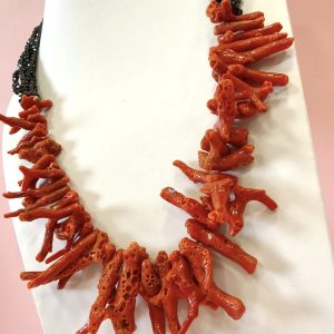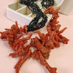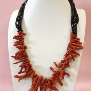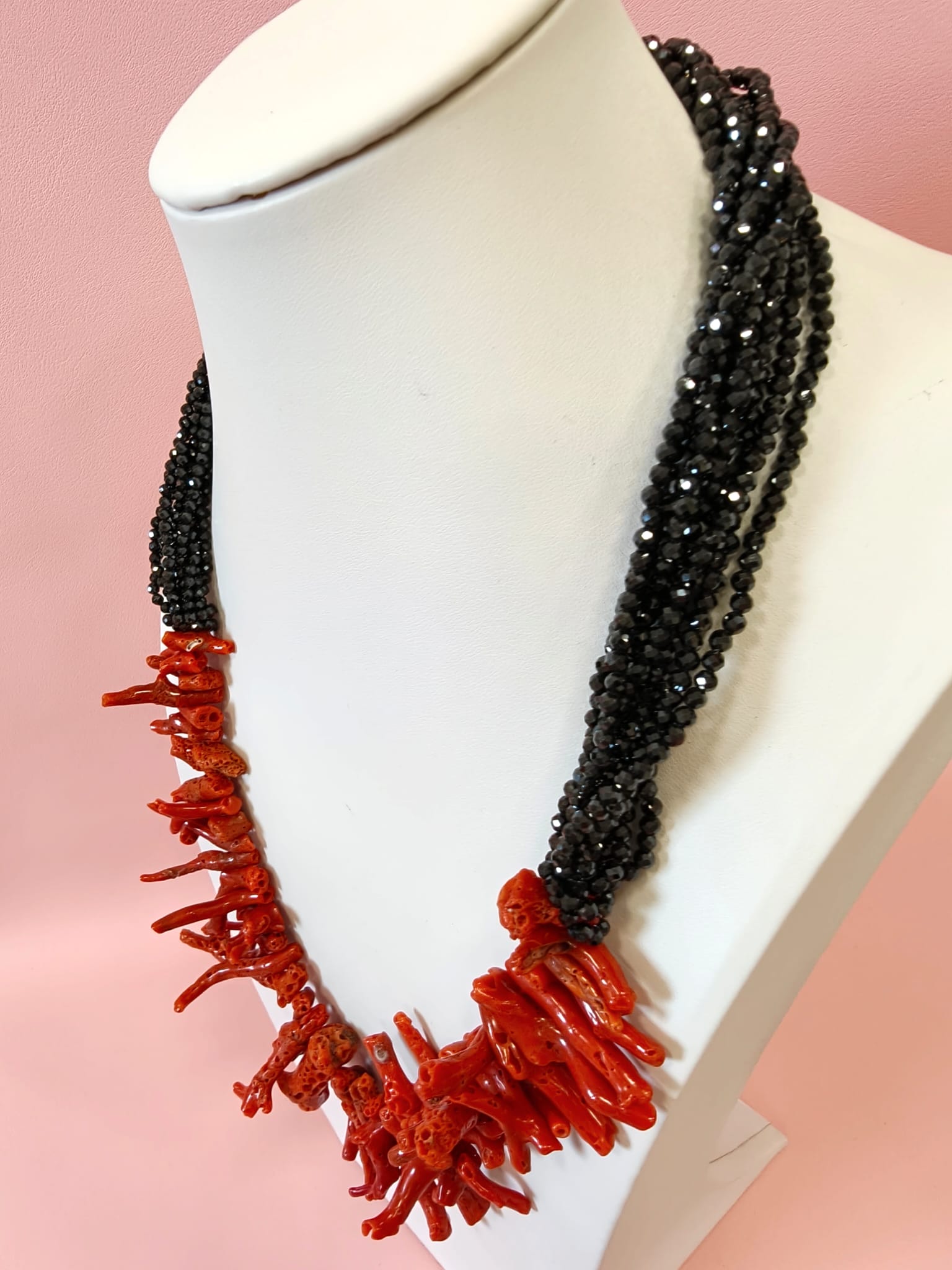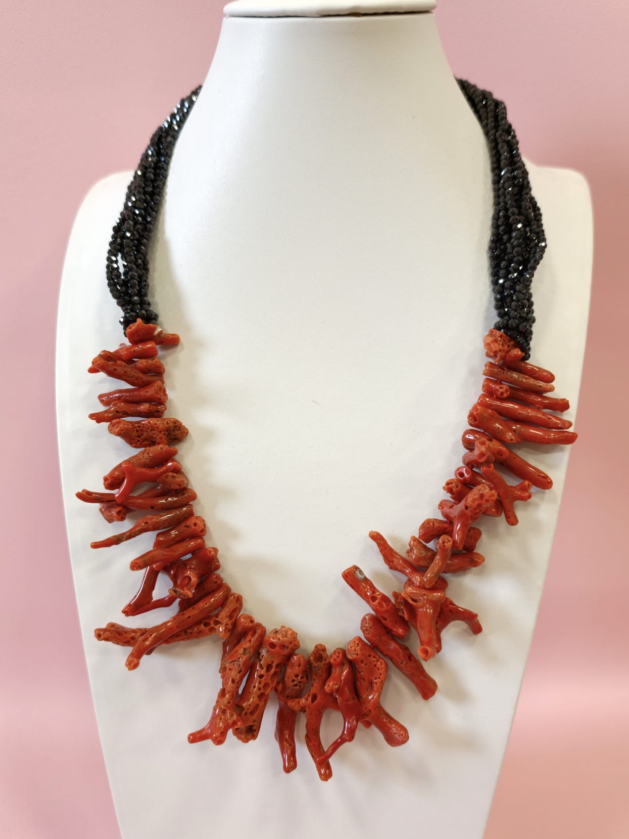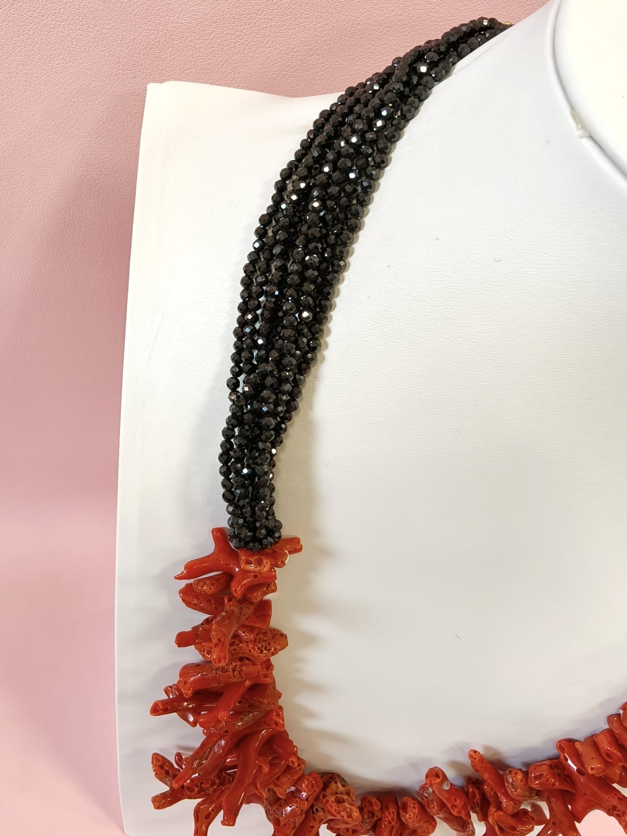Elegante Collana Corallo Mediterraneo Grezzo realizzata con fili di zirconi neri scintillanti e grandi rametti di corallo naturale del Mediterraneo. Un gioiello artigianale intenso e scenografico, pensato per chi ama indossare creazioni uniche e ricche di carattere.