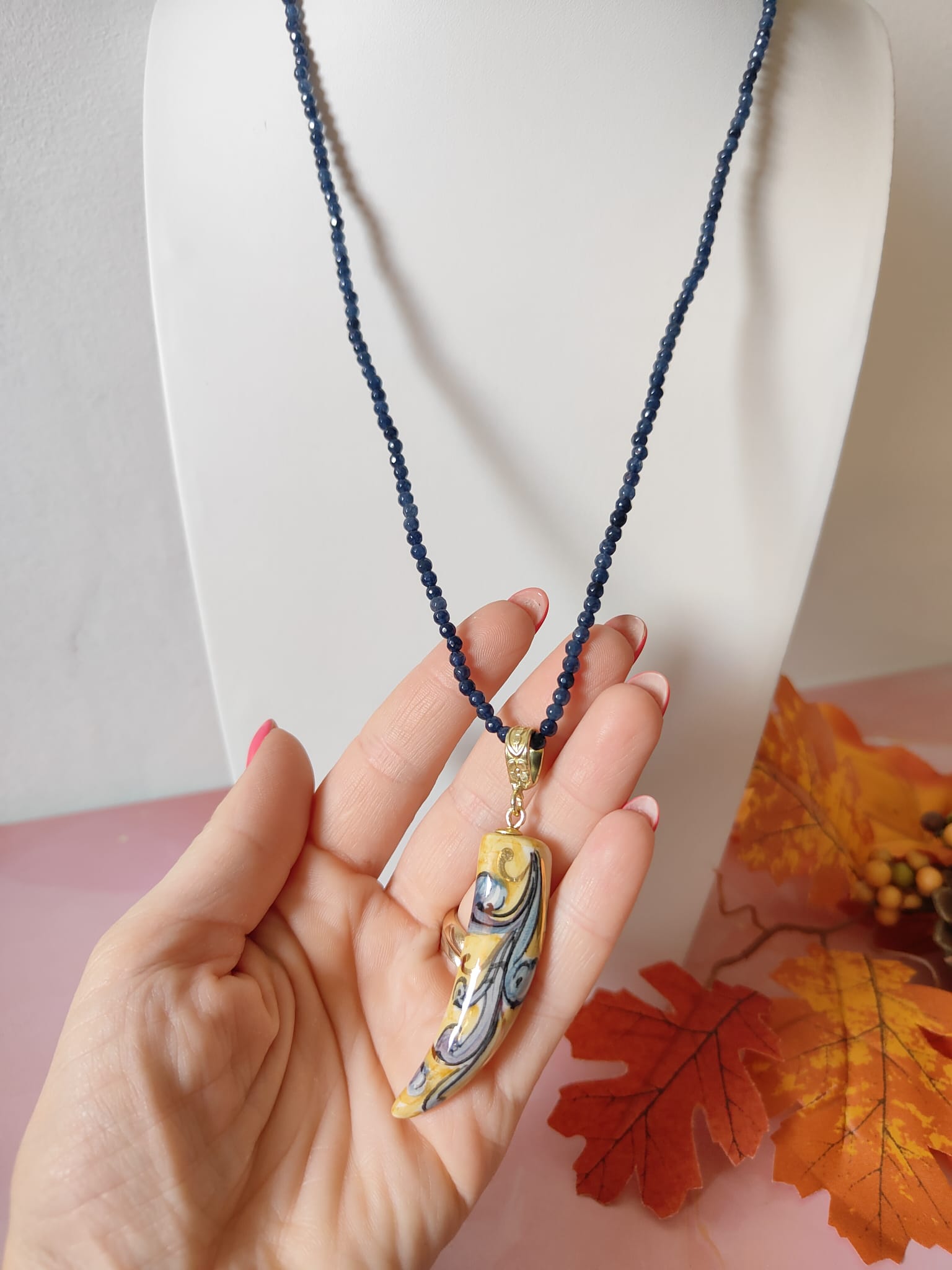 La collana corno in ceramica è un gioiello che unisce tradizione e design, trasformando un simbolo antico in un accessorio raffinato e moderno. Il corno, da sempre portafortuna, qui è realizzato in ceramica di Caltagirone dipinta a mano, con dettagli sinuosi e colori brillanti che lo rendono unico e ricco di significato.