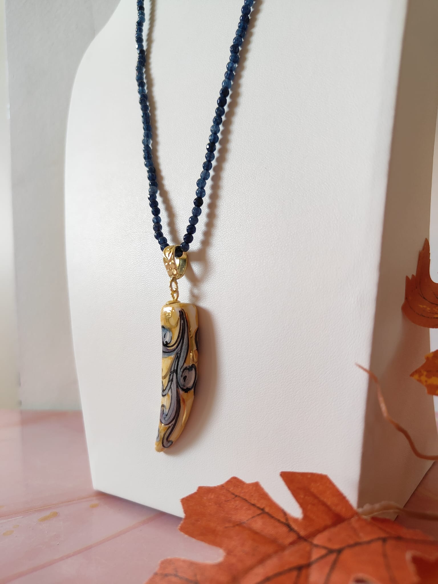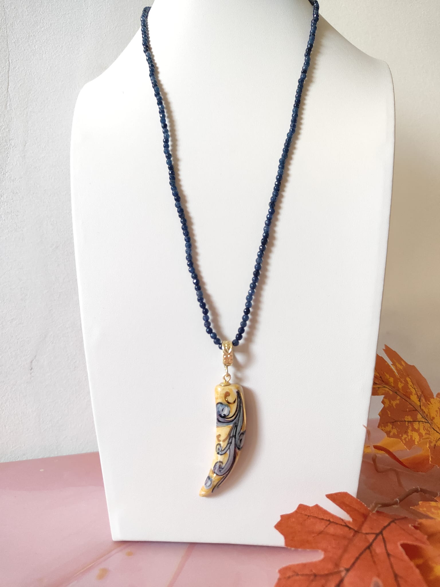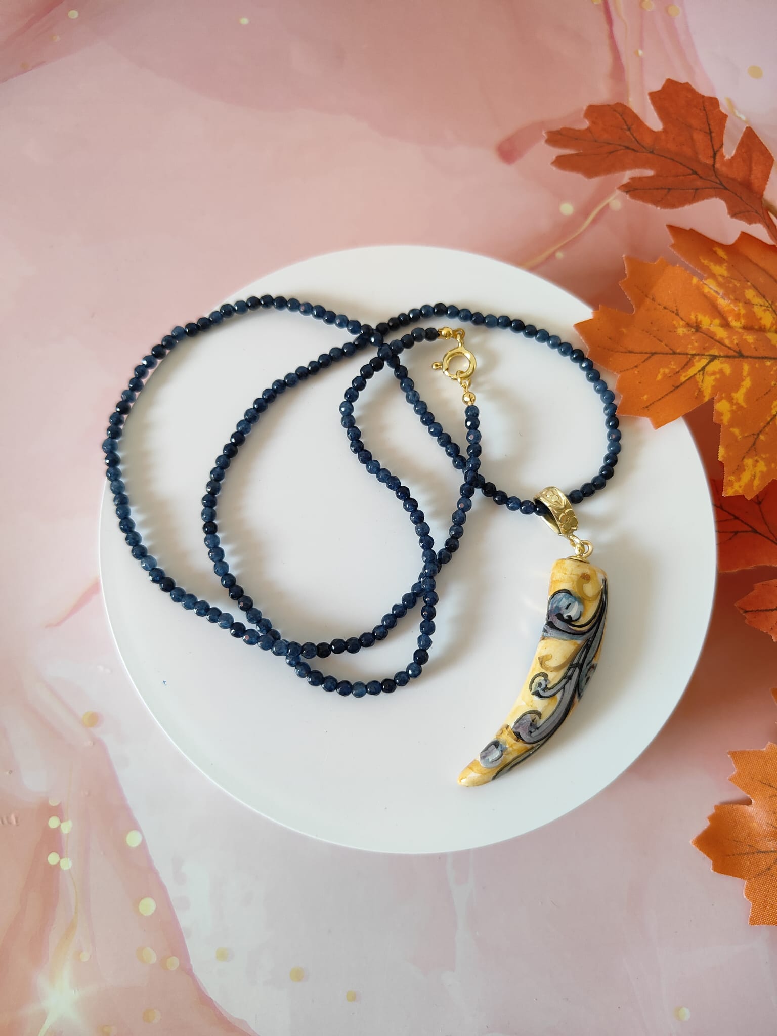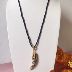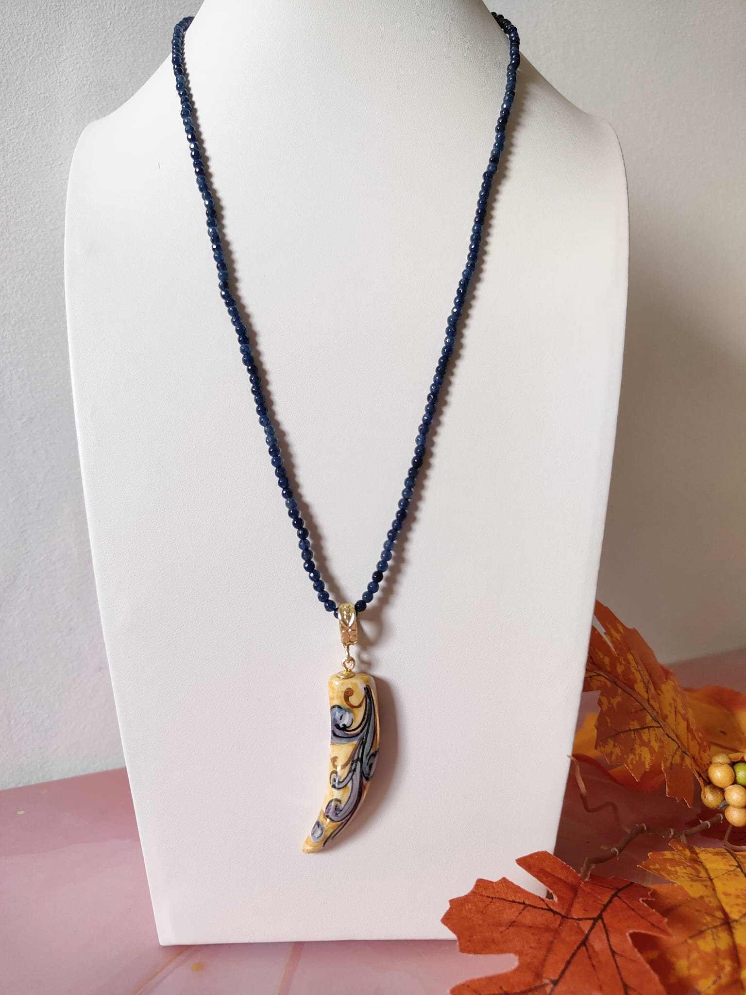 Ogni collana è realizzata con attenzione e maestria artigianale: il ciondolo in ceramica di Caltagirone viene modellato e dipinto a mano, rendendo ogni pezzo irripetibile. La combinazione tra la simbologia del corno, la bellezza delle pietre naturali e la lavorazione artigianale siciliana conferisce al gioiello un fascino particolare, ideale da indossare sia in occasioni eleganti sia per dare un tocco distintivo al quotidiano.