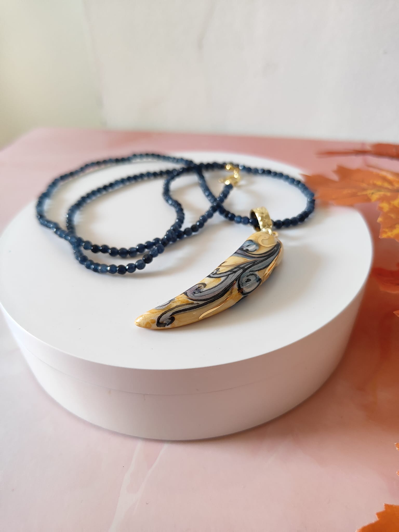 A impreziosire il ciondolo vi è una catenina composta da micro pietre di agata blu sfaccettata, scelta per la sua luminosità e profondità cromatica. La lavorazione delle pietre riflette la luce a ogni movimento, donando brillantezza al collo e mettendo in risalto il pendente. La chiusura, in argento 925 placcato oro, aggiunge un tocco di pregio e garantisce resistenza nel tempo.
