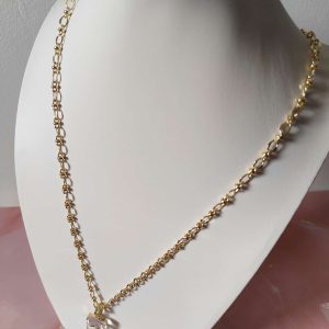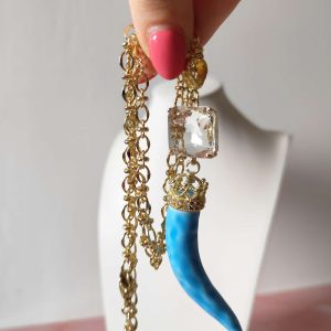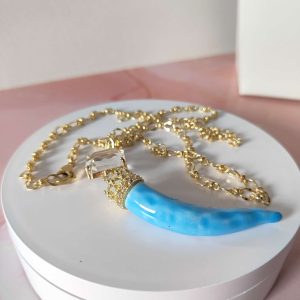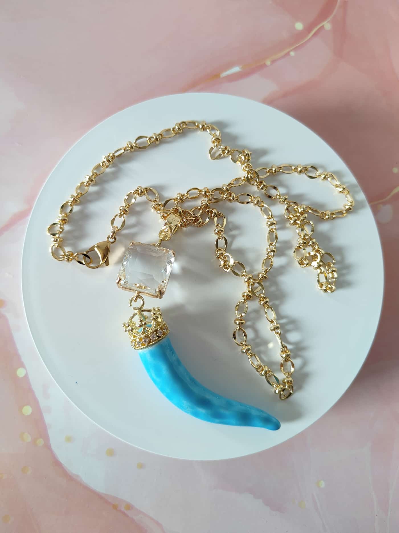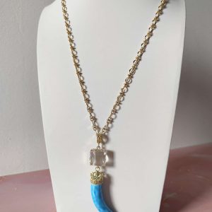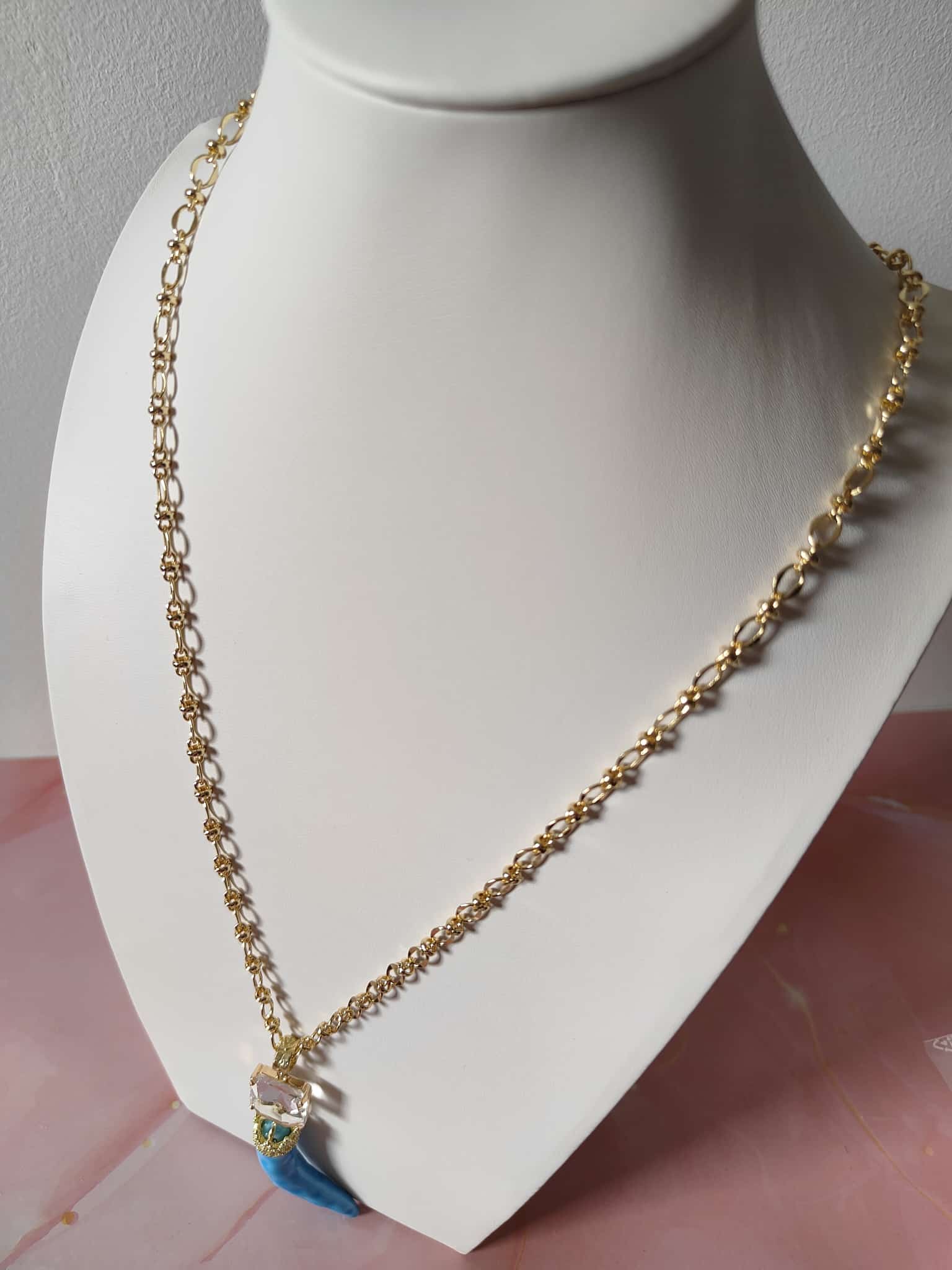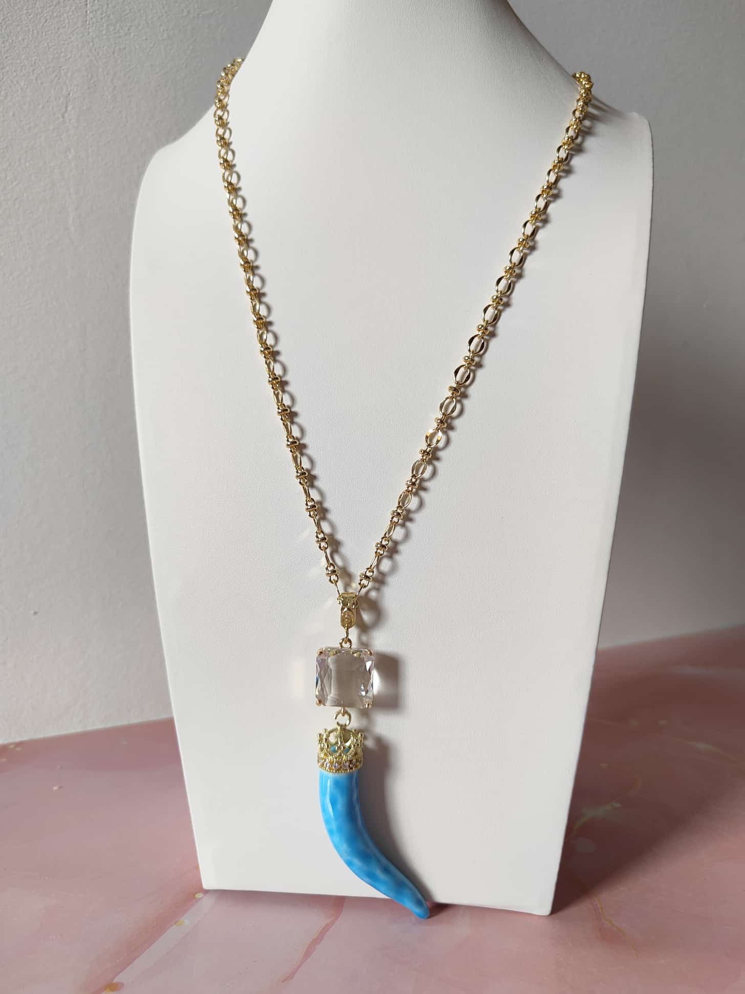 Il ciondolo è accompagnato da un quadratino in ottone con cristallo trasparente, che dona luminosità e un contrasto elegante con l’intensità del corno azzurro. L’intera composizione è montata su una catena in ottone dorato anallergico, lavorata con maglie decorative che aggiungono movimento e raffinatezza. La chiusura a moschettone in acciaio garantisce praticità e resistenza.