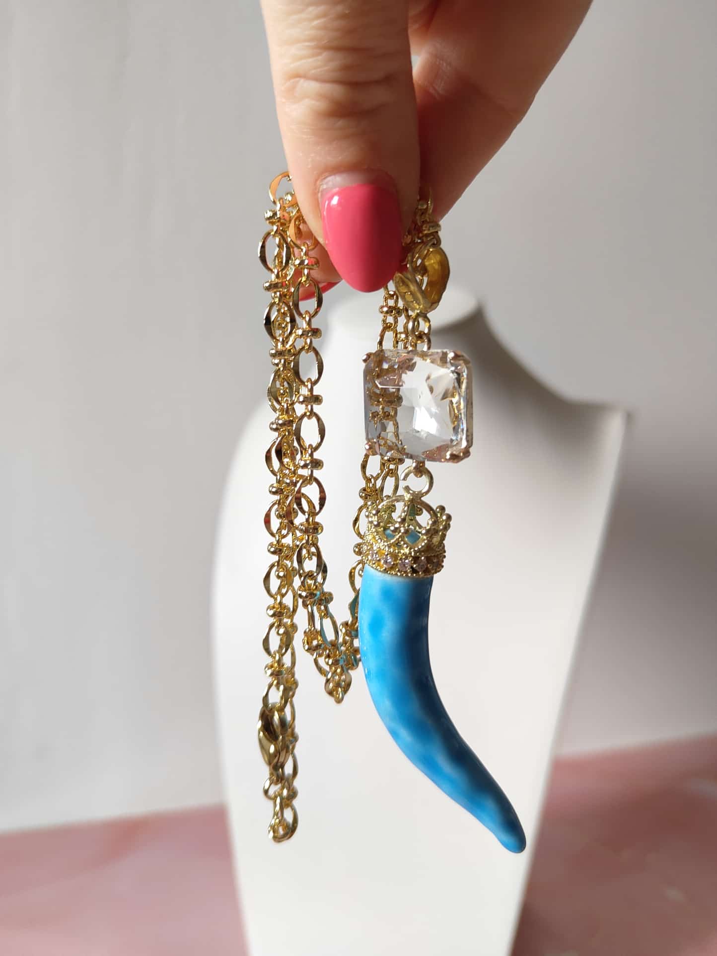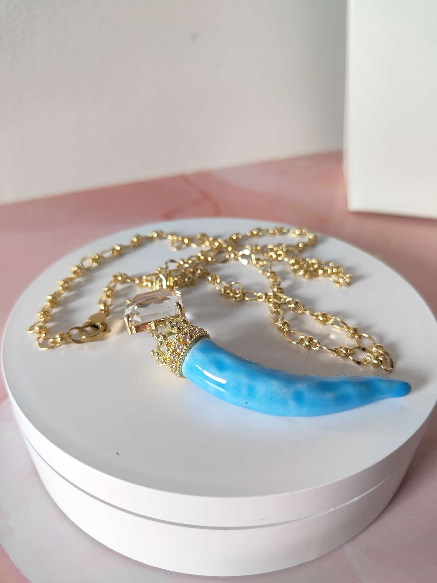 Il protagonista è il corno in ceramica smaltata di colore azzurro, realizzato con una finitura lucida che mette in risalto la brillantezza della superficie. Alla sua sommità, una splendida corona in ottone con zirconi incastonati impreziosisce il pendente, conferendogli un tocco regale e scintillante.