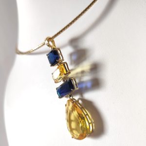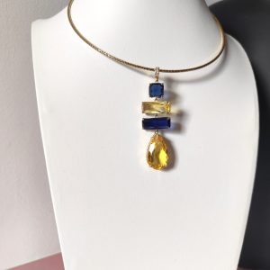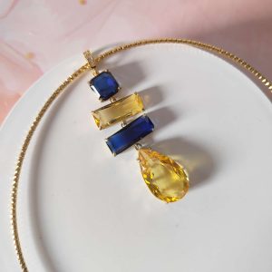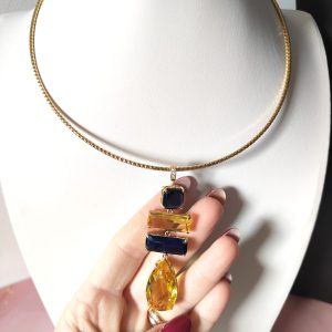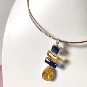 Il suo ciondolo geometrico alterna pietre dai tagli diversi — quadrato, rettangolare e a goccia — in tonalità intense di blu notte e giallo ambra, capaci di catturare la luce in ogni movimento. Le sfumature calde e fredde si fondono armoniosamente, dando vita a un contrasto cromatico elegante e magnetico.