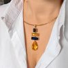 La montatura in ottone dorato, impreziosita da piccoli zirconi incastonati, aggiunge una scintilla delicata che amplifica la brillantezza dei colori. La struttura rigida in acciaio con chiusura a moschettone e catenina regolabile assicura comfort e una perfetta vestibilità, adattandosi a ogni scollatura e occasione.