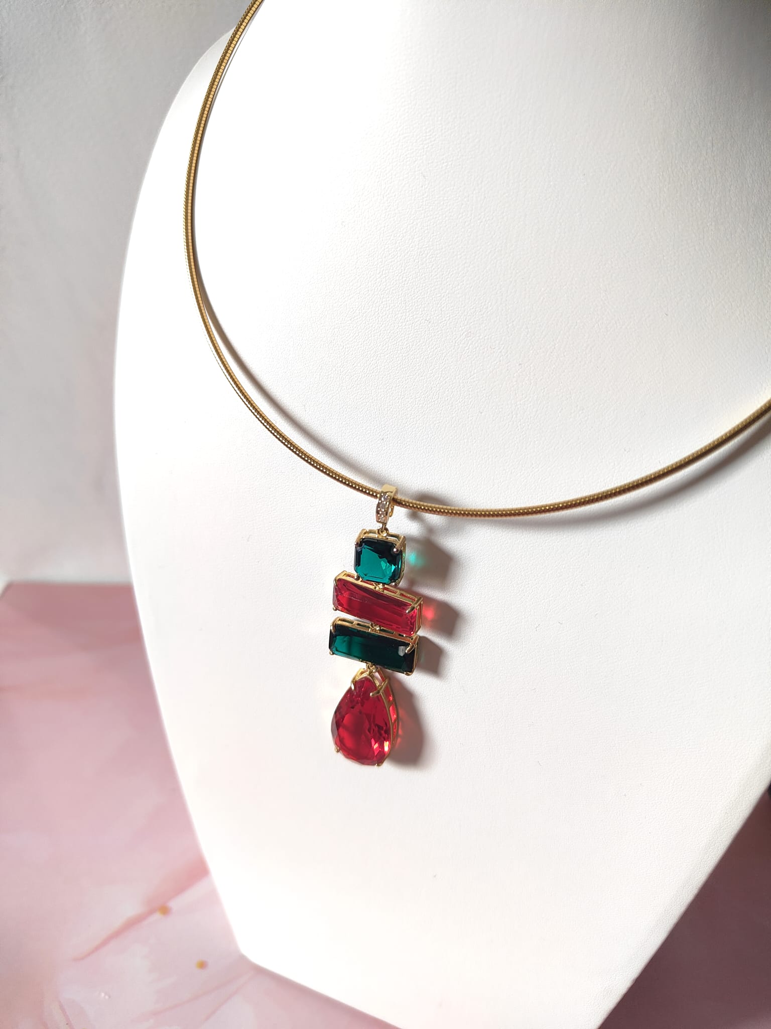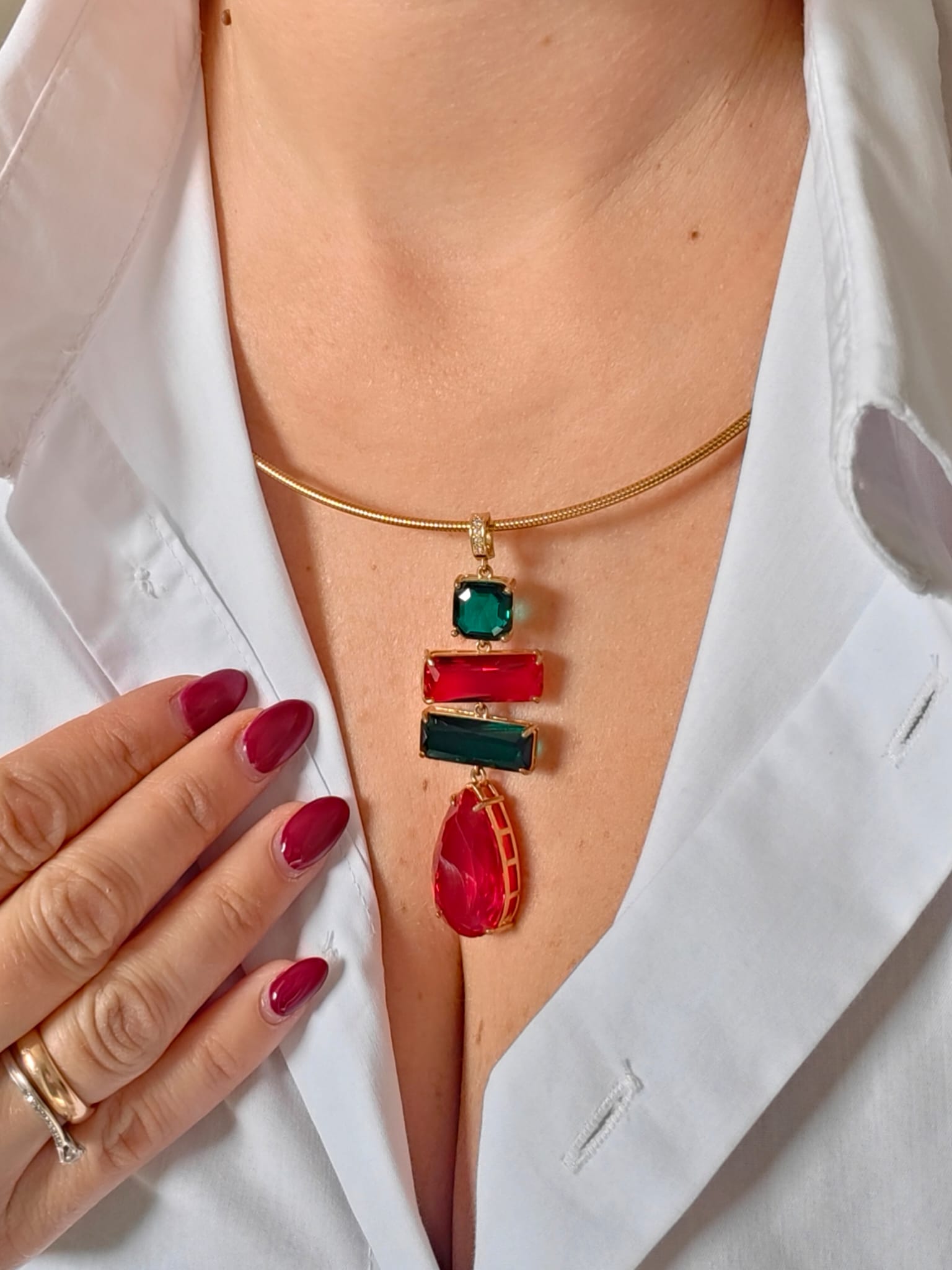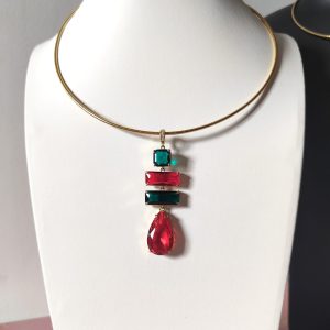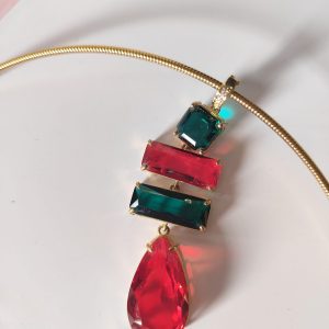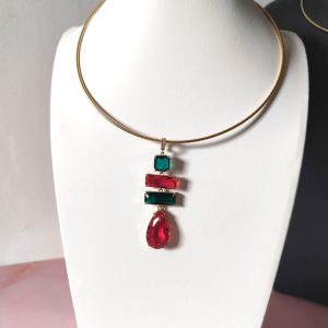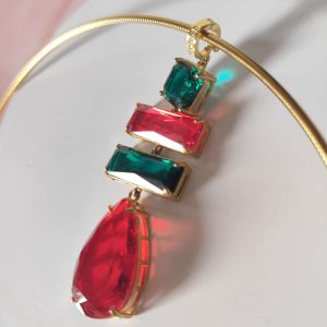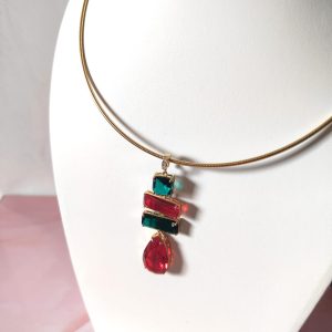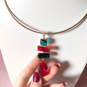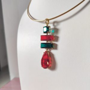La collana cristalli rossi e verdi è un inno alla luce e al colore, una creazione che cattura lo sguardo e racconta eleganza in ogni dettaglio. Il suo design rigido in acciaio dorato incornicia un pendente scenografico composto da quattro cristalli dalle forme geometriche, incastonati con cura artigianale per riflettere la luce da ogni angolazione.