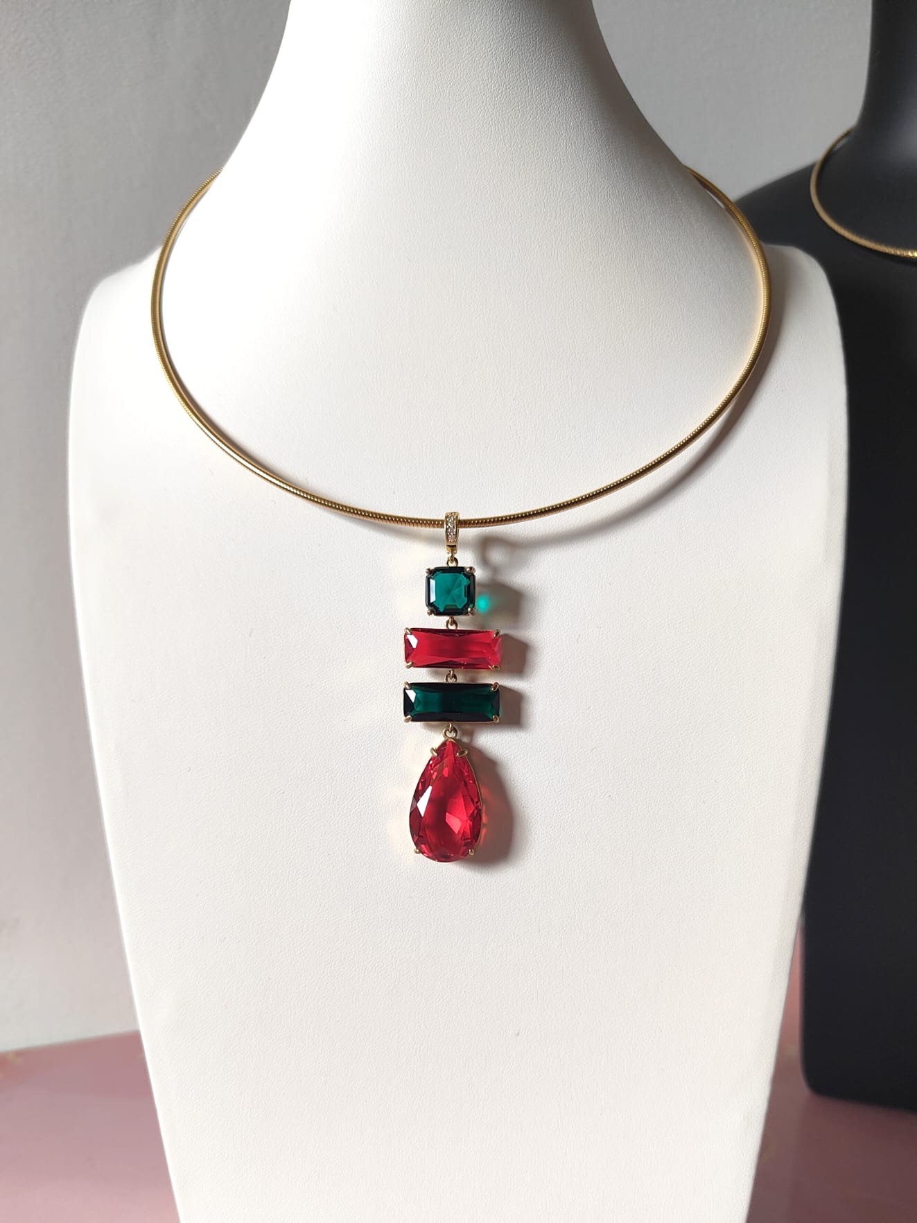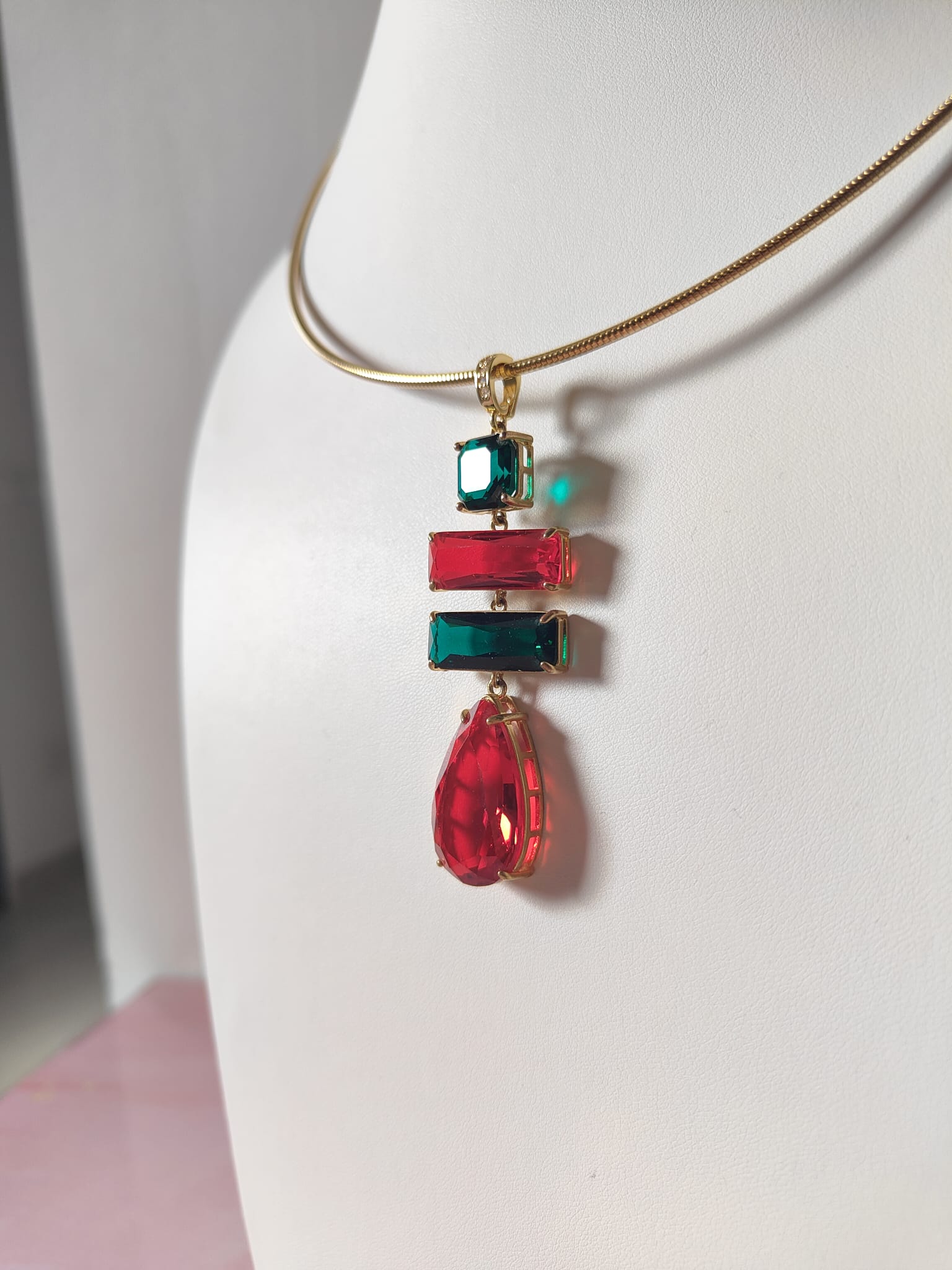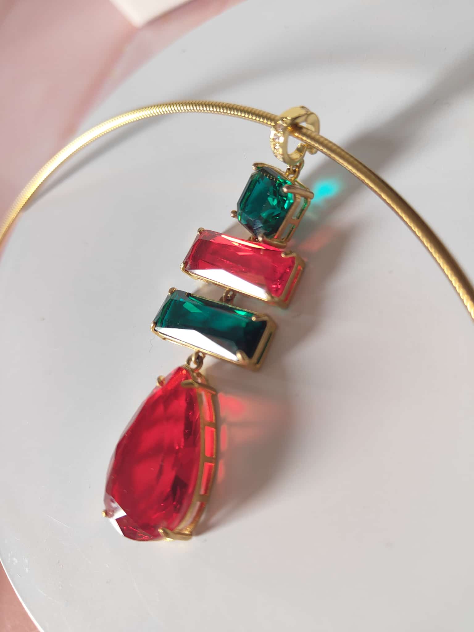 La collana cristalli rossi e verdi è un inno alla luce e al colore, una creazione che cattura lo sguardo e racconta eleganza in ogni dettaglio. Il suo design rigido in acciaio dorato incornicia un pendente scenografico composto da quattro cristalli dalle forme geometriche, incastonati con cura artigianale per riflettere la luce da ogni angolazione.