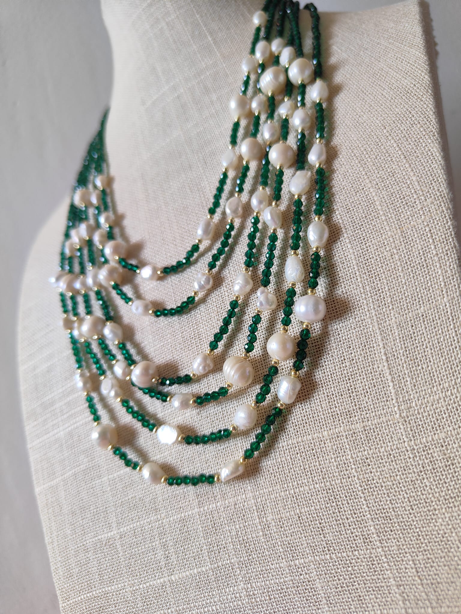 La collana cristalli verdi e perle è una creazione artigianale che unisce armonia, eleganza e fascino senza tempo. Un gioiello pensato per chi ama distinguersi con stile, capace di valorizzare ogni look con la sua luce naturale e la sua energia raffinata.