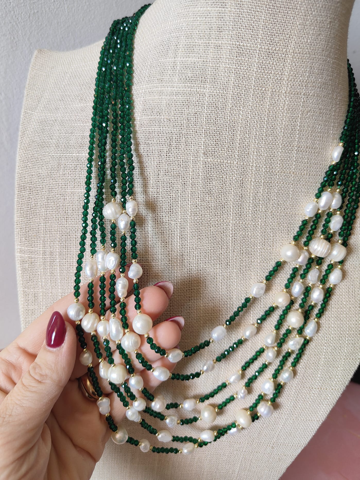 Questa collana cristalli verdi e perle è perfetta per ogni occasione: da una cerimonia elegante a una serata estiva, fino a un semplice outfit quotidiano che merita un tocco prezioso. È un gioiello che racconta una storia di artigianalità, passione e bellezza naturale, realizzato interamente a mano con materiali di alta qualità.