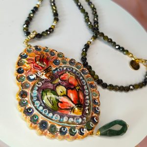 La collana cuore sacro e tormalina è una creazione esclusiva, un gioiello che unisce il potere delle pietre naturali all’arte della ceramica dipinta a mano. Un pezzo unico pensato per chi desidera indossare qualcosa di irripetibile, capace di raccontare emozioni e bellezza con un linguaggio raffinato e simbolico.