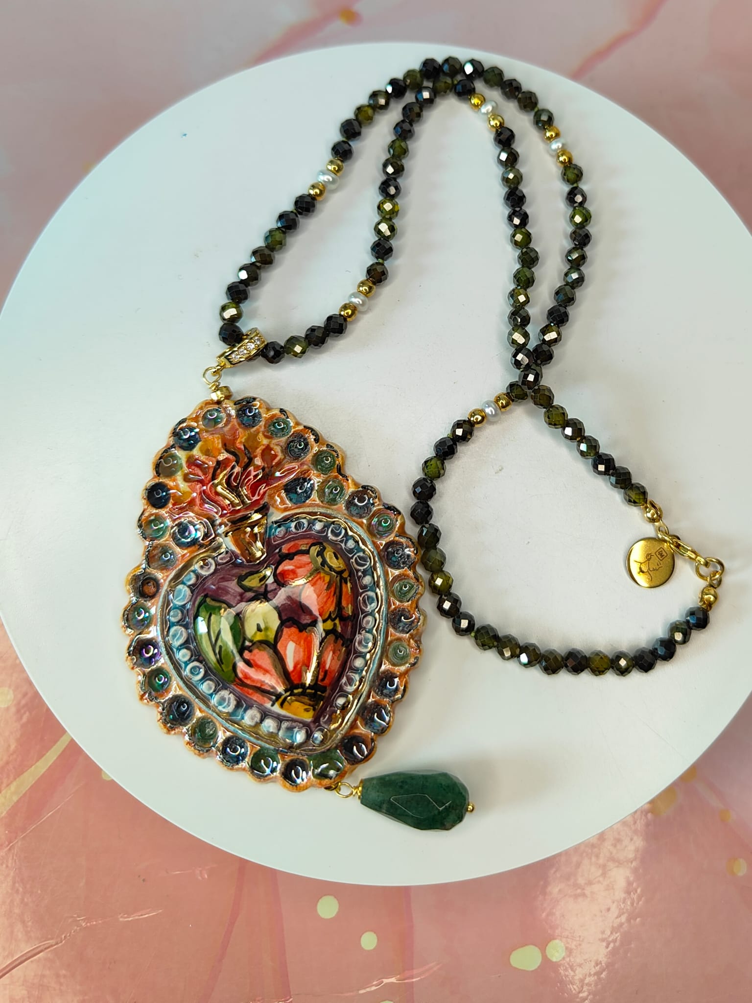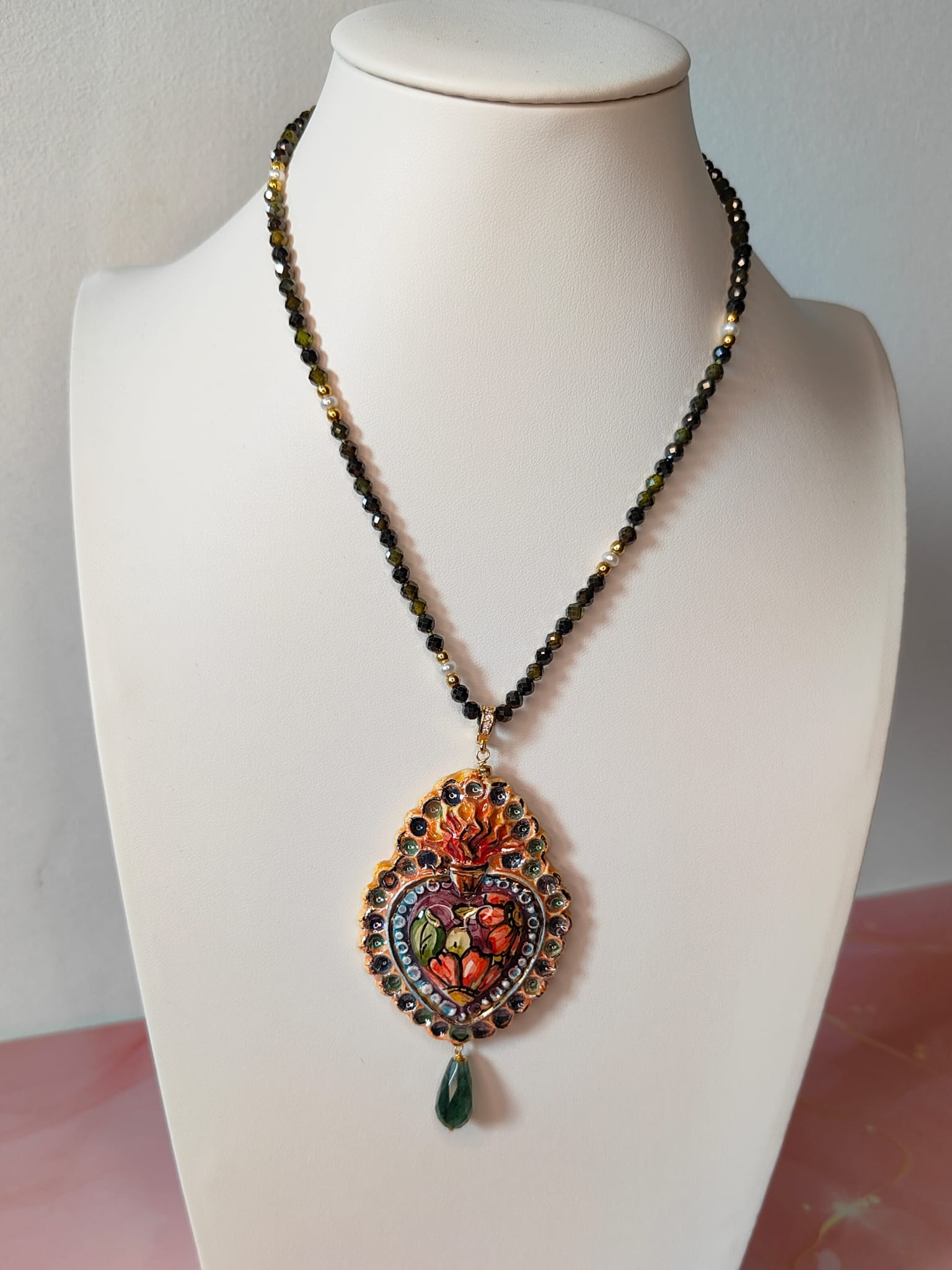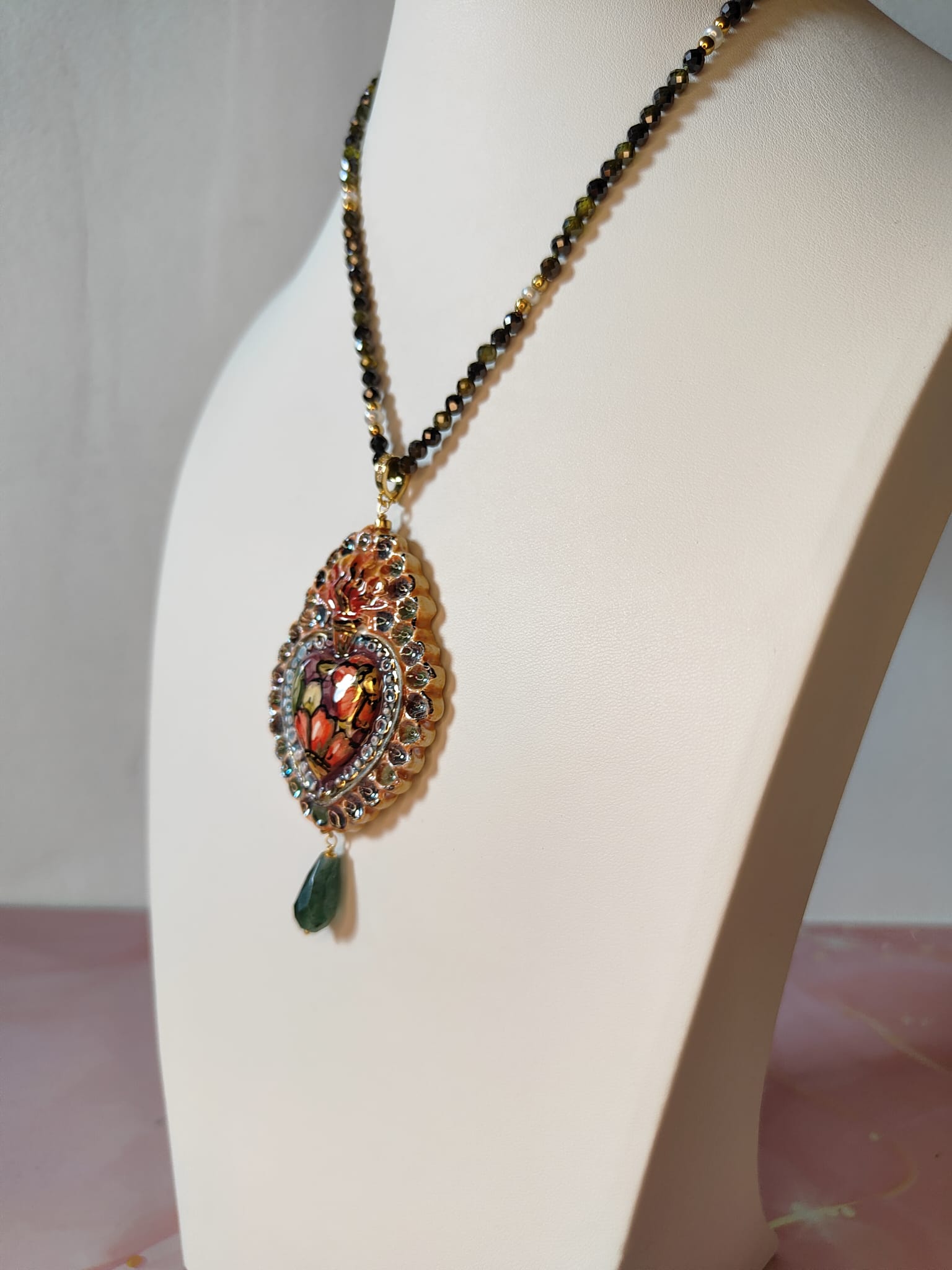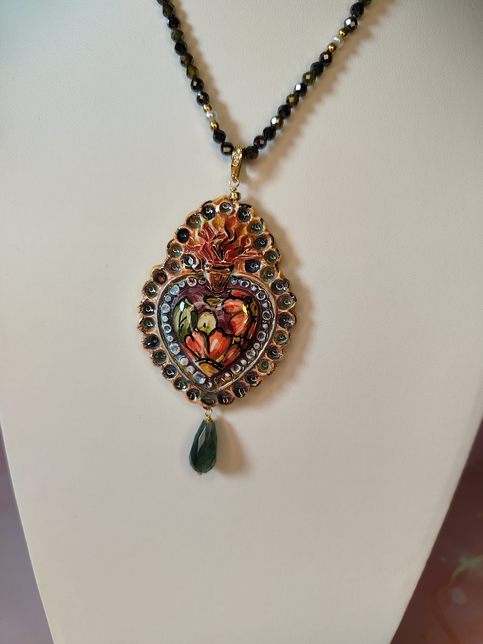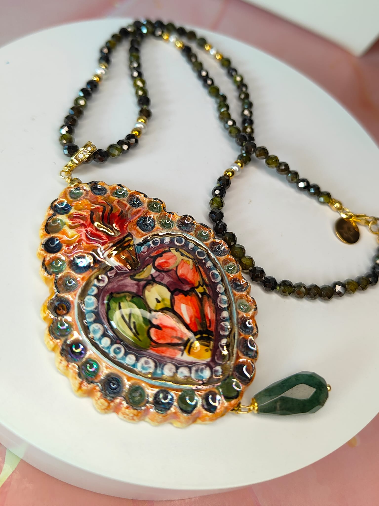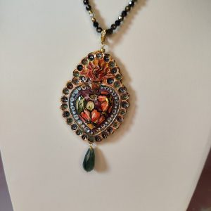 Il pendente a forma di cuore sacro è realizzato in ceramica artistica, modellato e decorato a mano con colori vibranti che spaziano dal rosso intenso al verde oliva, con riflessi dorati che ne esaltano i dettagli tridimensionali. Ogni pennellata è unica, rendendo il gioiello una piccola opera d’arte.