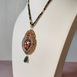 La catena è composta da tormaline verdi sfaccettate, pietre luminose che creano un gioco di riflessi naturali a ogni movimento. La tormalina è considerata una pietra di protezione e armonia, simbolo di equilibrio e forza interiore. La sua tonalità verde scuro, con leggere sfumature dorate, si abbina perfettamente ai colori caldi del pendente, creando un contrasto raffinato ed elegante.