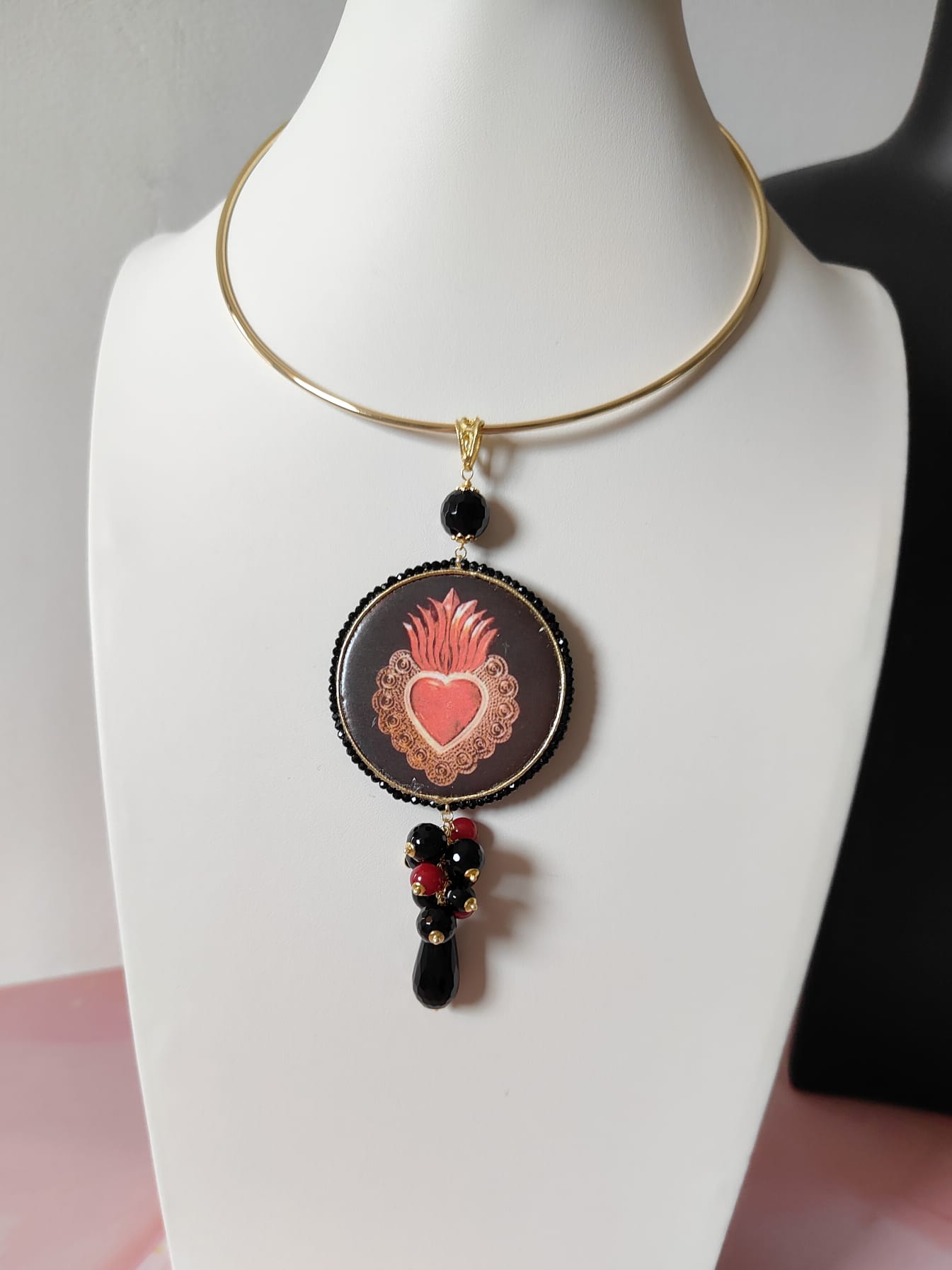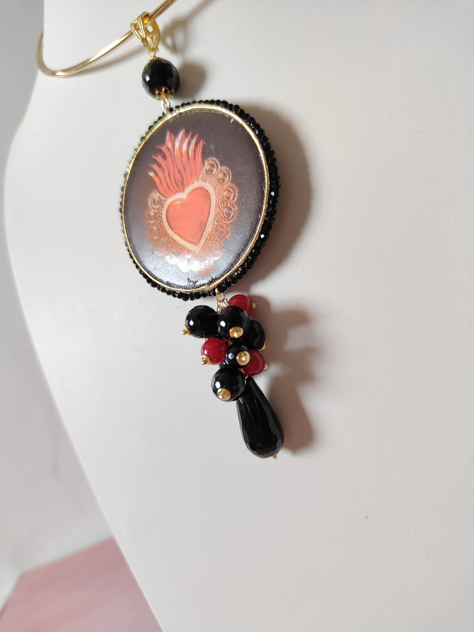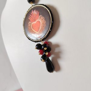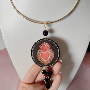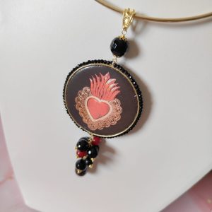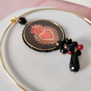 Il pendente rotondo, decorato con un cuore sacro su maiolica, cattura subito l’attenzione. Le sfumature rosse e dorate emergono con intensità sul fondo scuro, raccontando una storia di passione e protezione. La cornice, rifinita con cristalli neri, esalta il motivo centrale e dona profondità alla composizione.