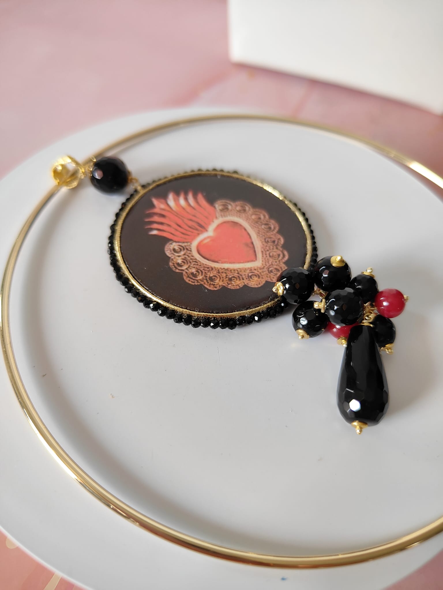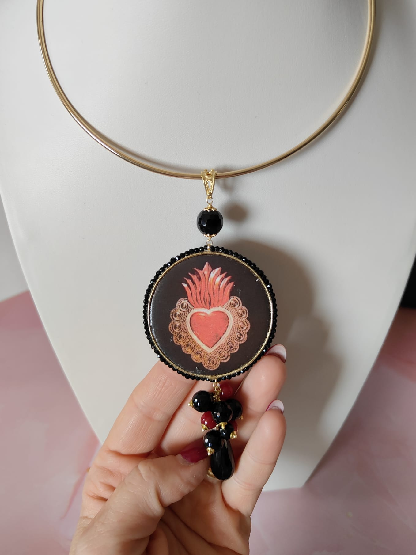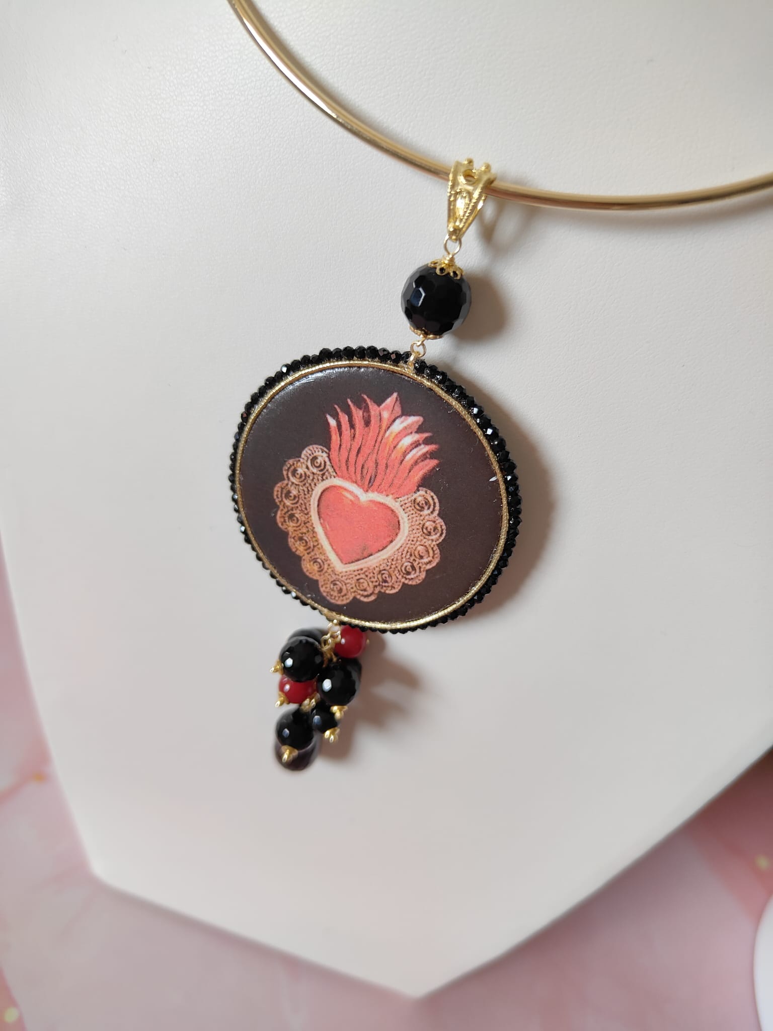 Il pendente rotondo, decorato con un cuore sacro su maiolica, cattura subito l’attenzione. Le sfumature rosse e dorate emergono con intensità sul fondo scuro, raccontando una storia di passione e protezione. La cornice, rifinita con cristalli neri, esalta il motivo centrale e dona profondità alla composizione.