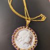 Materiali: cammeo sardonico inciso a mano, argento 925 placcato oro, perle d’acqua dolce