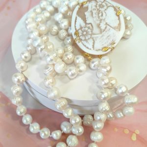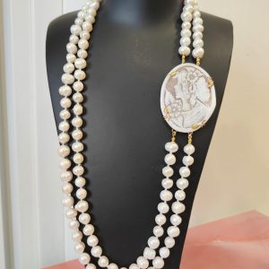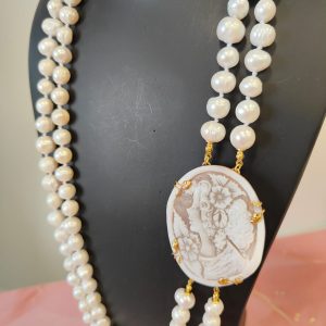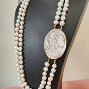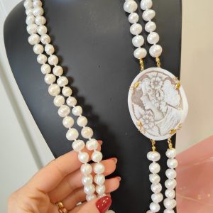 Questa preziosa collana di perle e cammeo nasce dall’incontro tra la delicatezza delle perle d’acqua dolce e l’intensità narrativa del cammeo sardonico inciso a mano. Ogni dettaglio si armonizza con naturalezza, creando un gioiello che esprime femminilità e carattere. L’effetto finale è ricco, ma equilibrato, perfetto per chi desidera un accessorio capace di distinguersi con eleganza.