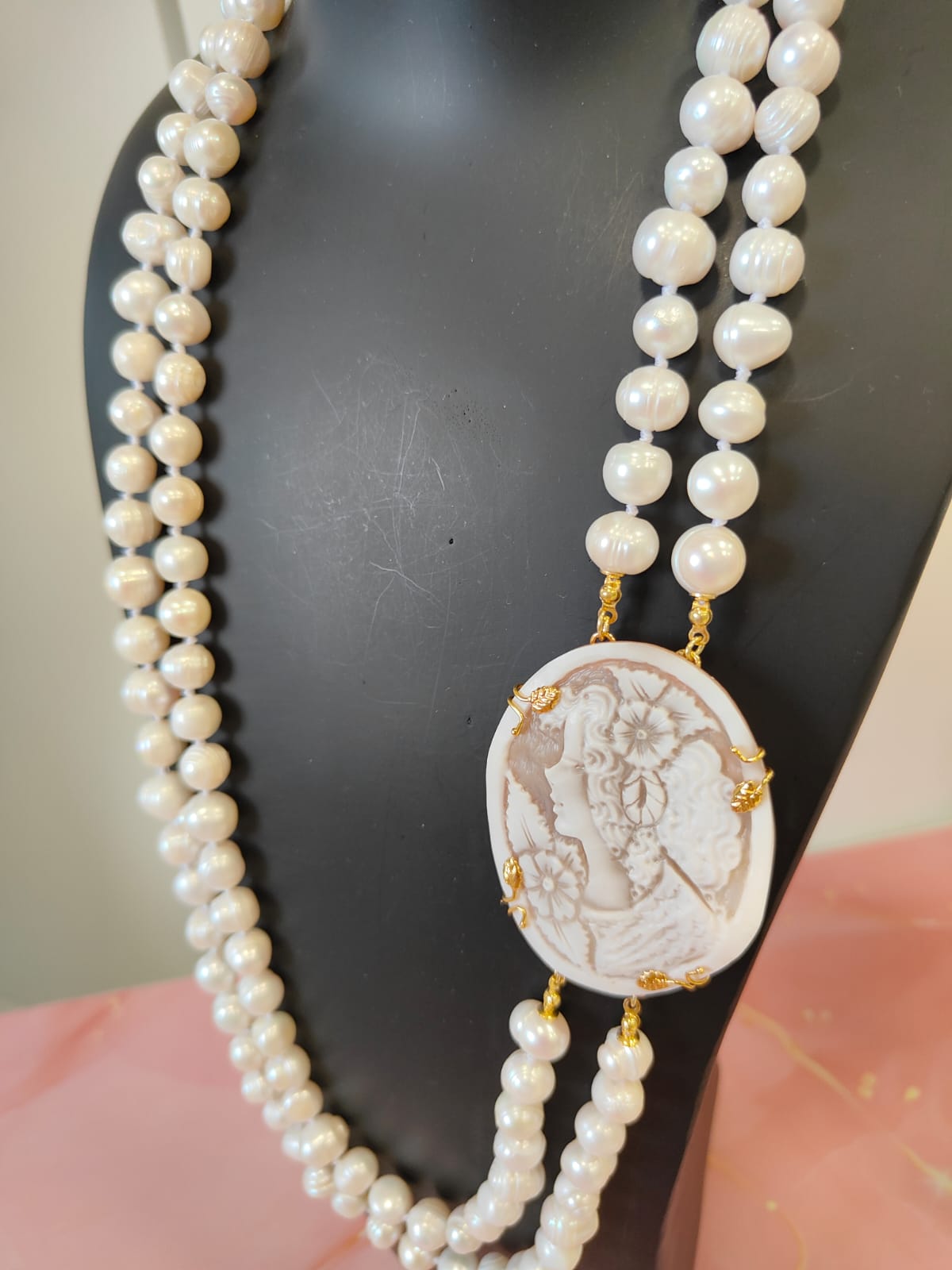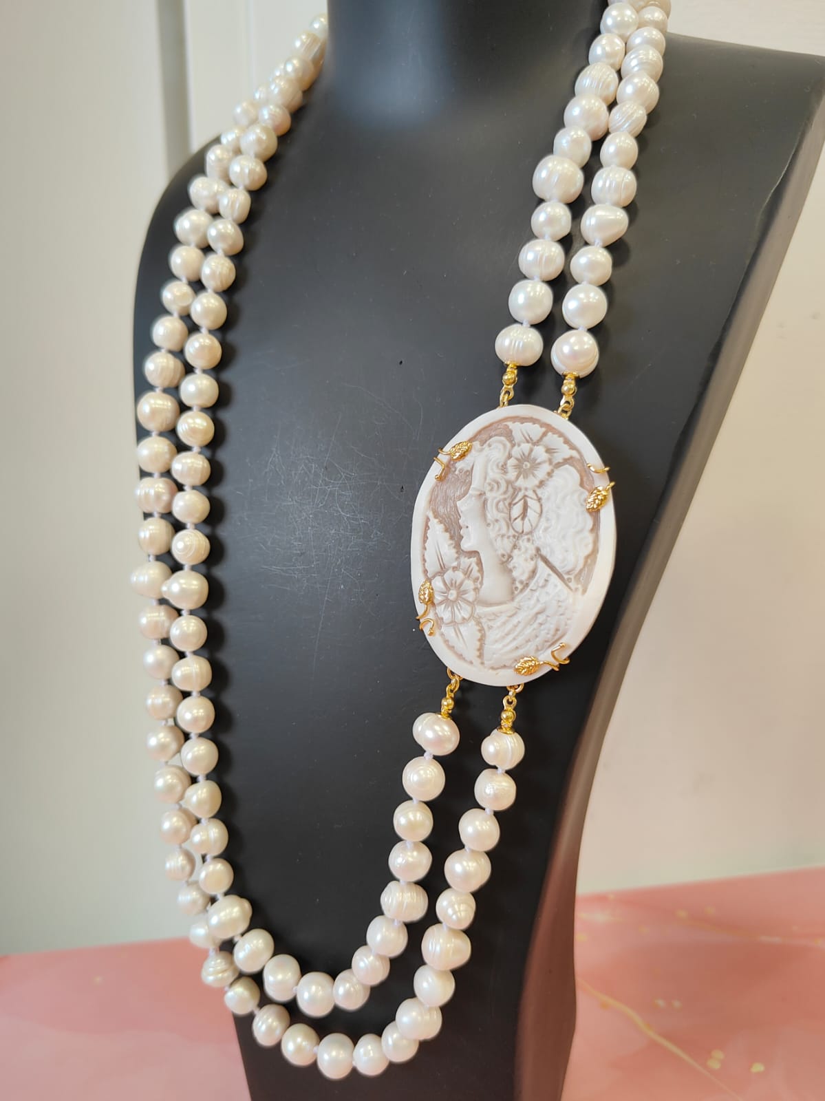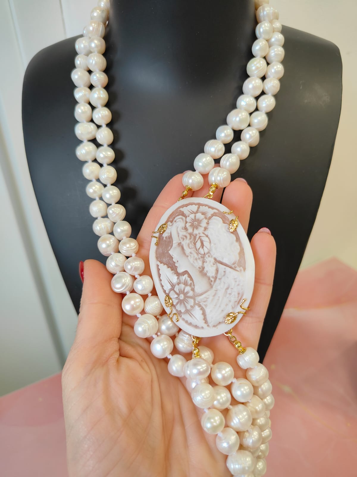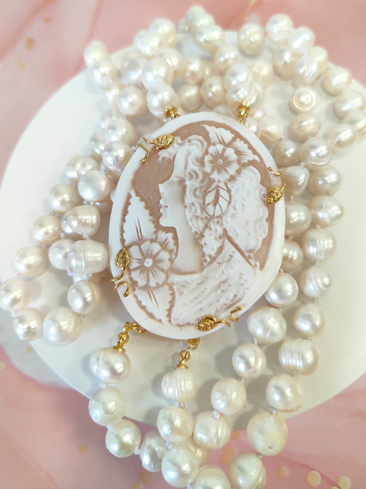 Questa creazione è stata realizzata come pezzo unico, completamente fedele alle immagini, pensata per chi ama l’artigianato autentico, le perle di qualità e la poesia dei cammei incisi. Un gioiello che non passa inosservato e che racconta una storia fin dal primo sguardo.