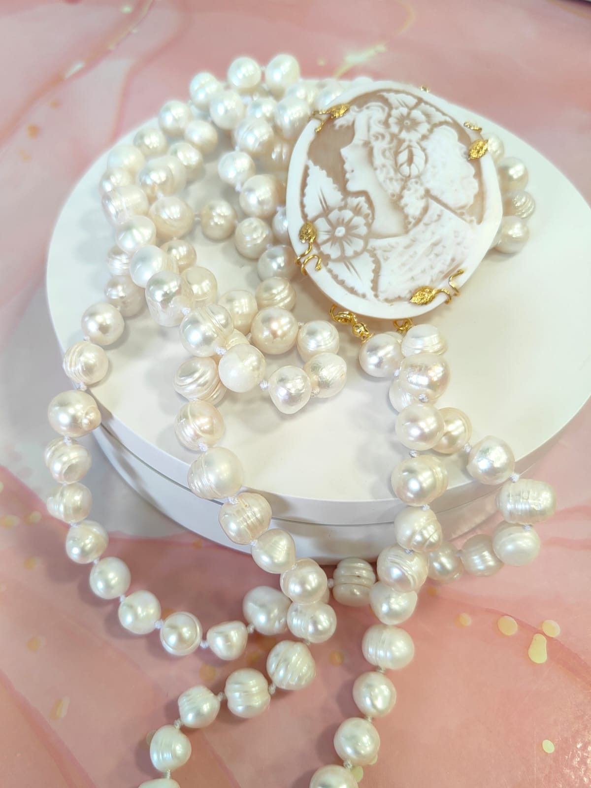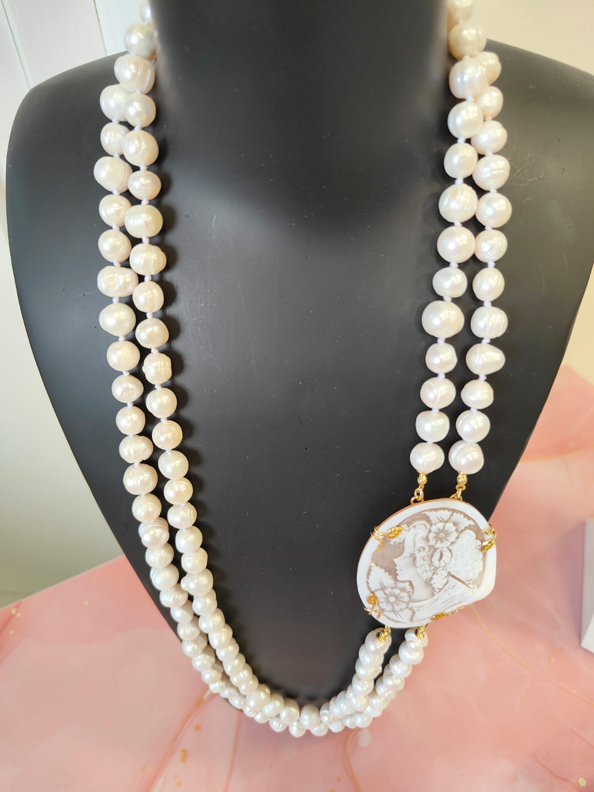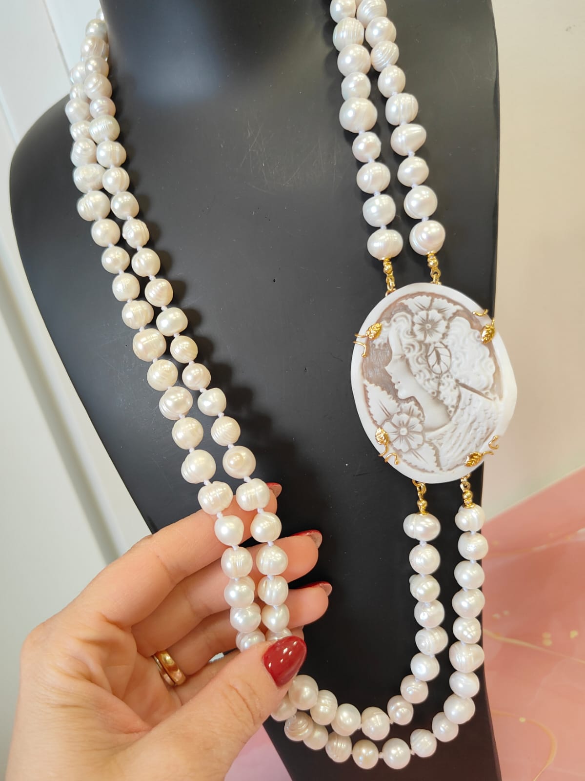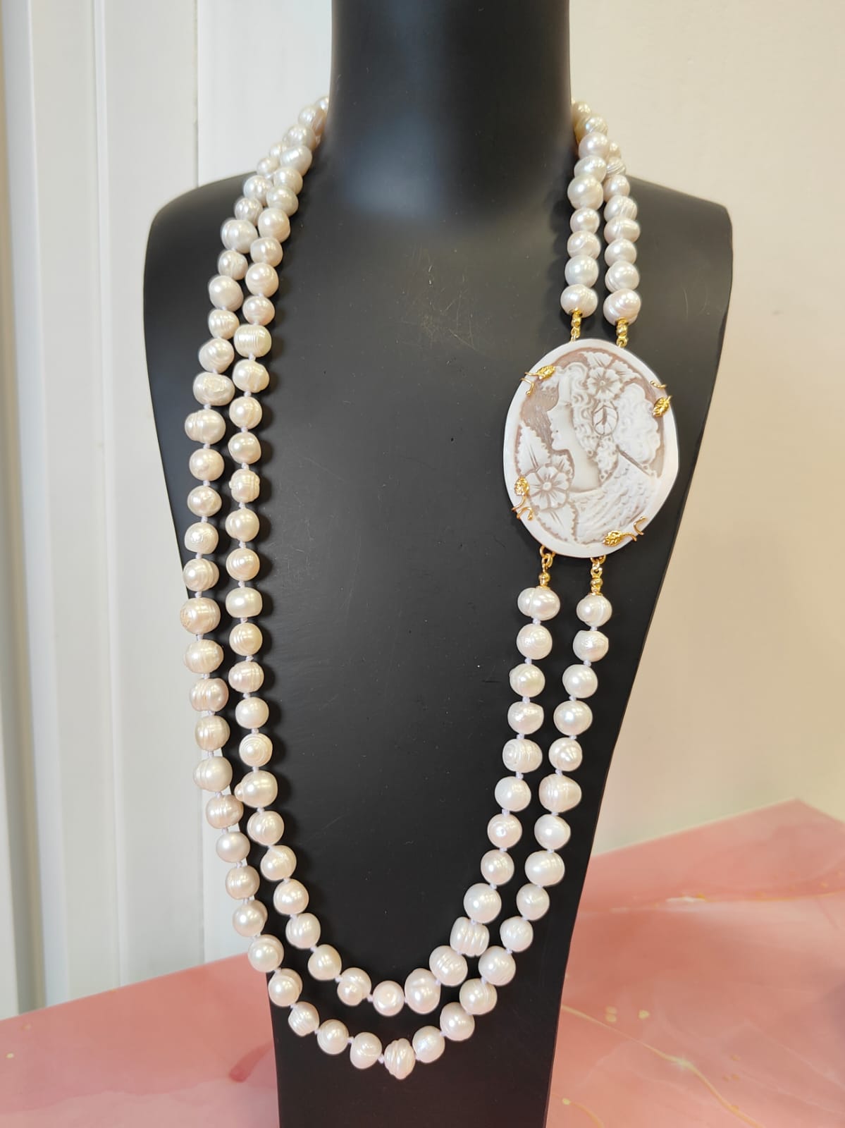 Questa creazione è stata realizzata come pezzo unico, completamente fedele alle immagini, pensata per chi ama l’artigianato autentico, le perle di qualità e la poesia dei cammei incisi. Un gioiello che non passa inosservato e che racconta una storia fin dal primo sguardo.