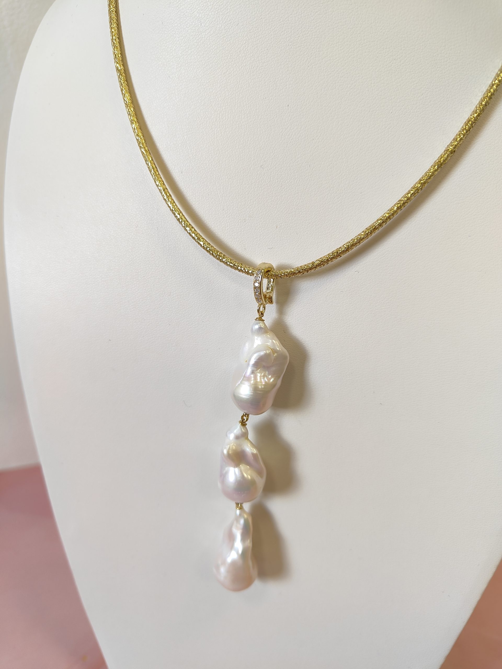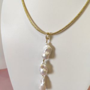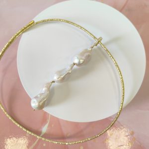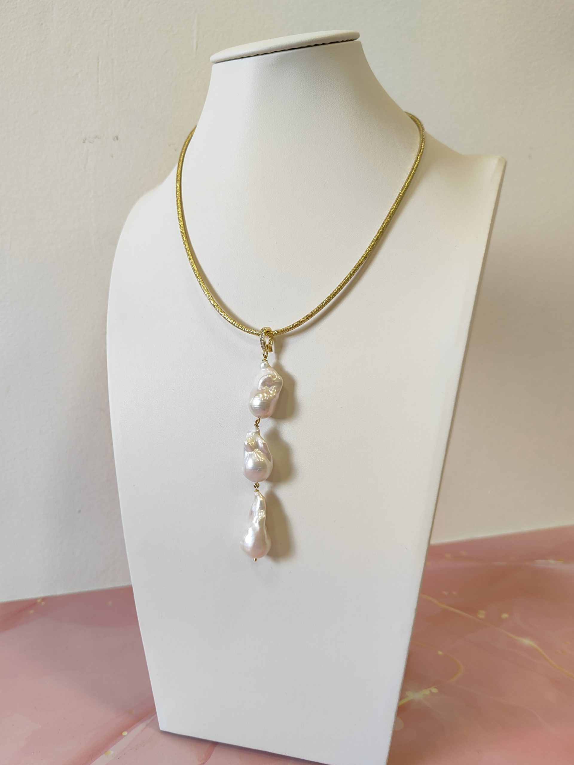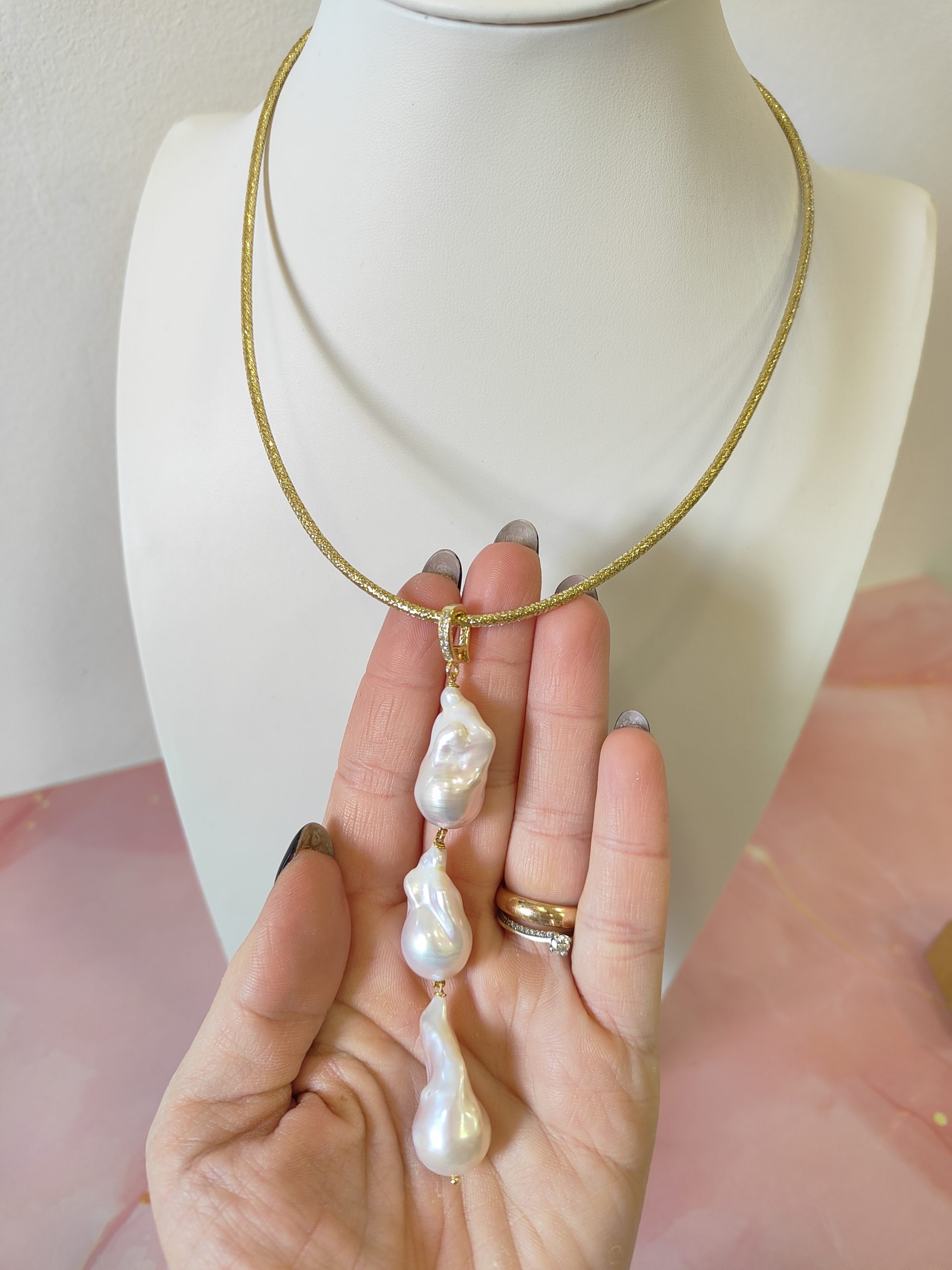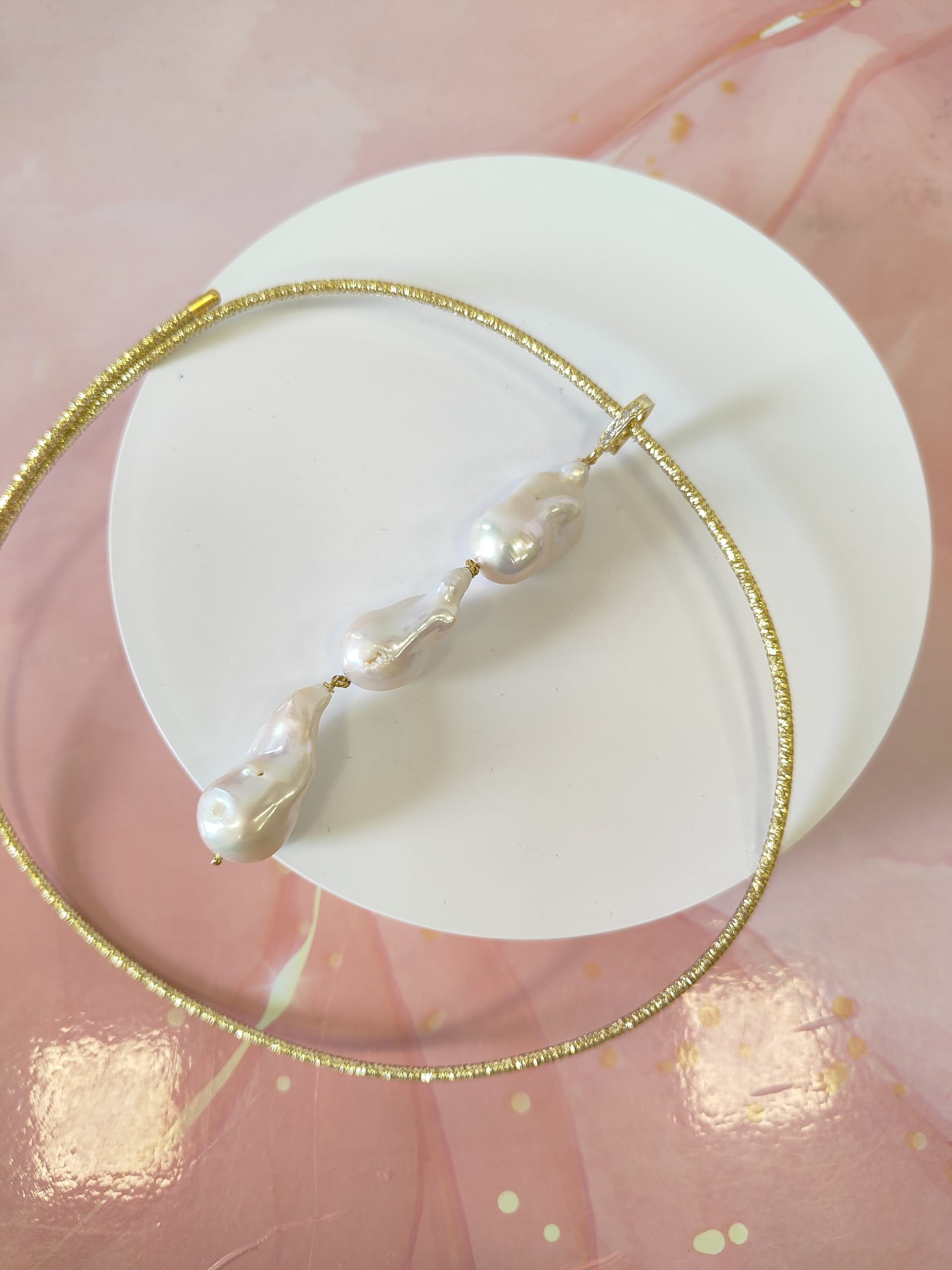 La collana dorata tripla barocca è una creazione raffinata che unisce eleganza contemporanea e fascino naturale. Realizzata con un cordoncino magnetico in stoffa dorata dalla texture brillante, si adagia con morbidezza sul décolleté creando un effetto luminoso e sofisticato. La protagonista indiscussa è la cascata di tre perle barocche naturali, selezionate una ad una per forma, iridescenza e armonia cromatica. Le loro superfici organiche riflettono la luce con sfumature madreperlacee, rendendo ogni collana diversa da qualsiasi altra.