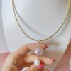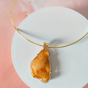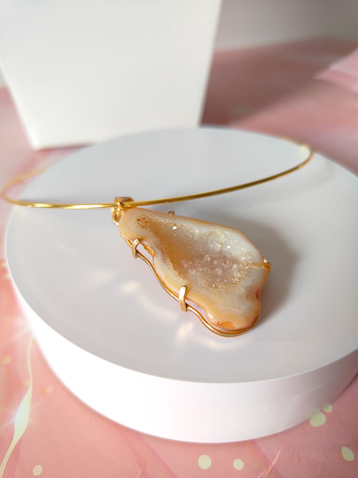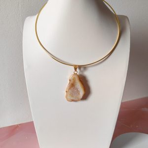 Il girocollo rigido in ottone dorato abbraccia con eleganza la linea del collo. La sua struttura sottile dona leggerezza, mentre la finitura dorata aggiunge un tocco di modernità. Inoltre, la montatura sinuosa valorizza la forma organica della pietra senza appesantirla, mantenendo l’armonia tra forza e delicatezza.