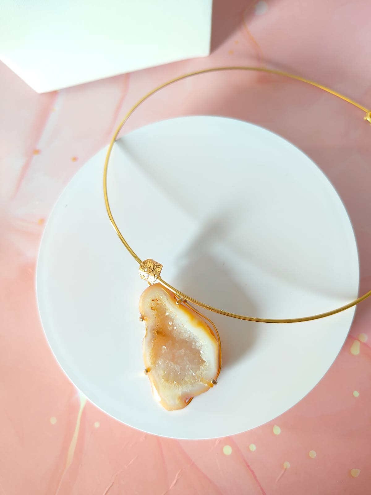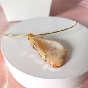 La collana drusa naturale unisce luce e materia in un perfetto equilibrio. È una creazione che cattura lo sguardo e l’immaginazione grazie al suo fascino minerale. Il ciondolo, protagonista assoluto, custodisce una drusa naturale dalle tonalità calde dell’albicocca e dai riflessi cristallini del quarzo. Così, ogni movimento rivela un gioco di luce raffinato e vibrante.