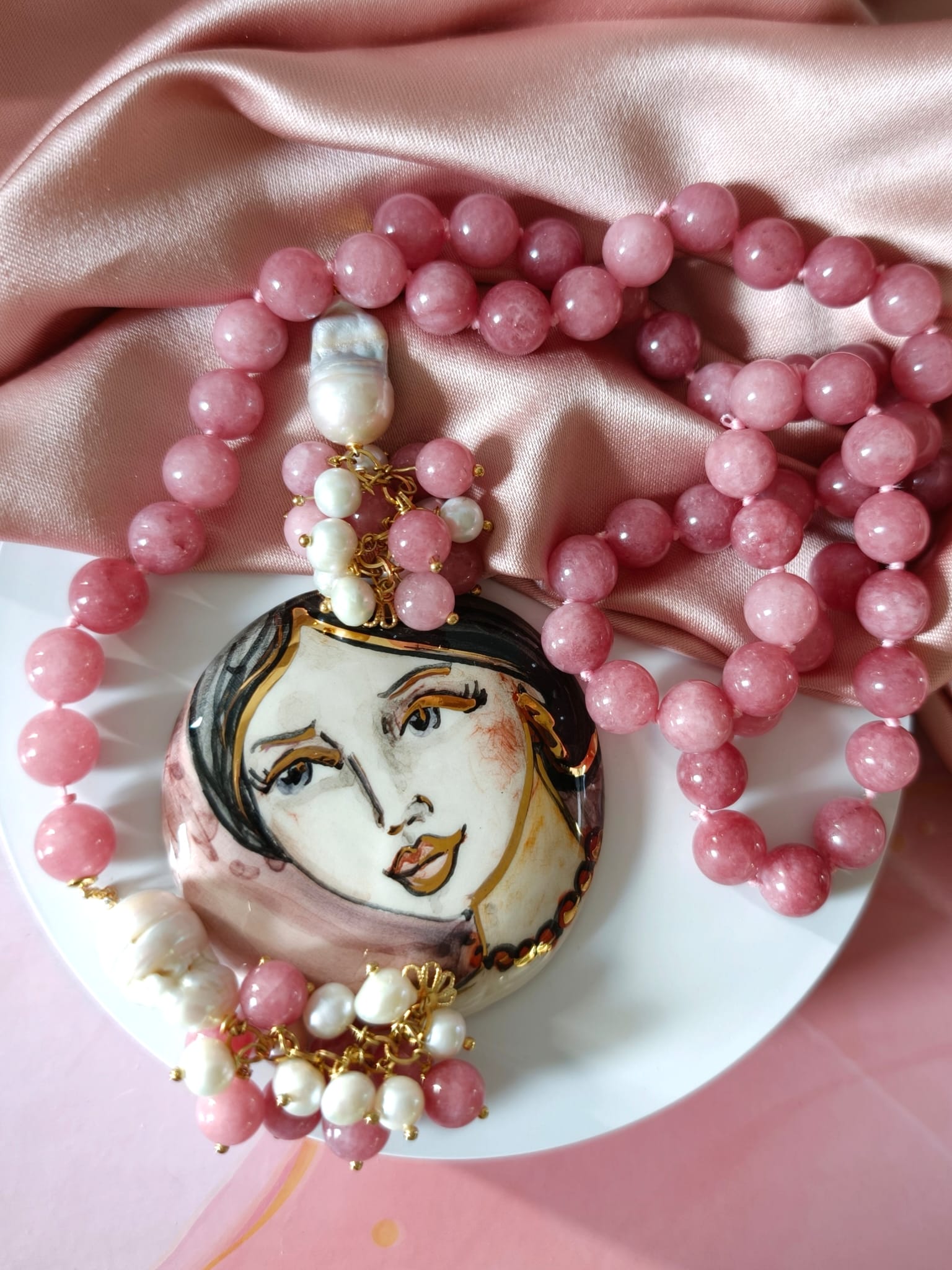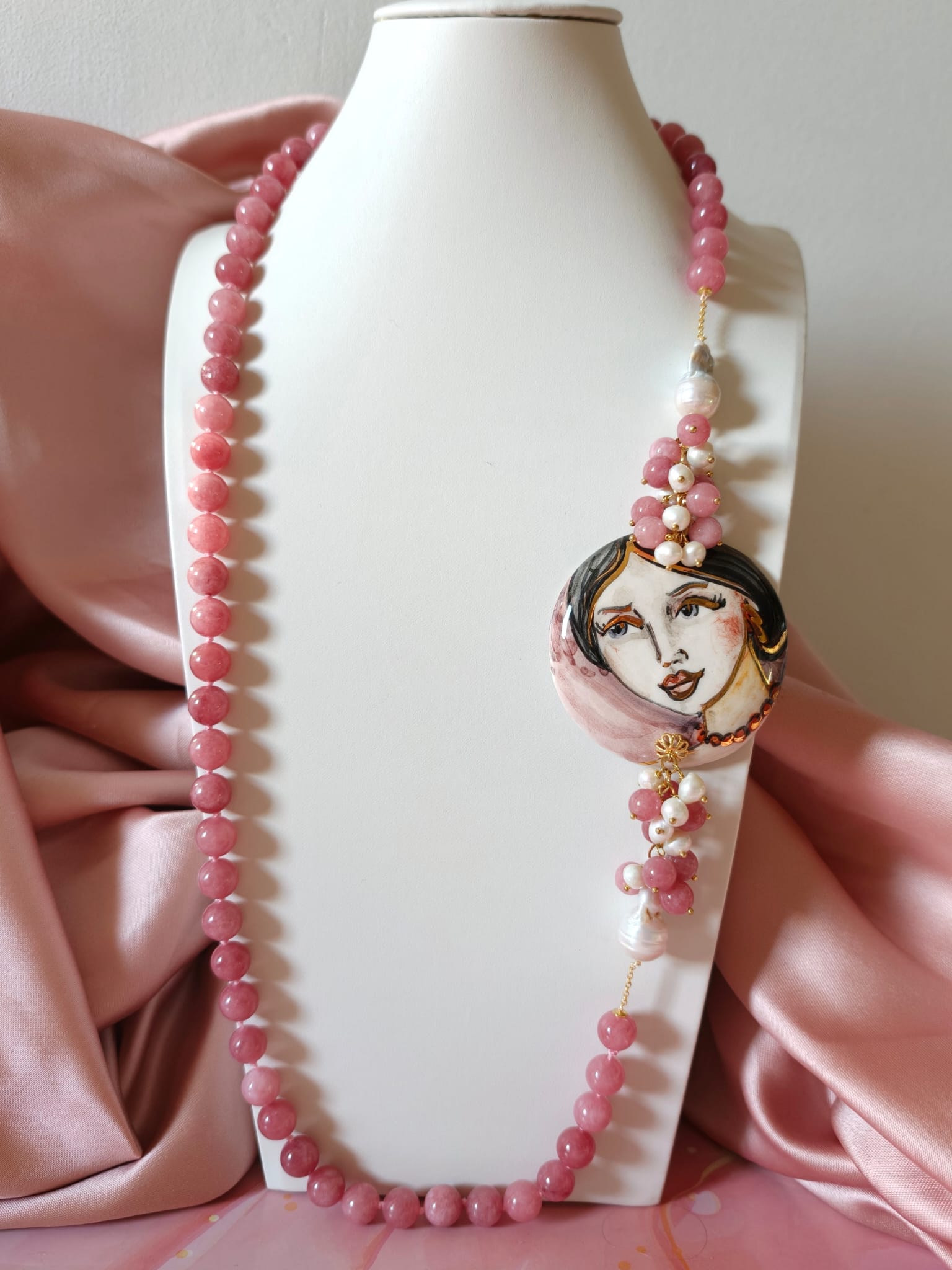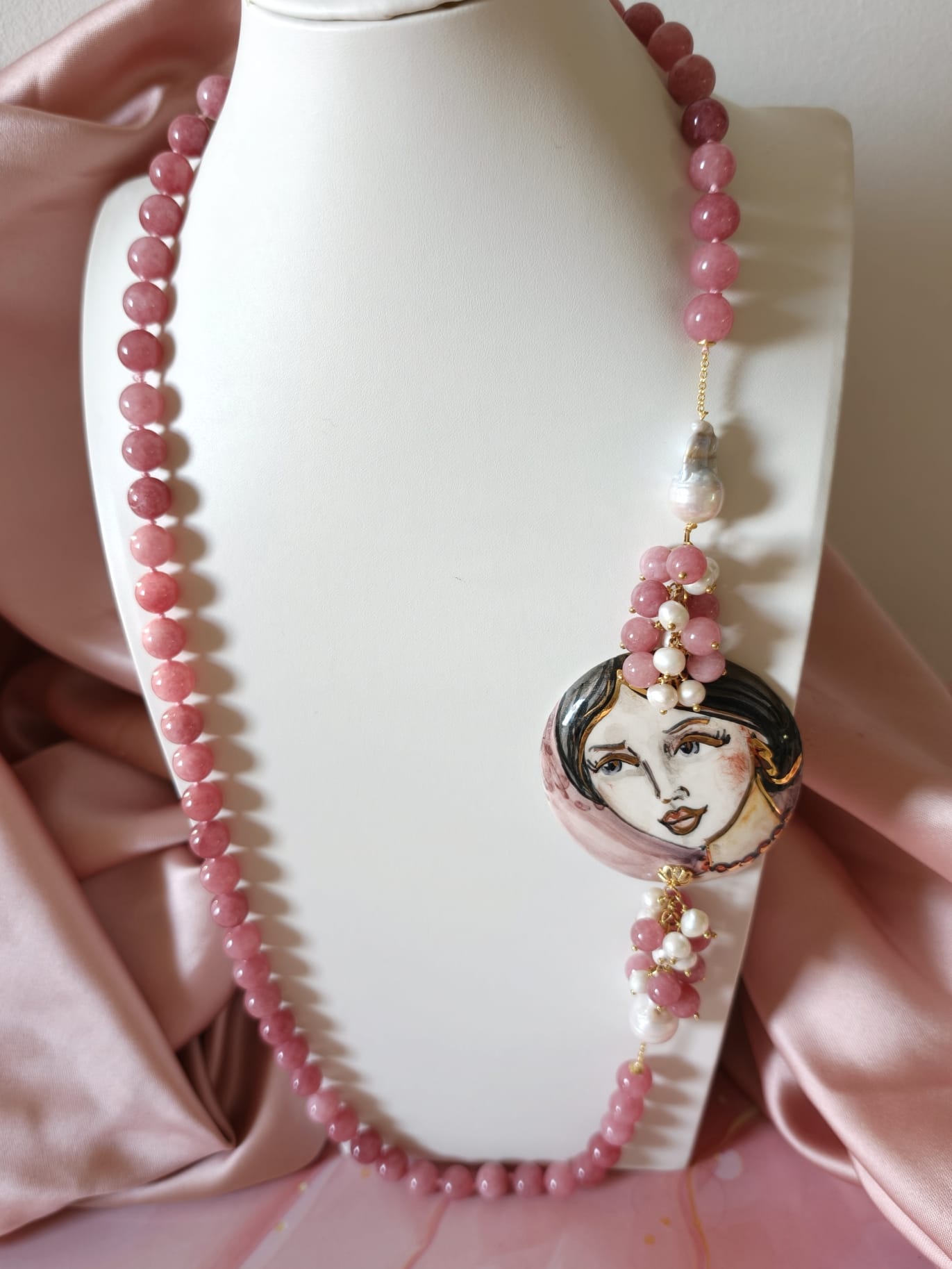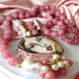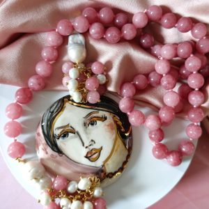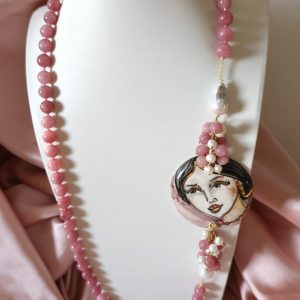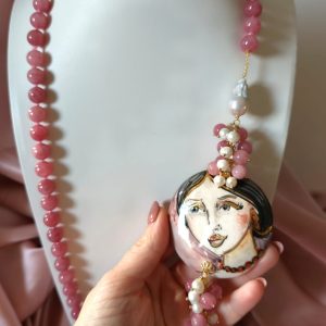 La collana giada e volto donna è un pezzo unico artigianale realizzato con giada rosa da 10 mm annodata a mano, perle barocche e un raffinato connettore in ceramica dipinto a mano. Lunga circa 83 cm, si appoggia elegantemente al seno.